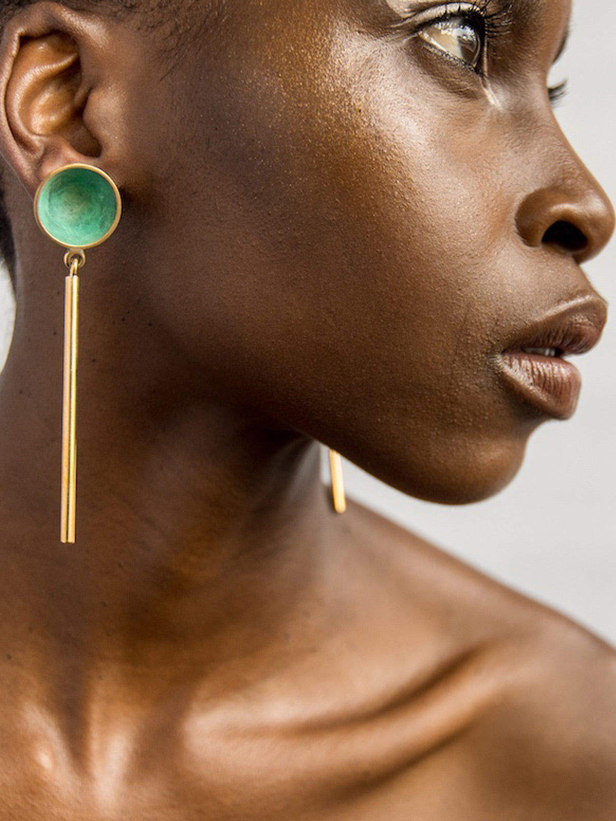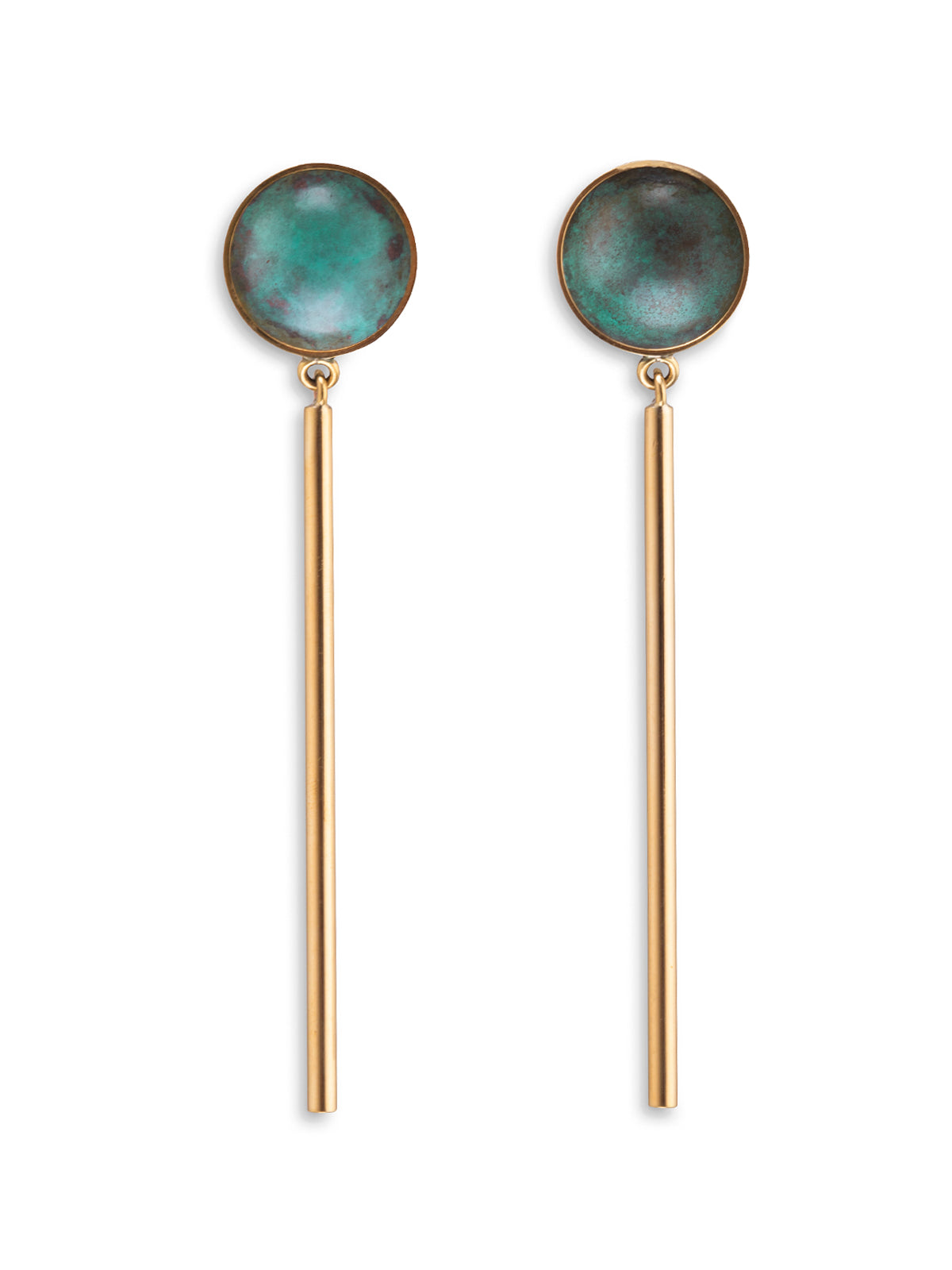 Ami Doshi Shah's artisanal jewelry is inspired by the mottled tones of verdigris. The gold-tone linear drop of these "Vessel" earrings fall from a gently domed hand-patinated stud - a color juxtaposition set to illuminate facial features.