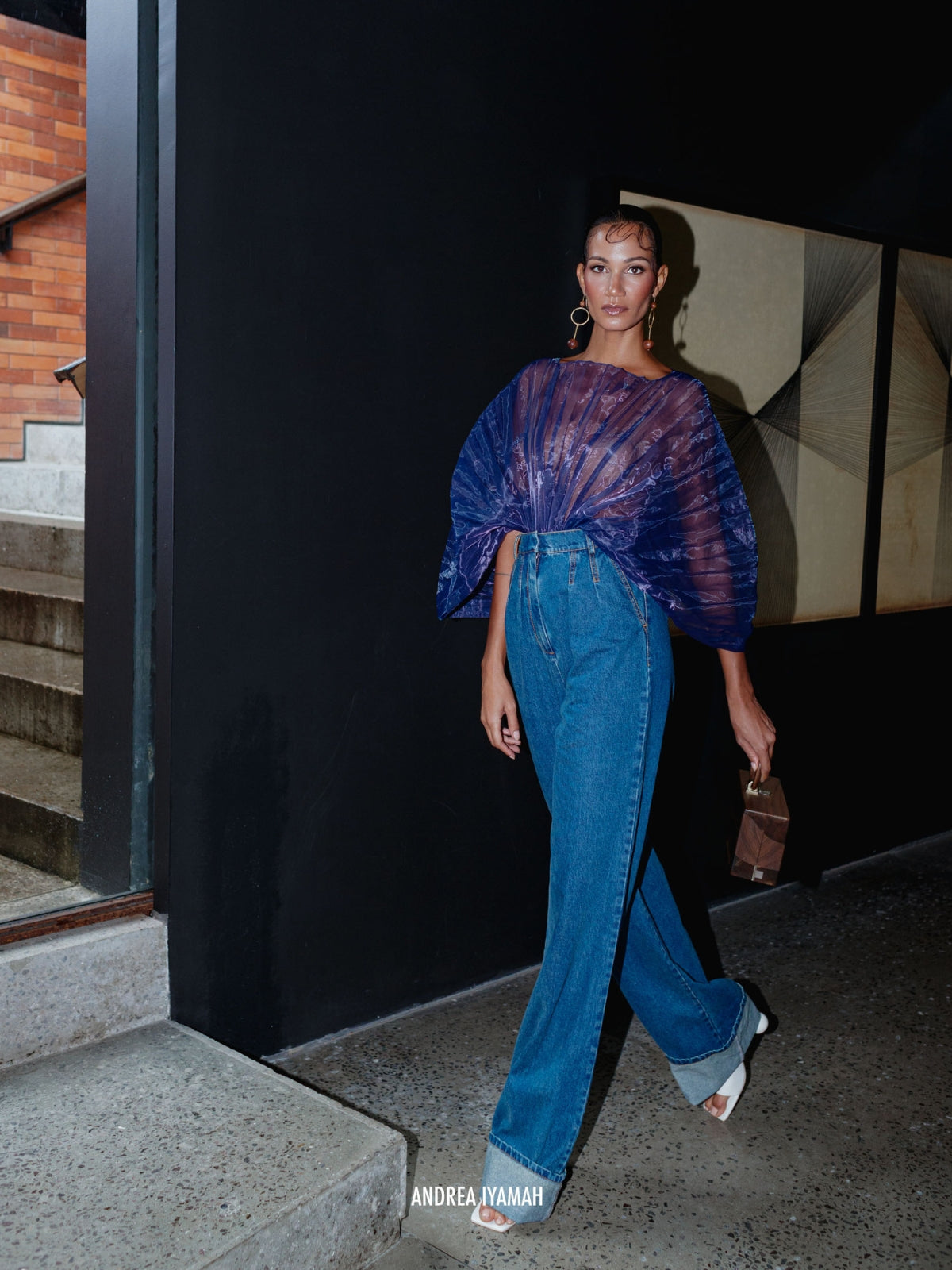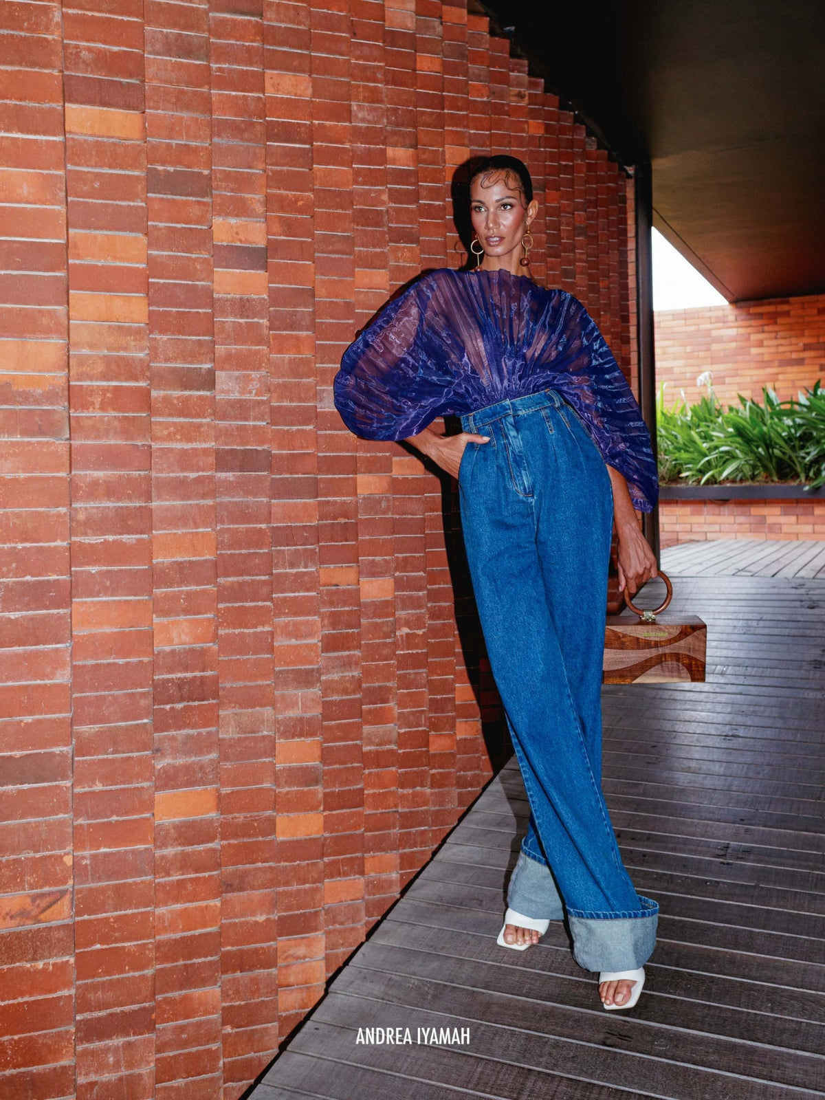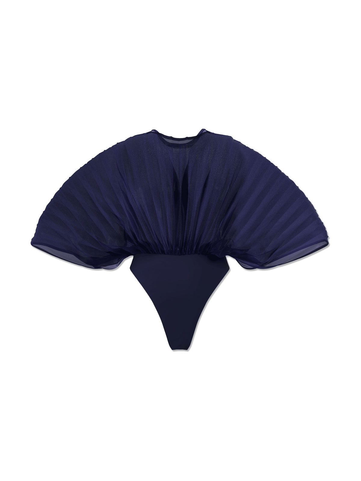 Andrea Iyamah’s signature Sombra Bodysuit is a statement piece reimagined in a deep blue hue. Crafted from airy organza, the design is defined by box pleats that drape fluidly over the shoulders, echoing the organic proportions of mushroom caps. It's complete with a knit leotard bottom with a practical snap fastening and a seamless thong at the back. Style yours with the Nevy Denim Pants from our edit.