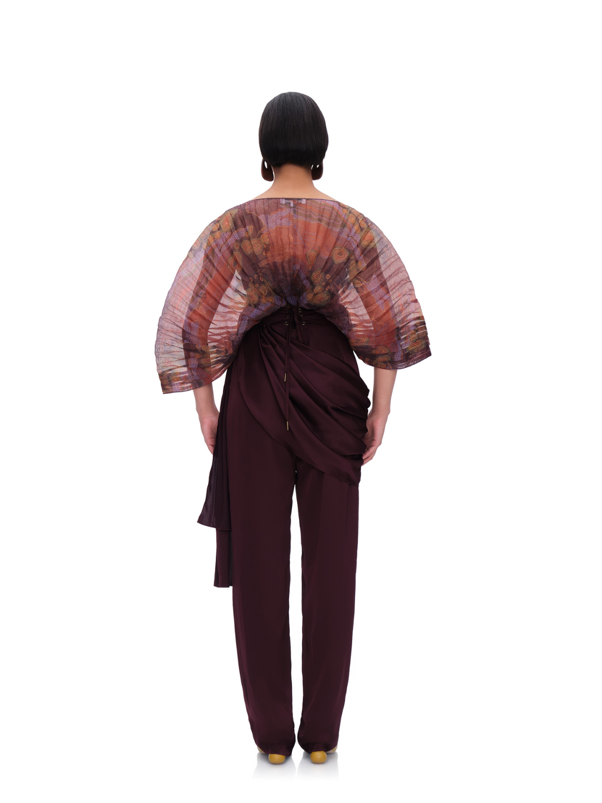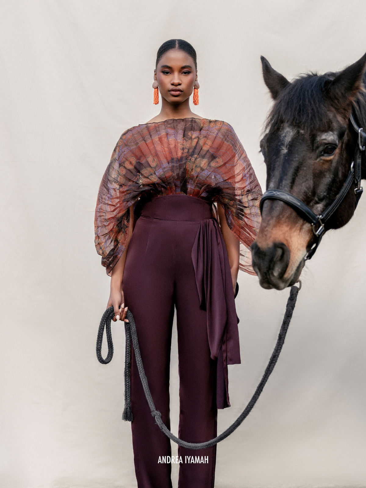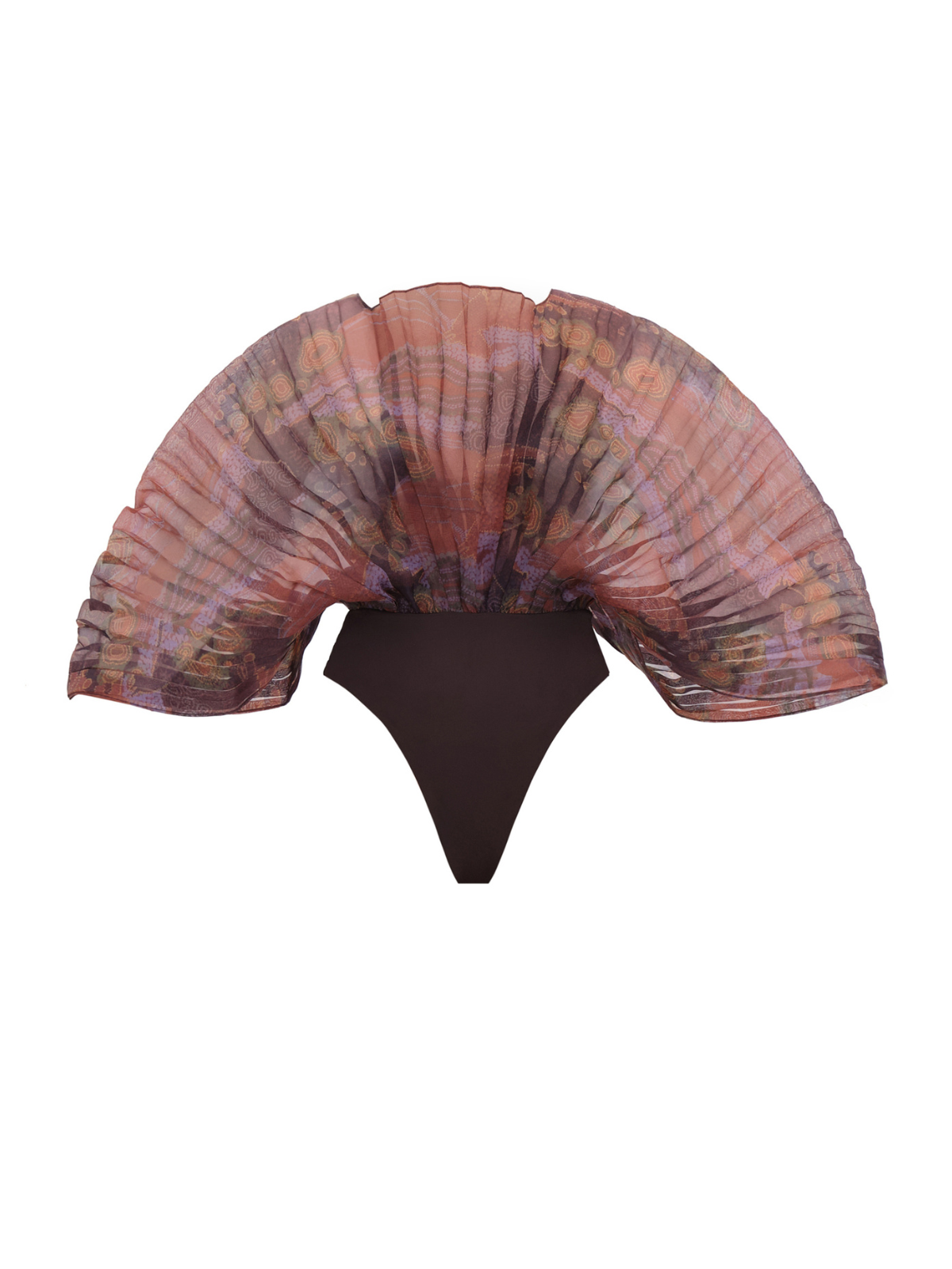An Andrea Iyamah signature design, the Sombra Bodysuit is a sculptural piece inspired by the intricate structure of mushrooms. Crafted in a rich burgundy hue with geometric patterns, it has a voluminous pleated organza top and an elasticated knitted base made to be invisible under tight-fitting styles. Pair yours with the label's Loti Drape Pants for a statement evening look.