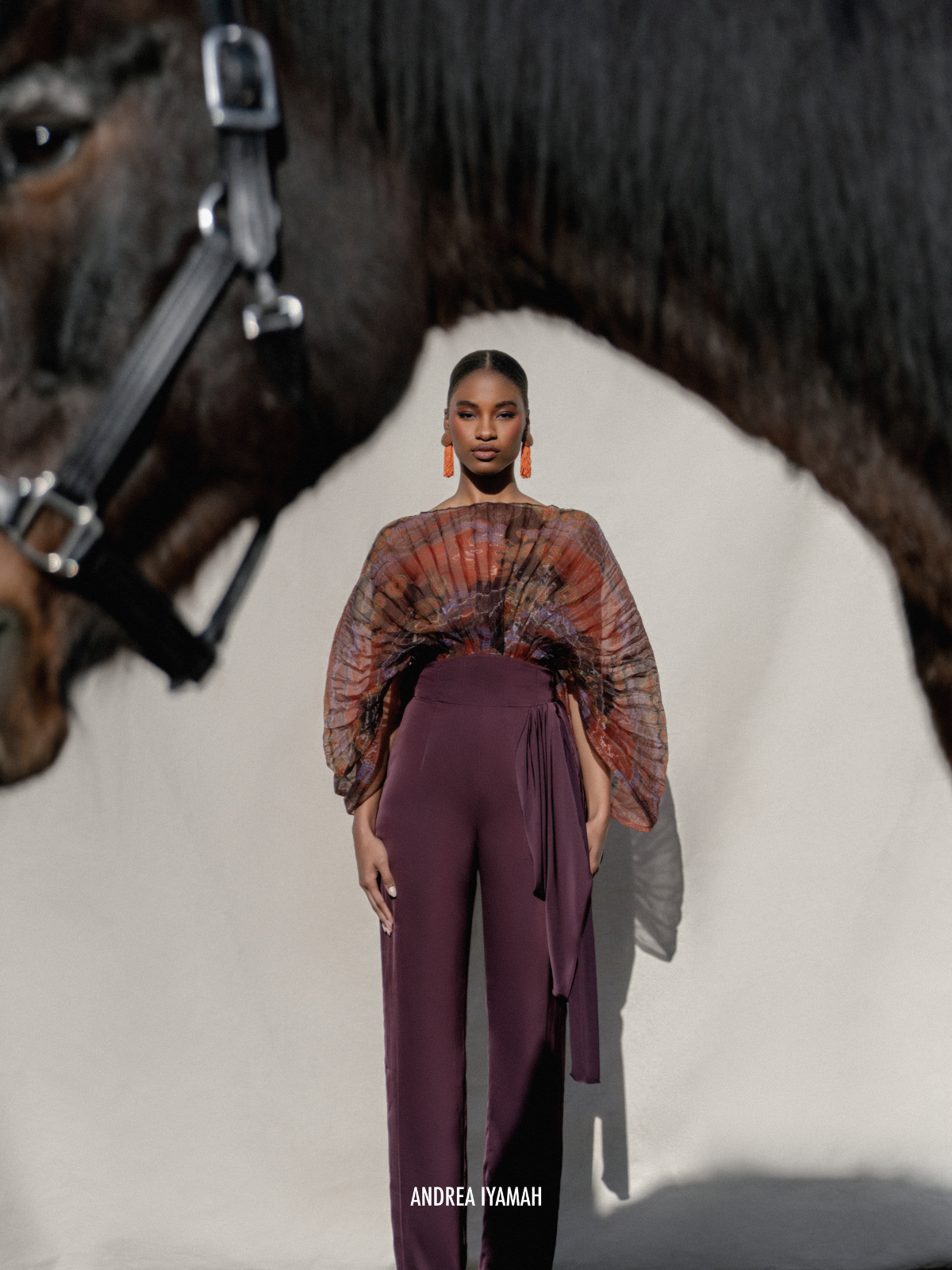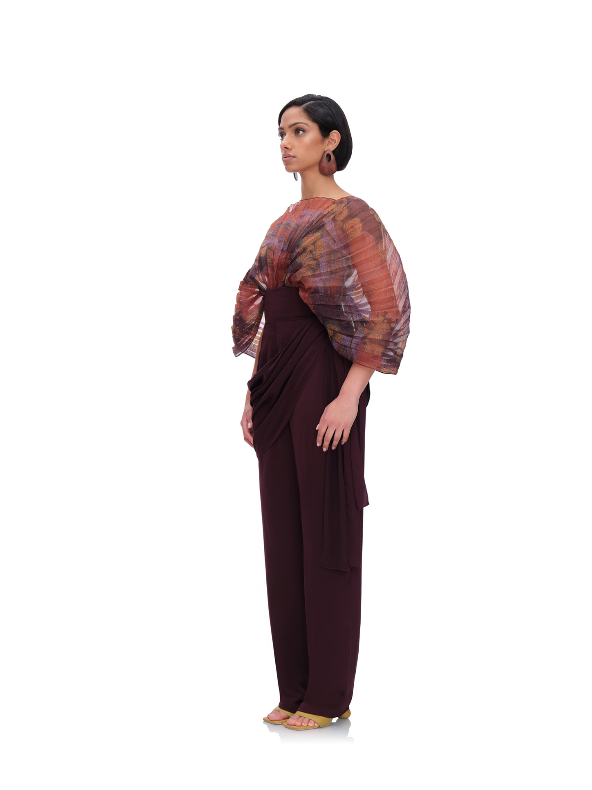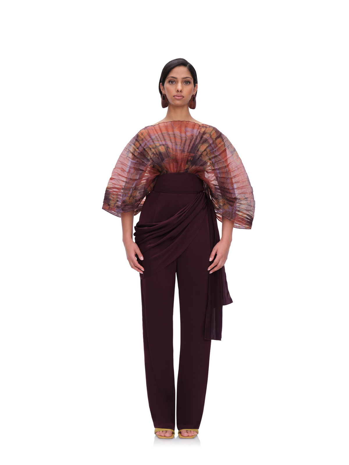 An Andrea Iyamah signature design, the Sombra Bodysuit is a sculptural piece inspired by the intricate structure of mushrooms. Crafted in a rich burgundy hue with geometric patterns, it has a voluminous pleated organza top and an elasticated knitted base made to be invisible under tight-fitting styles. Pair yours with the label's Loti Drape Pants for a statement evening look.