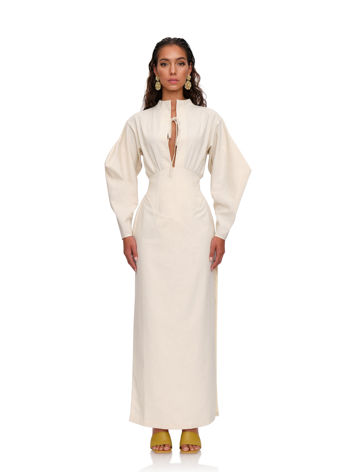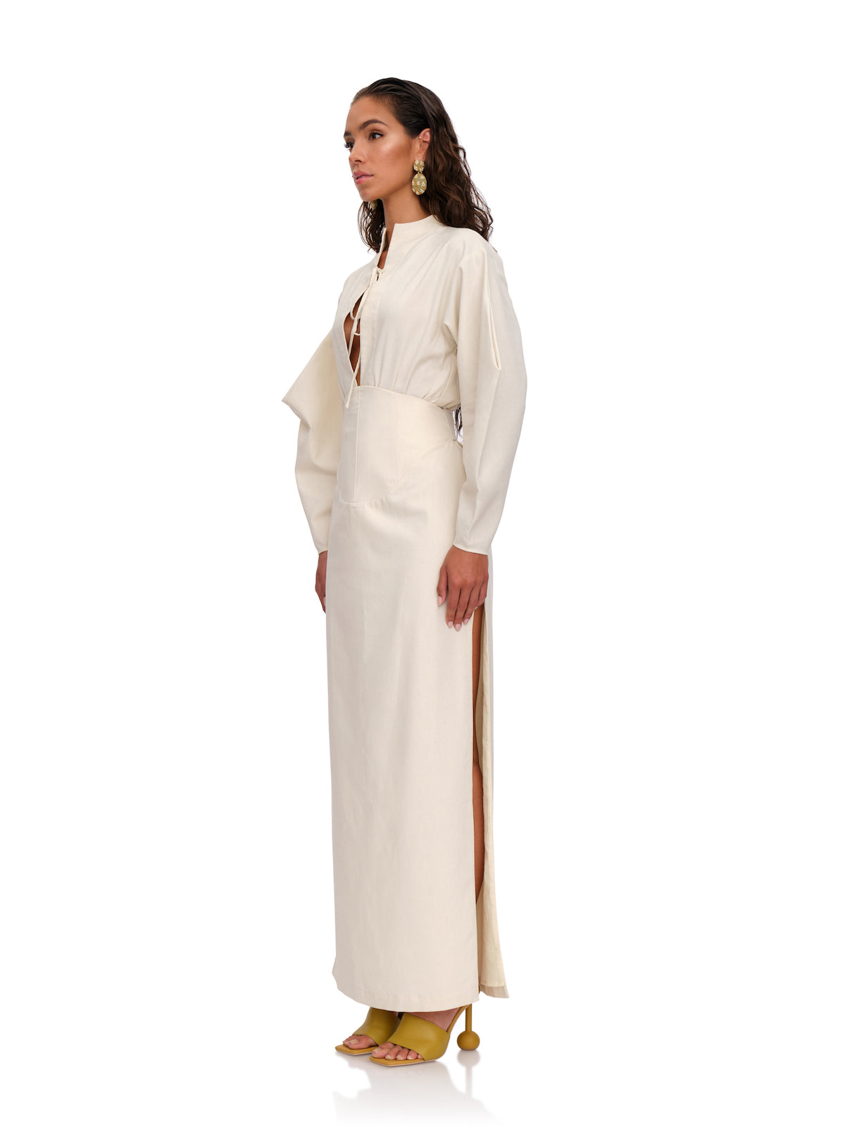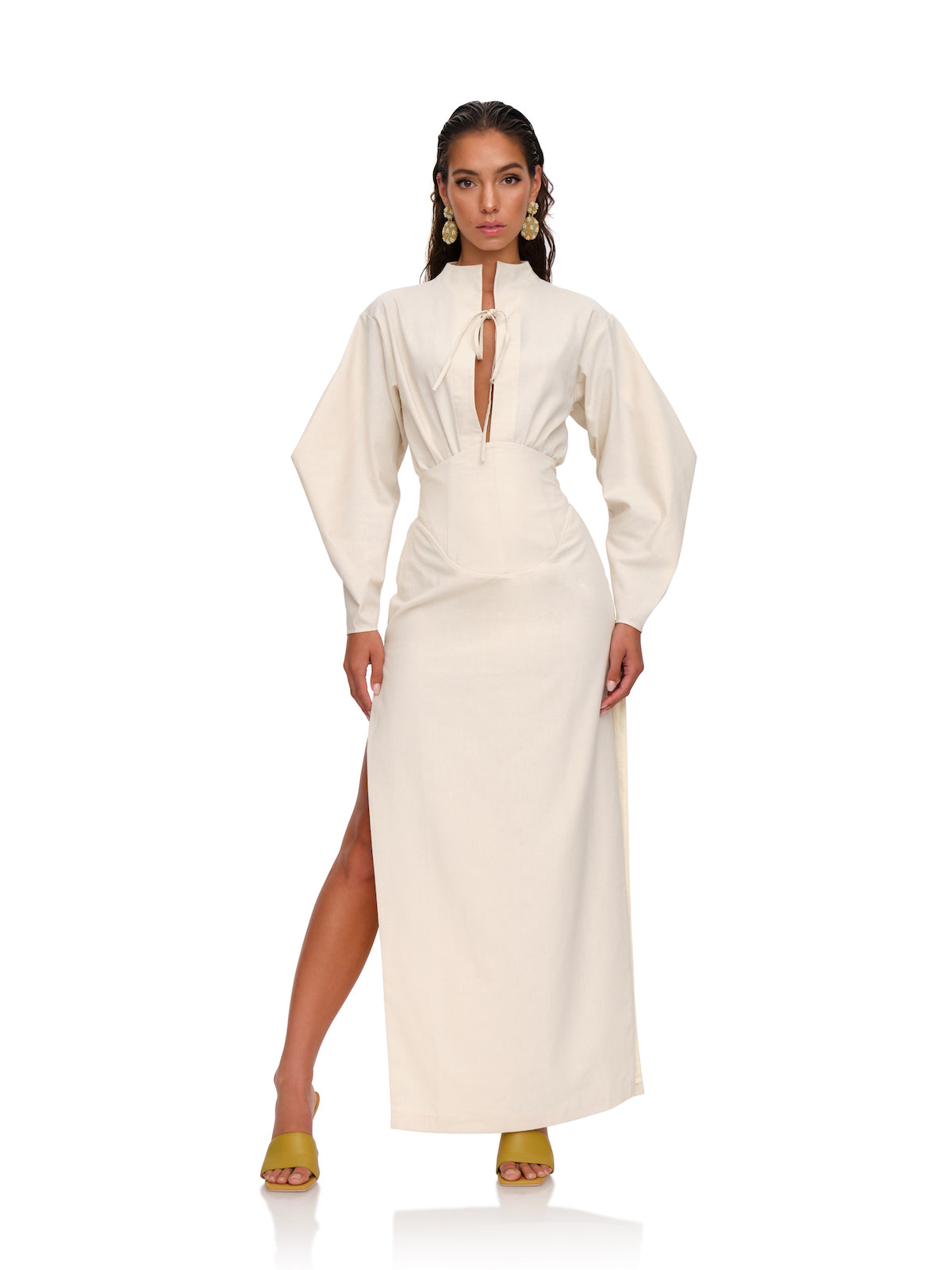 - Shaped waistband corset, high side slits, invisible zipper at center back, ankle length
