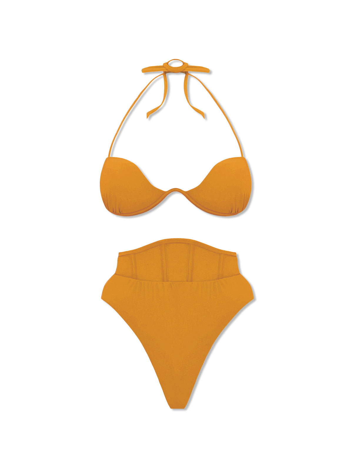 Andrea Iyamah’s Gura Bikini draws inspiration from the vibrant colors and patterns of Nigerian attire. This top is infused with the designer’s recognizable sculptural flair, crafted with a 'W' underwire for added support. The matching Mustard Gura Bikini Bottom features the label's signature high-rise design with soft boning that sculpts your figure. Wear your set for lounging by the pool.