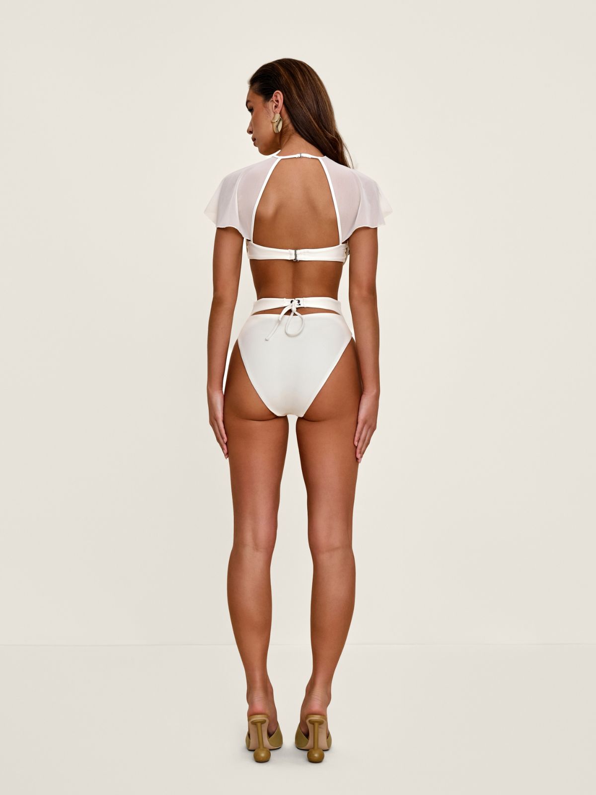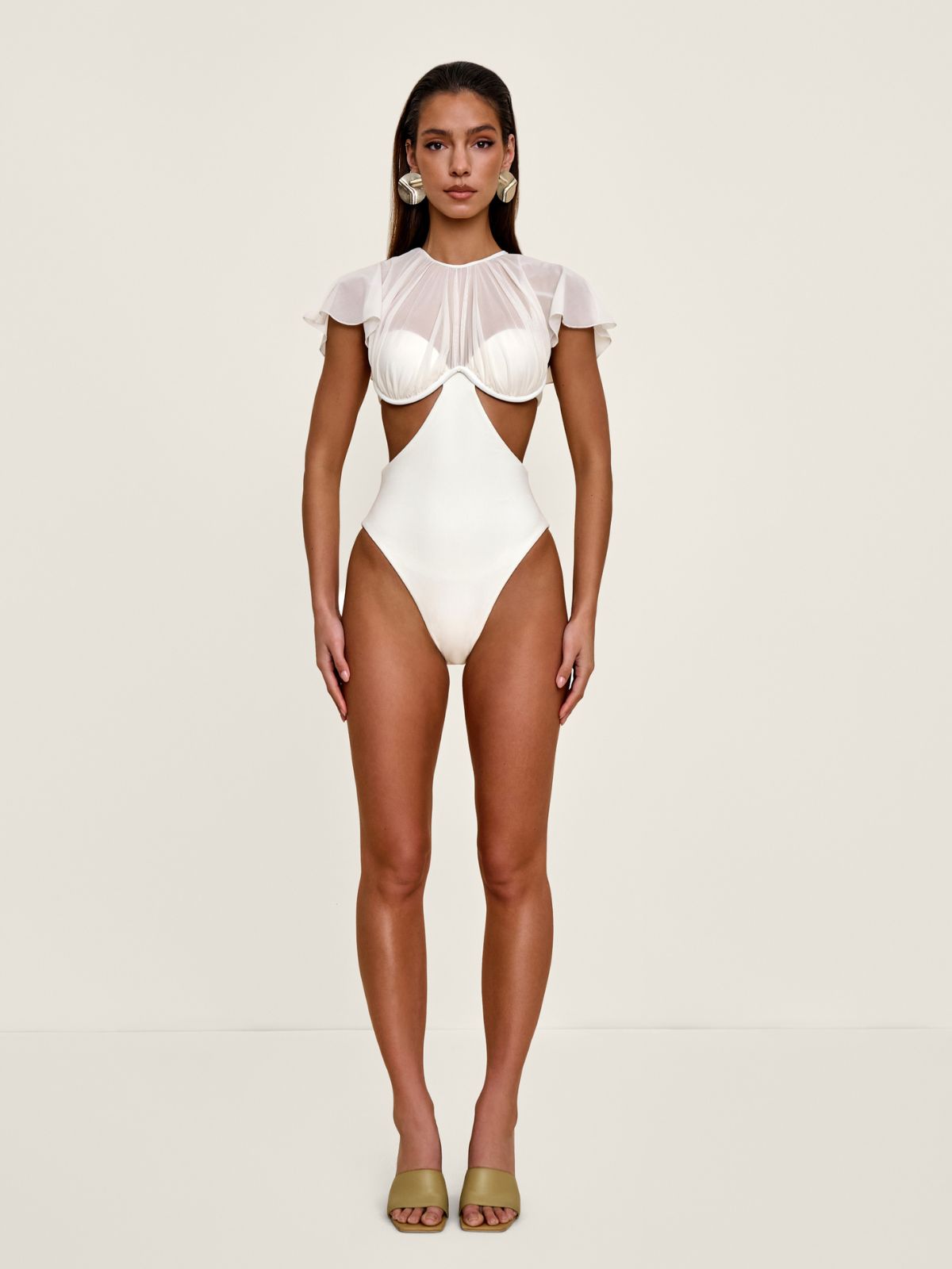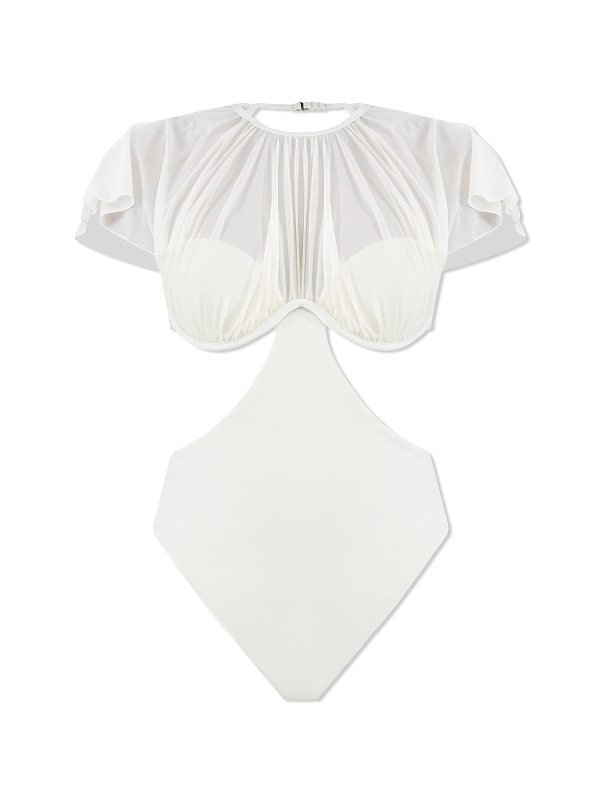 Inspired by travel, Andrea Iyamah creates retro classic silhouettes with a contemporary edge. The Naru Swimsuit boasts an intricate design featuring a W underwire for a flattering, supportive fit and molded cups for additional shape. The delicate sheer mesh cape drapes beautifully over the shoulders, adding an ethereal, flowing touch. Wear yours with your favorite sunglasses while lounging poolside.