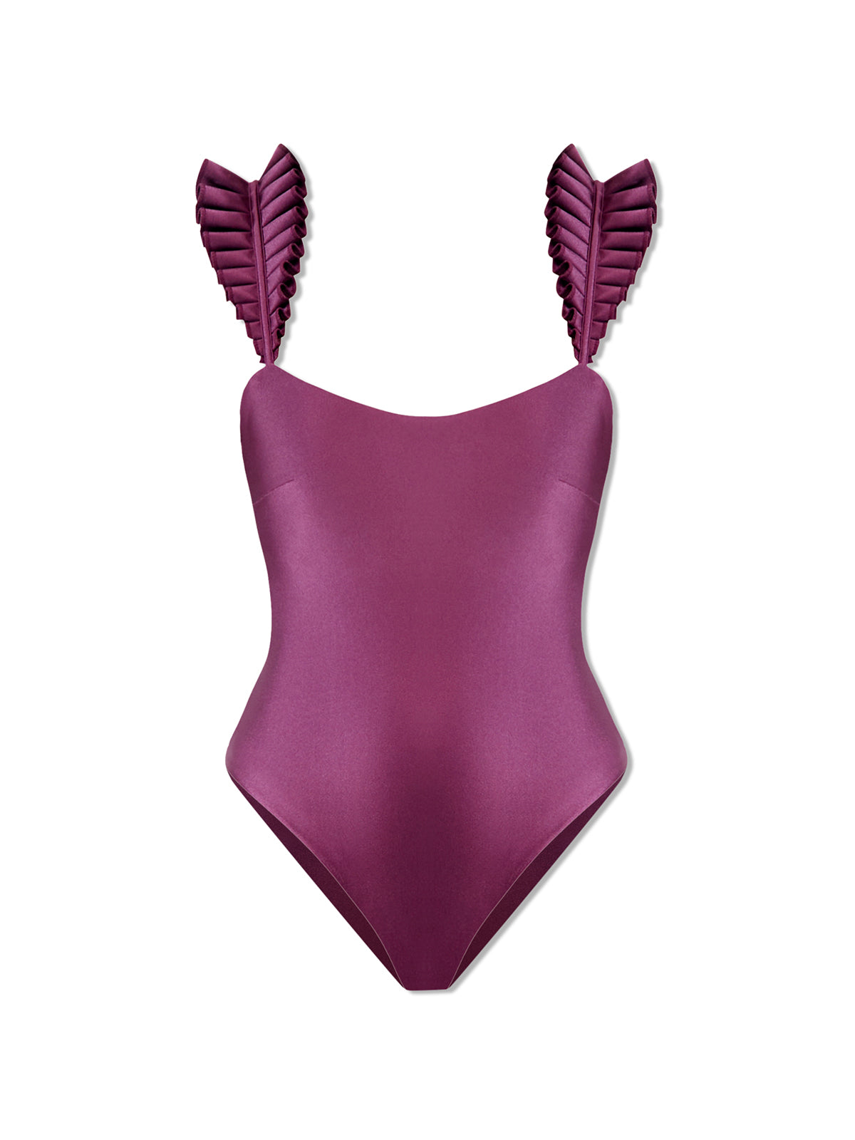 The shoulder ruffles on Andrea Iyamah's Tisi Swimsuit were designed to emulate the beauty of the garden of Eden in a nod to Eve's search to cover her nudity with leaves. Made from supportive stretch fabric in a deep eggplant color, the classic style features a high-cut leg to elongate the figure and a built-in shelf bra for support. Wear yours to the beach or under a cover-up at a pool party.