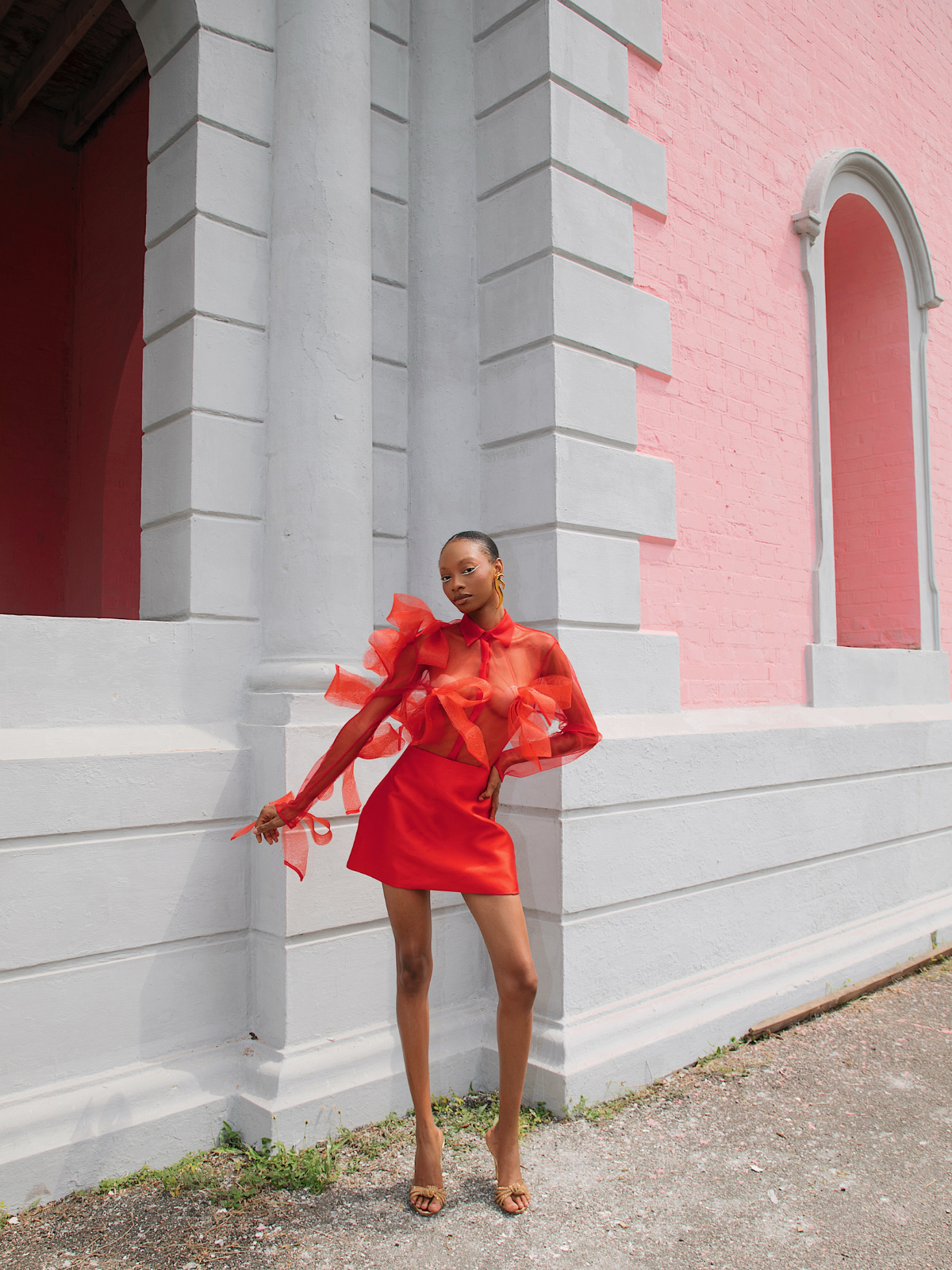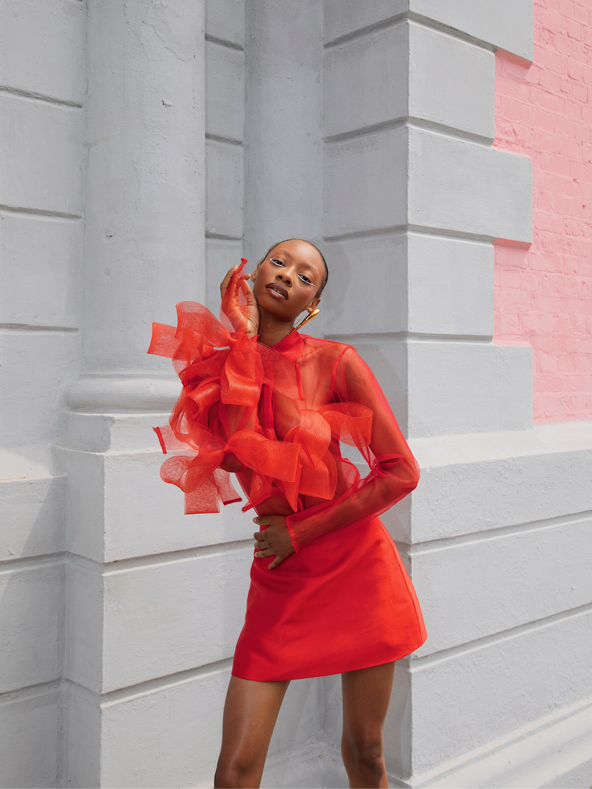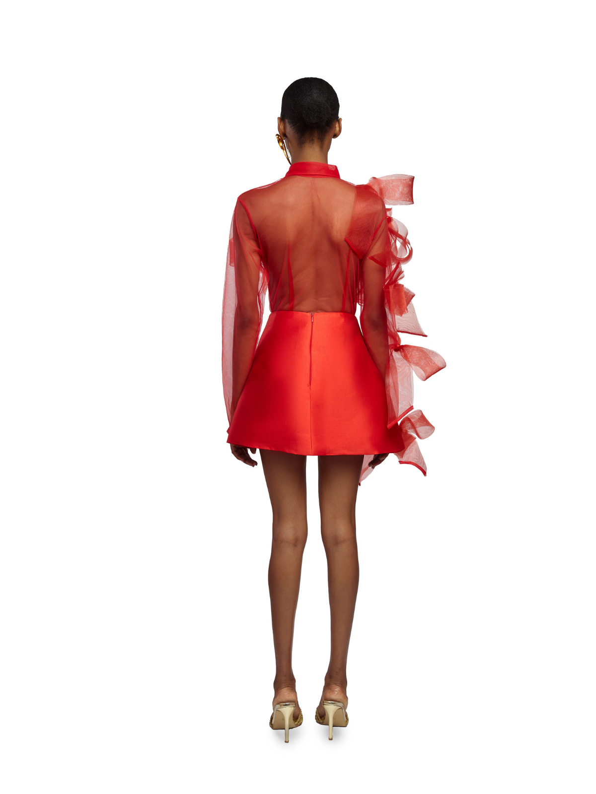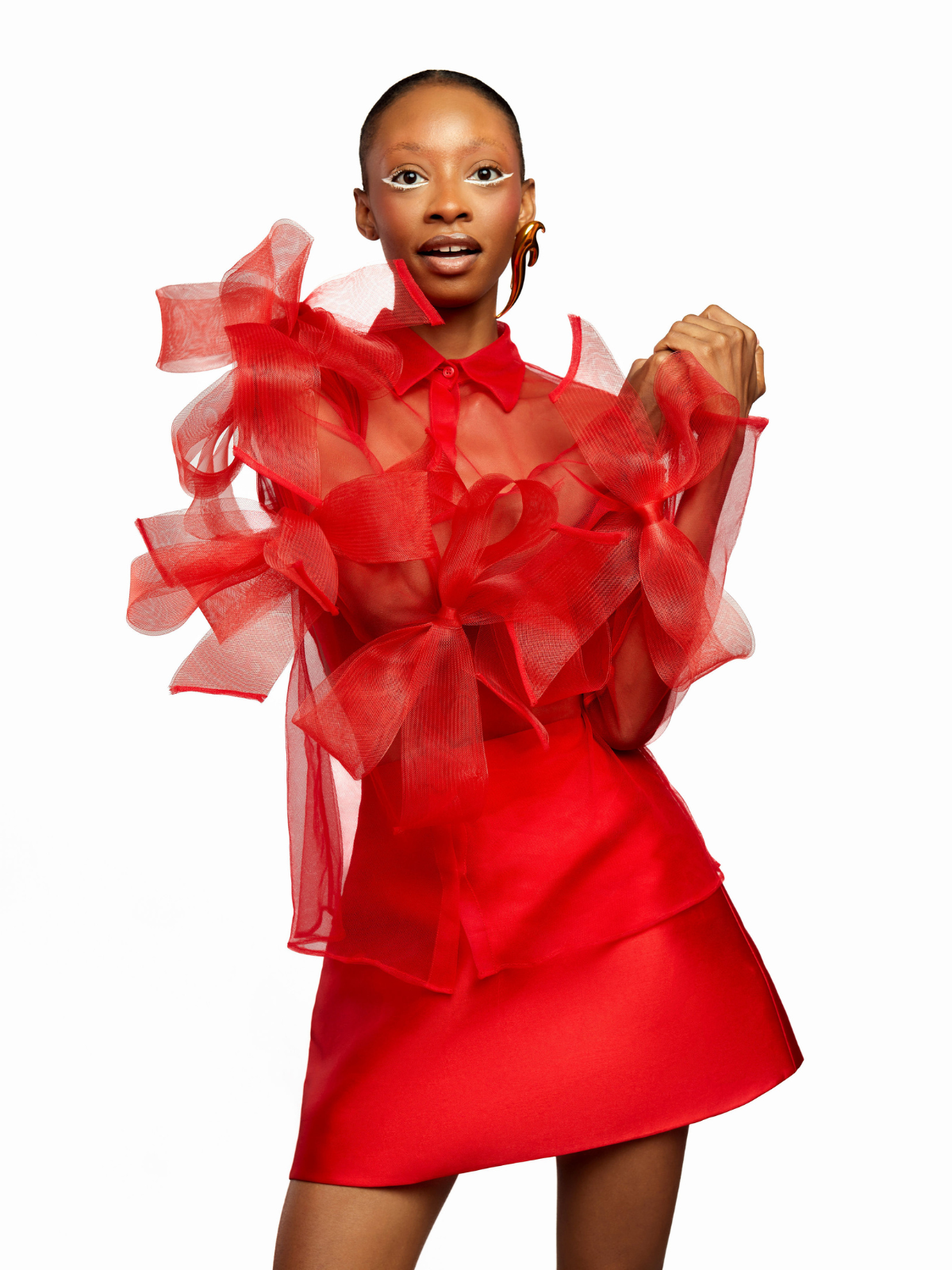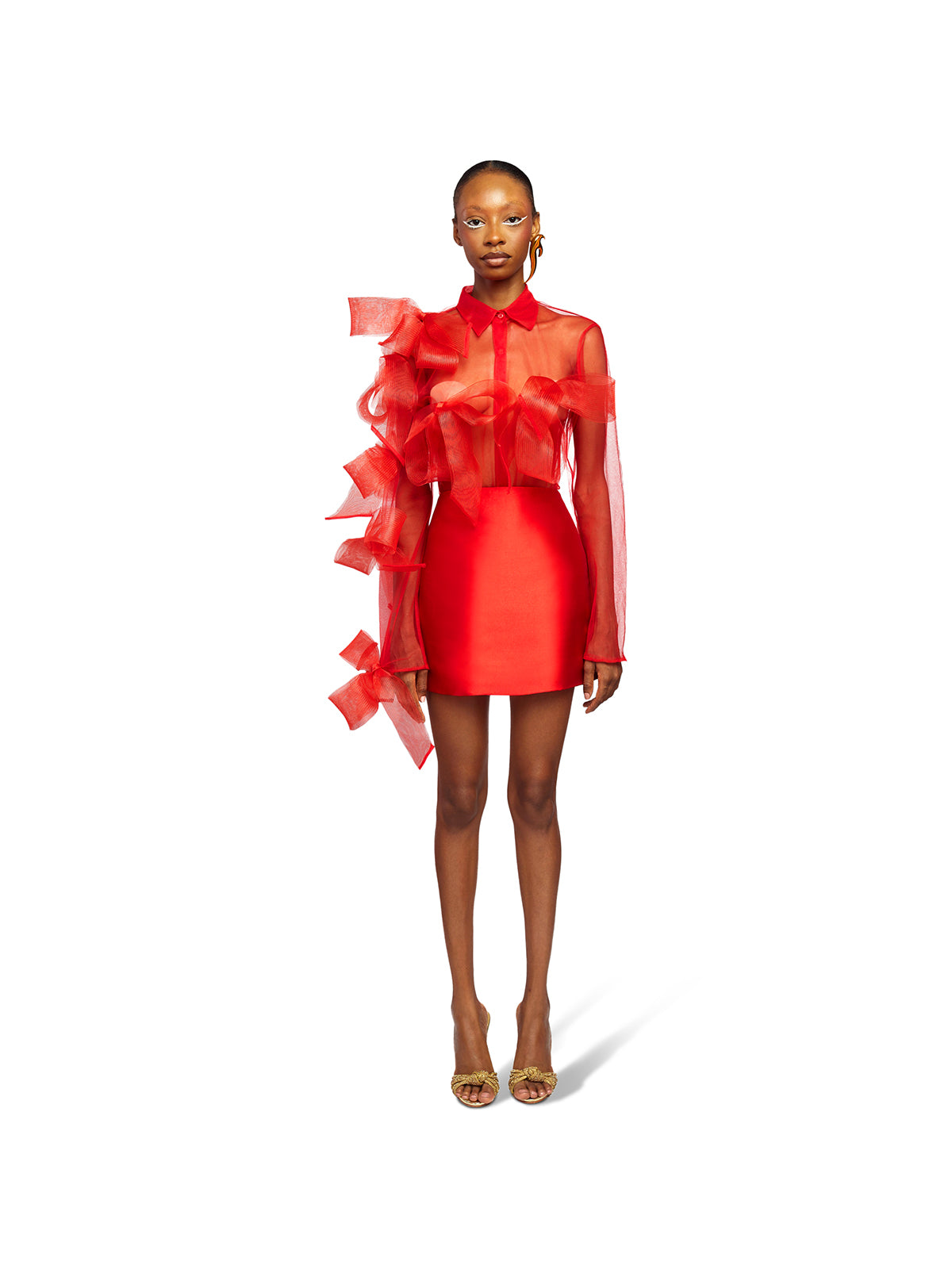 Frank Aghuno crafts elegant silhouettes from sumptuous fabrics to challenge societal notions of how Nigerian women are expected to dress. This dramatic shirt and skirt set is cut from smooth tulle and embellished with oversized crinoline bows on the transparent top. The mini skirt boasts a form-fitting silhouette with a refined minimalist construction. Wear yours to evening events where making an entrance is a must.