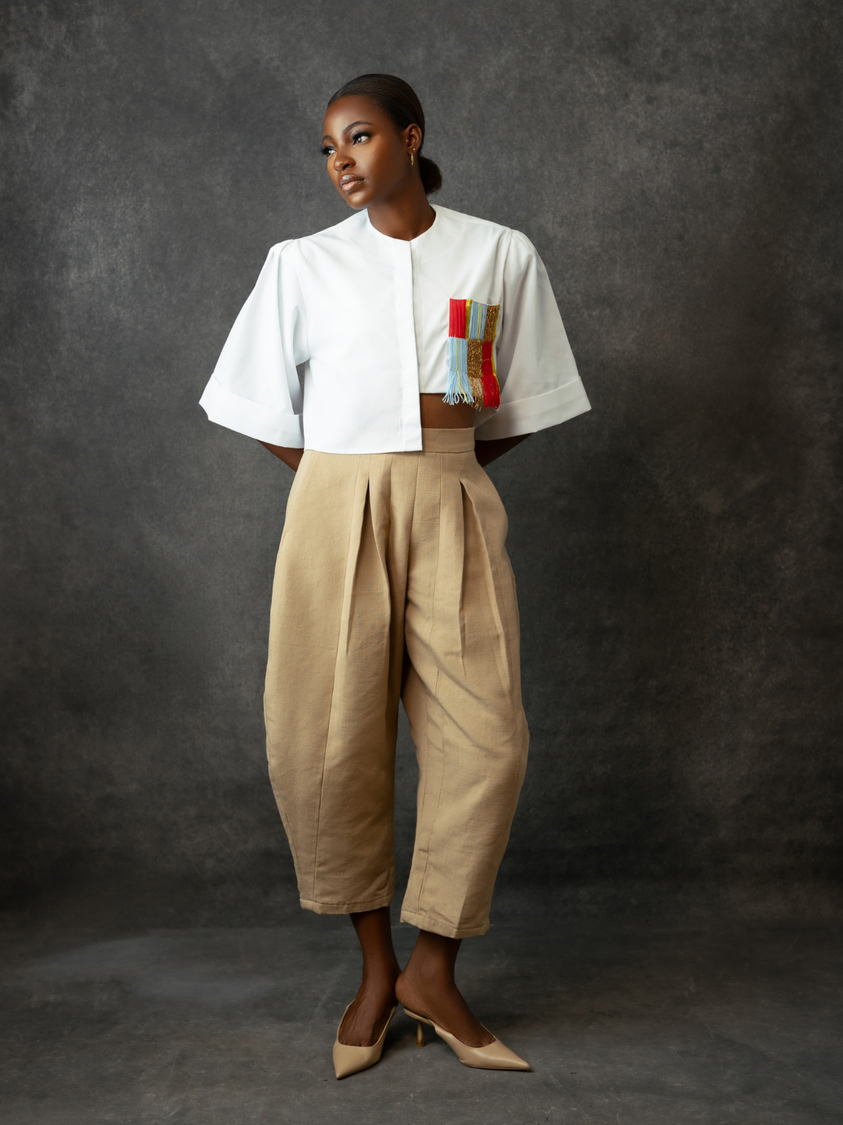 Babayo’s Balloon Pants are named after their exaggerated barrel legs that curve at the sides. They’re cut from hand-woven Aso Oke cotton and tailored to a relaxed, high-waisted profile that hits just right above the ankle. The fitted waistband and pleated detailing enhance the dramatic shape, while the versatile sand shade means they’re incredibly versatile when it comes to styling. Style yours with the label's matching Embroidered Crop Top.