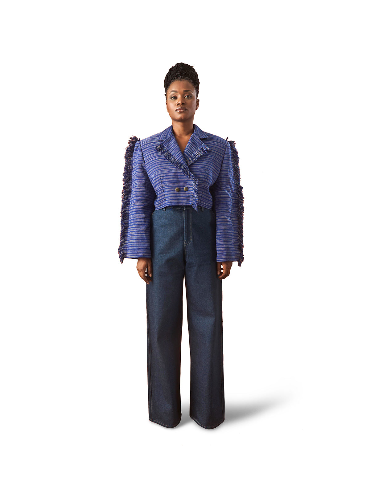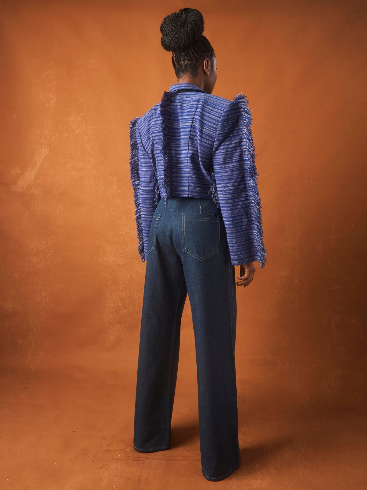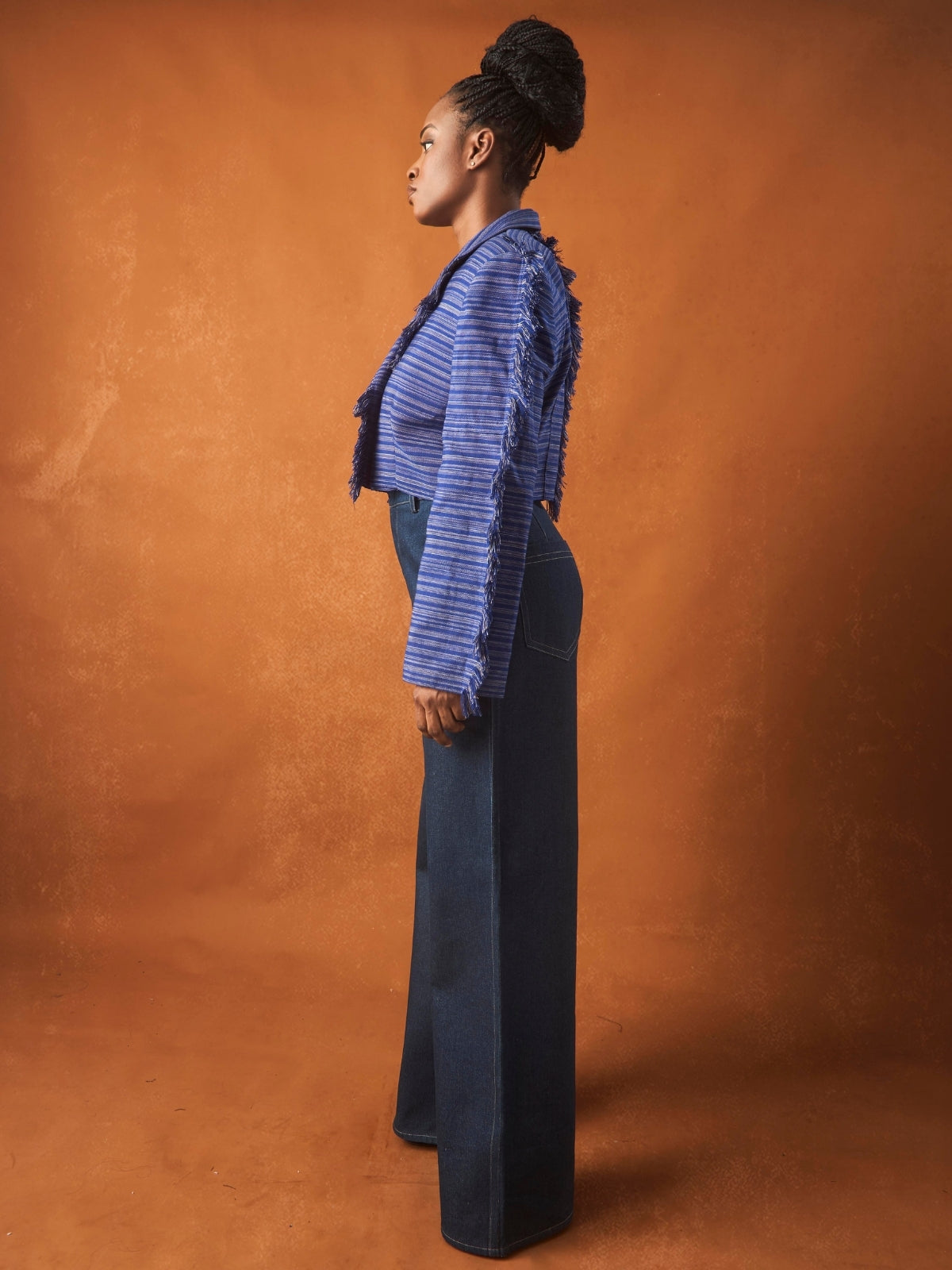 Boyedoe’s Busumuru Waistline Jacket is a striking expression of the brand’s bold spirit of conscious craftsmanship and modern design. Handmade in Accra, the style is crafted from a soft blend of cotton and silk. It's detailed with distinctive fraying for texture and falls to a cropped length. Subtle imperfections are a nod to the traditional techniques employed by the skilled makers. Wear it with high-waisted Wafaa Pants and chunky heels.