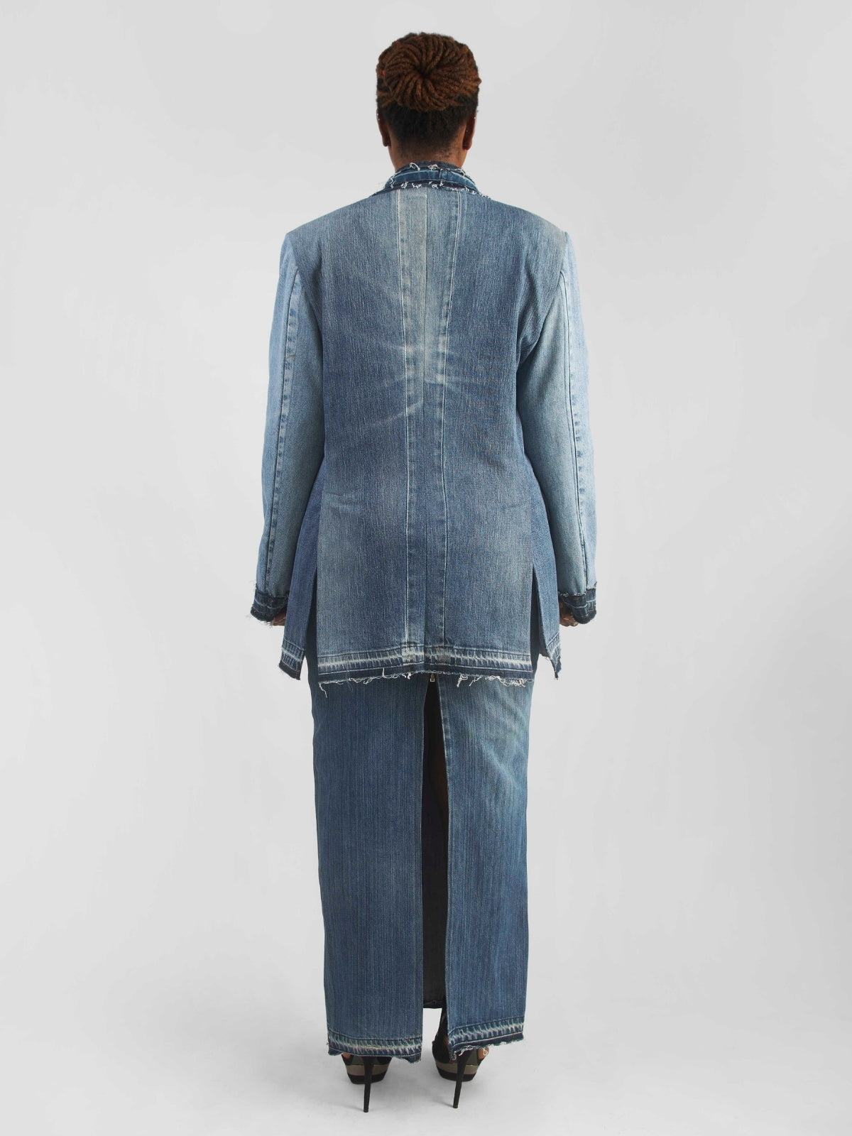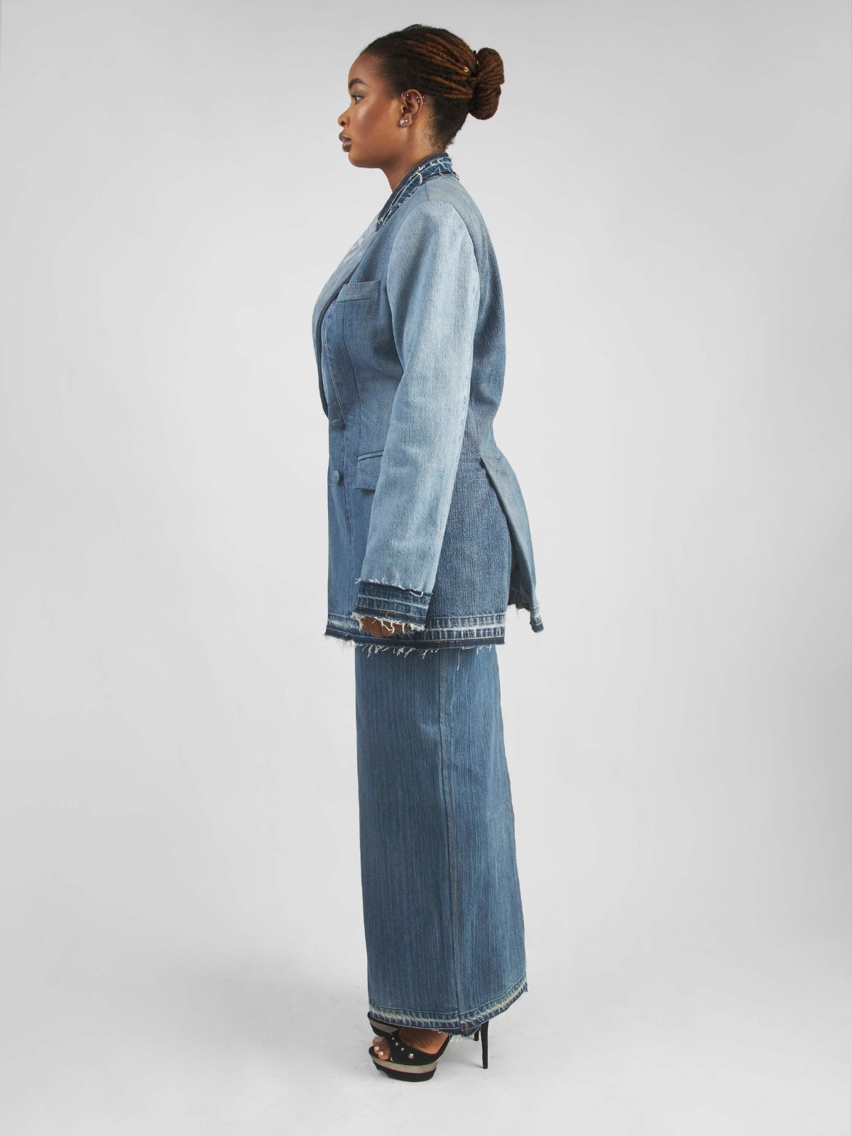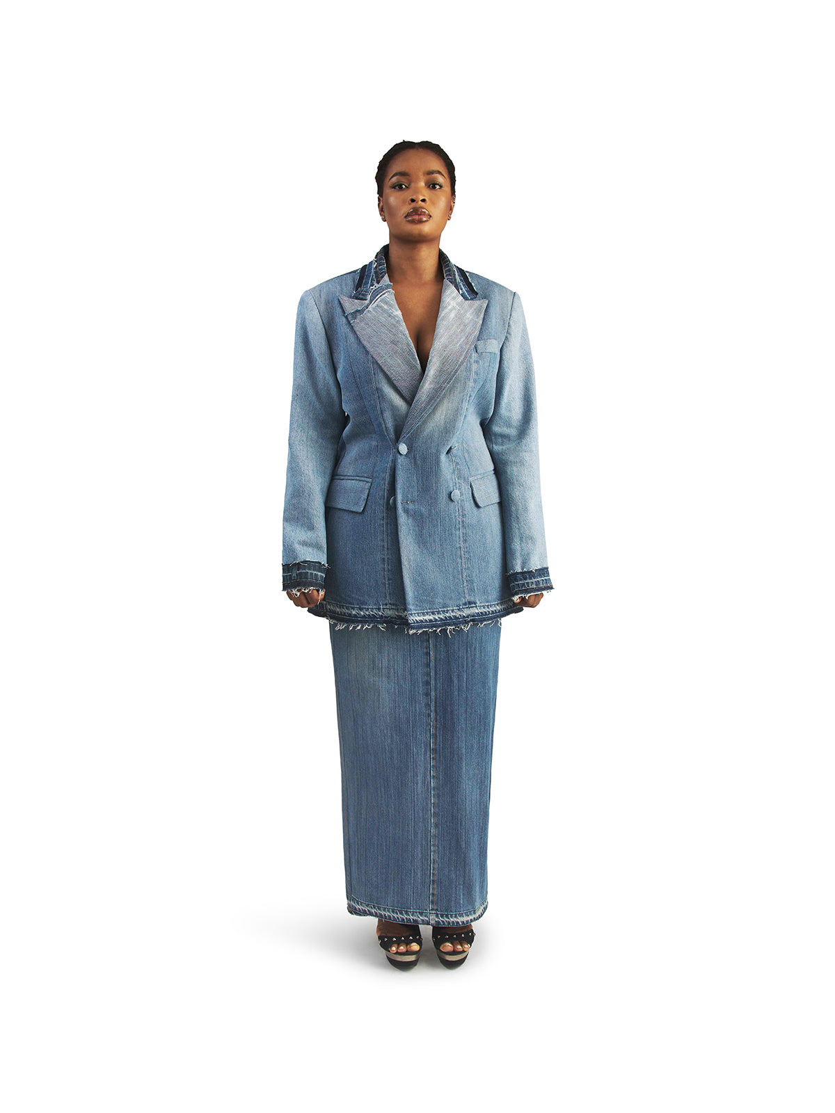 At the intersection of craft, culture, and contemporary elegance, the Odeneho II Jacket by Ghanaian brand Boyedoe is made from recycled cotton denim and hand-woven Akwete panels. The double-breasted silhouette features peak lapels, four-button closures, and raw-edged cuffs—seamlessly styled with the matching Odeneho II Skirt from the collection.