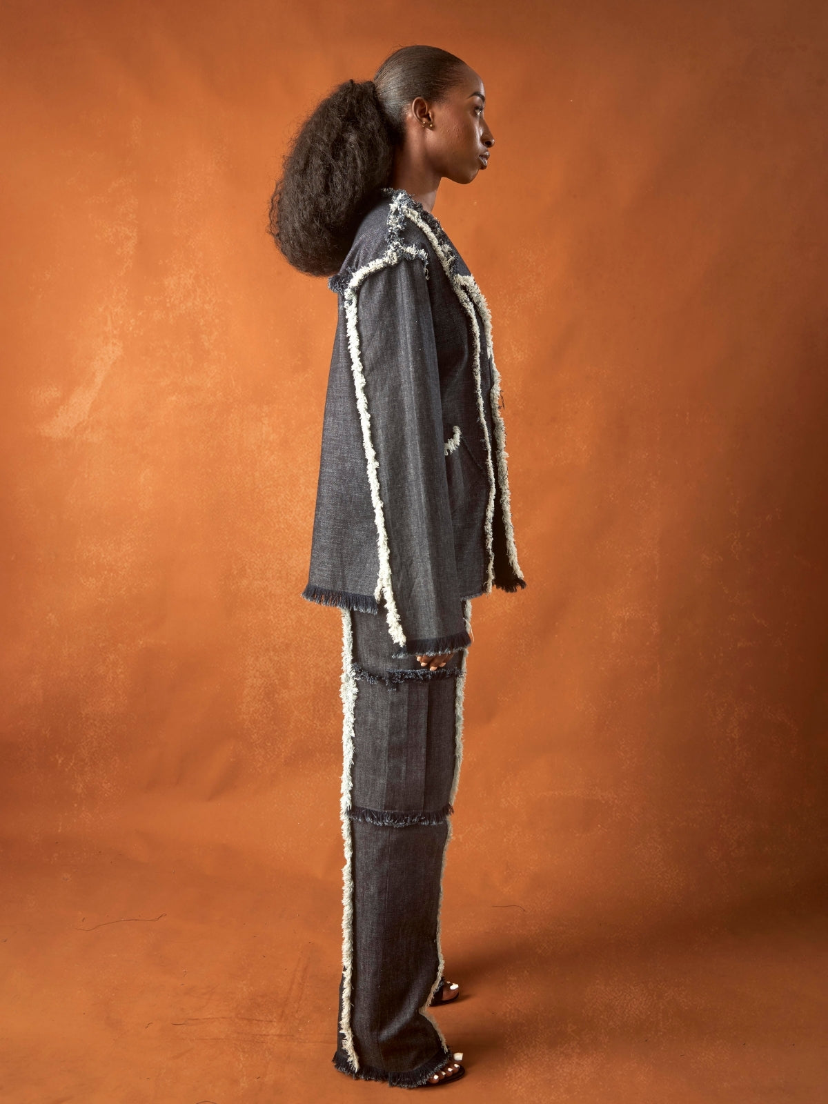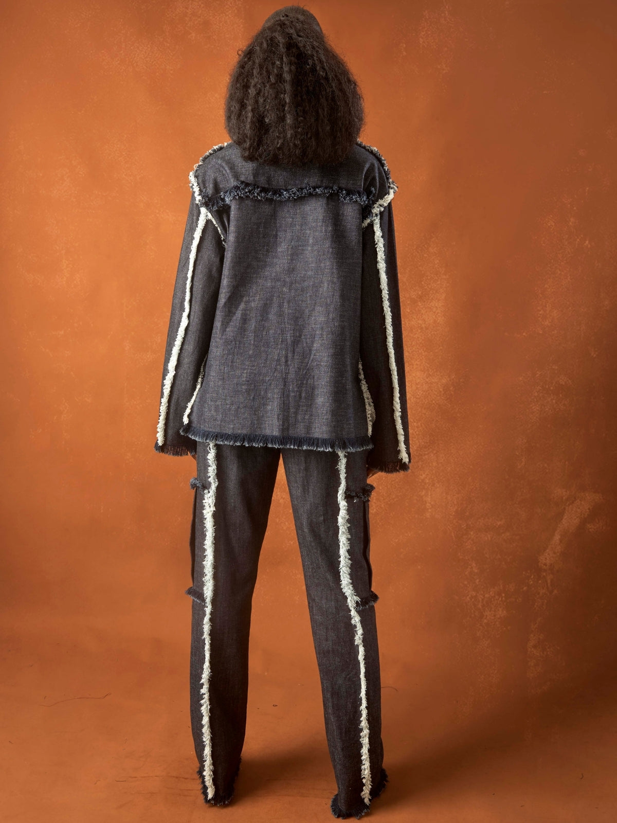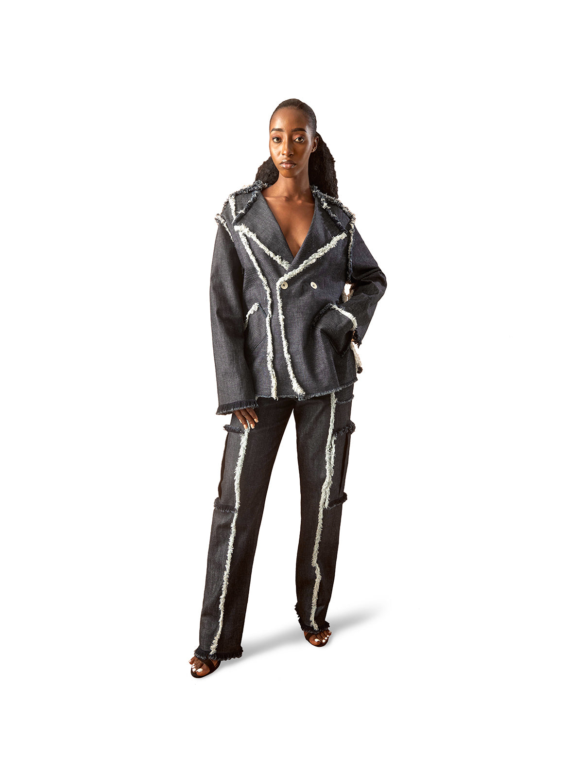 - Handmade detailing, raw edges, straight leg, full length