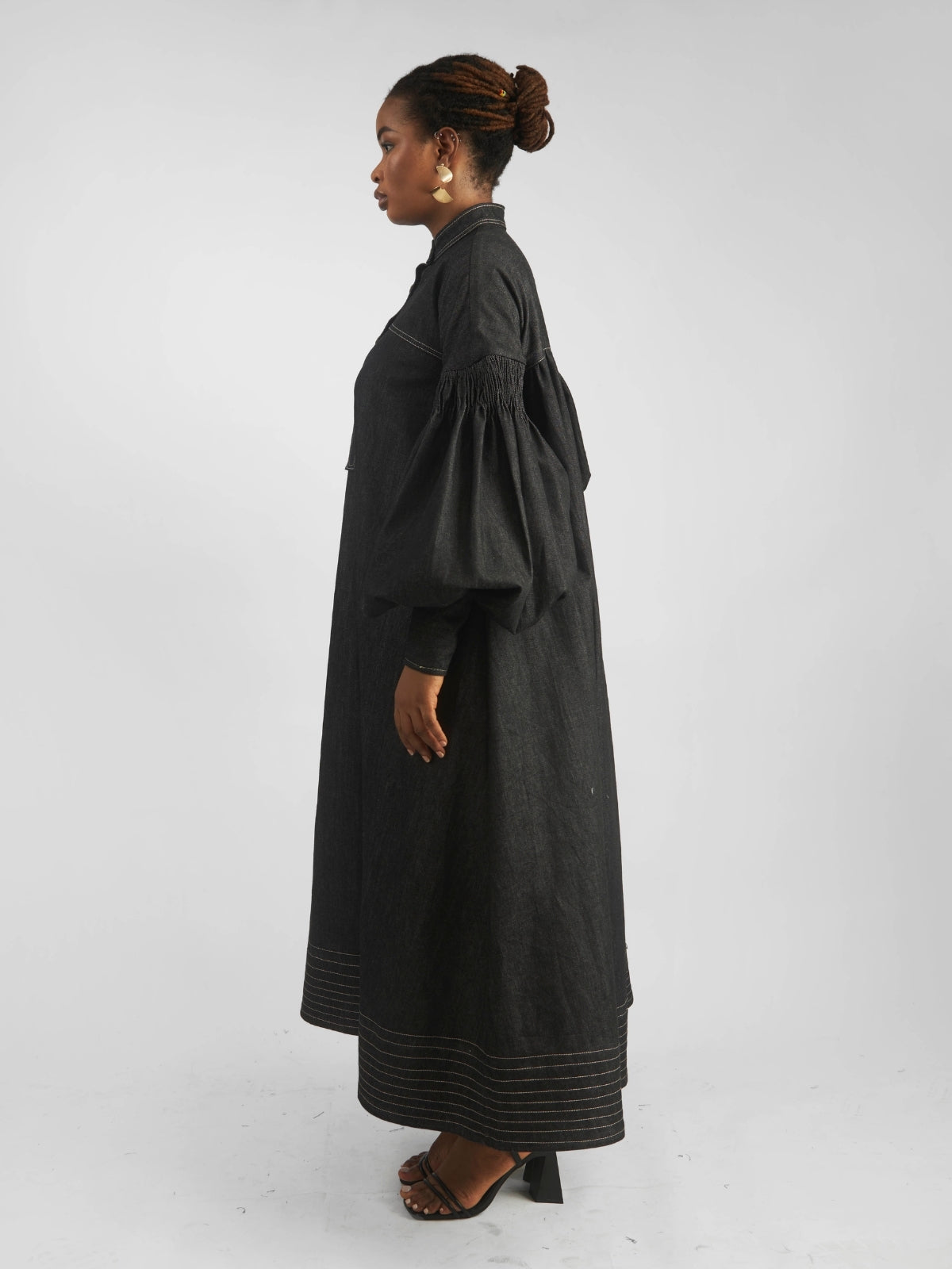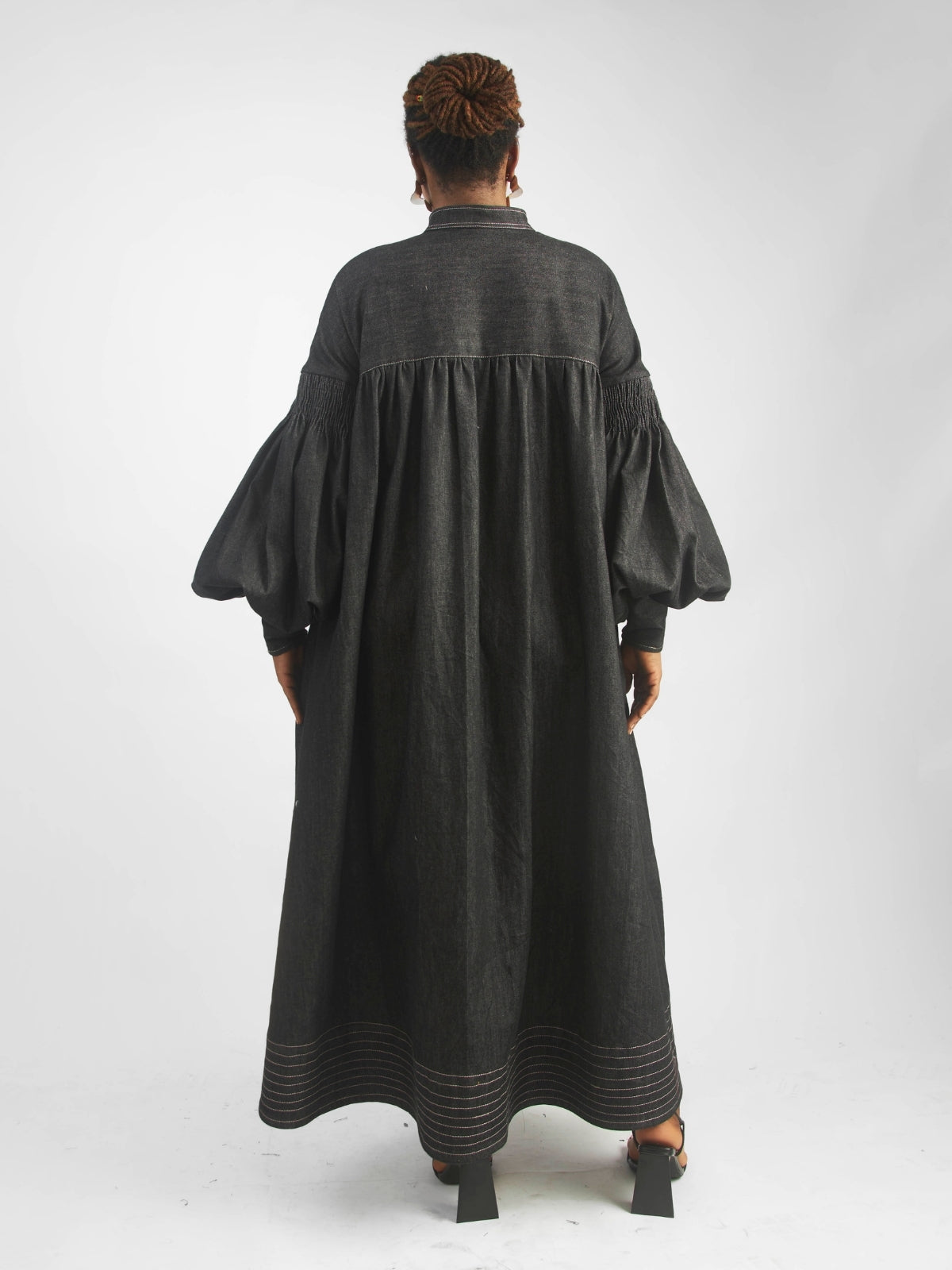 - Mandarin collar, half-button placket, long balloon sleeves, gathered cuffs, dropped shoulders, pockets, maxi length