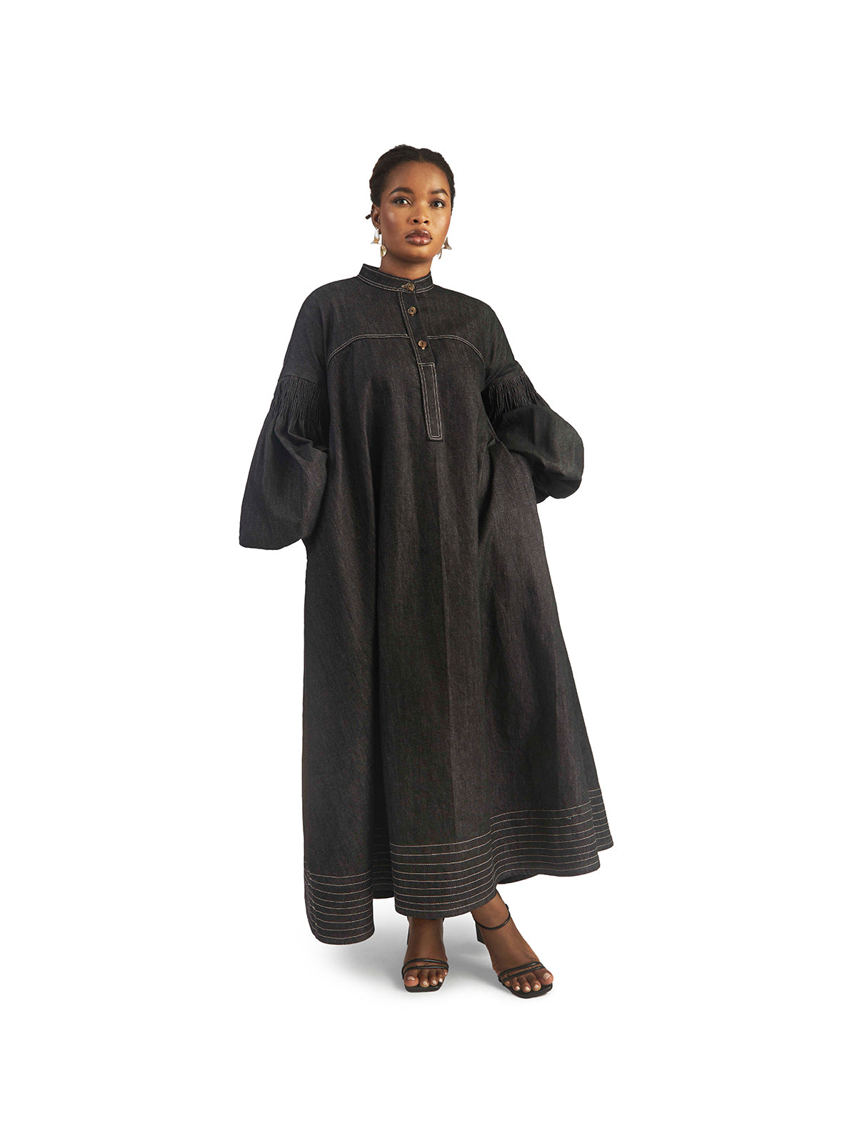 Boyedoe's Oseadeeyo III Denim Dress captures the brand's sculptural minimalism. It's handmade from reclaimed deadstock cotton denim enriched with contrast topstitching, adding depth to the dark indigo shade. A half-button placket, dramatic sleeves, and practical pockets lend a modern attitude—style yours with statement earrings and strappy sandals, as seen in the lookbook.