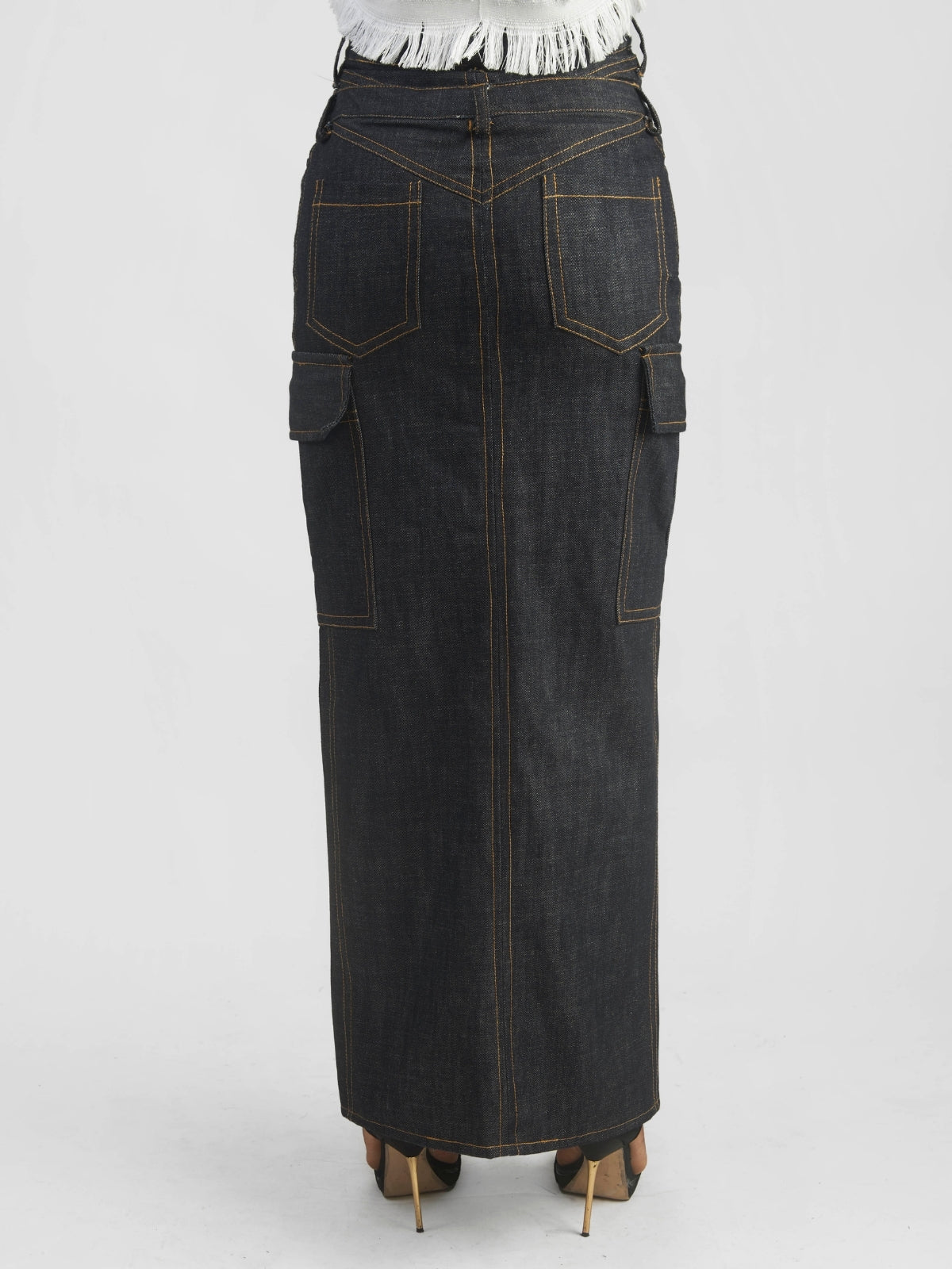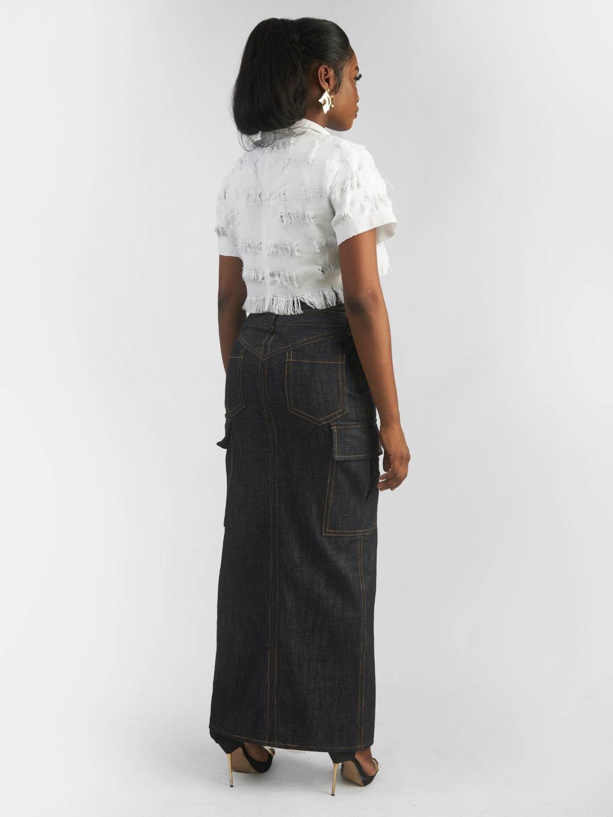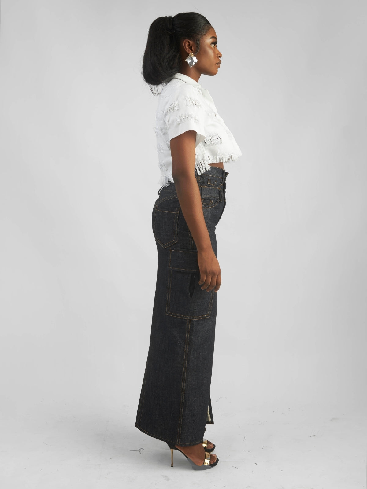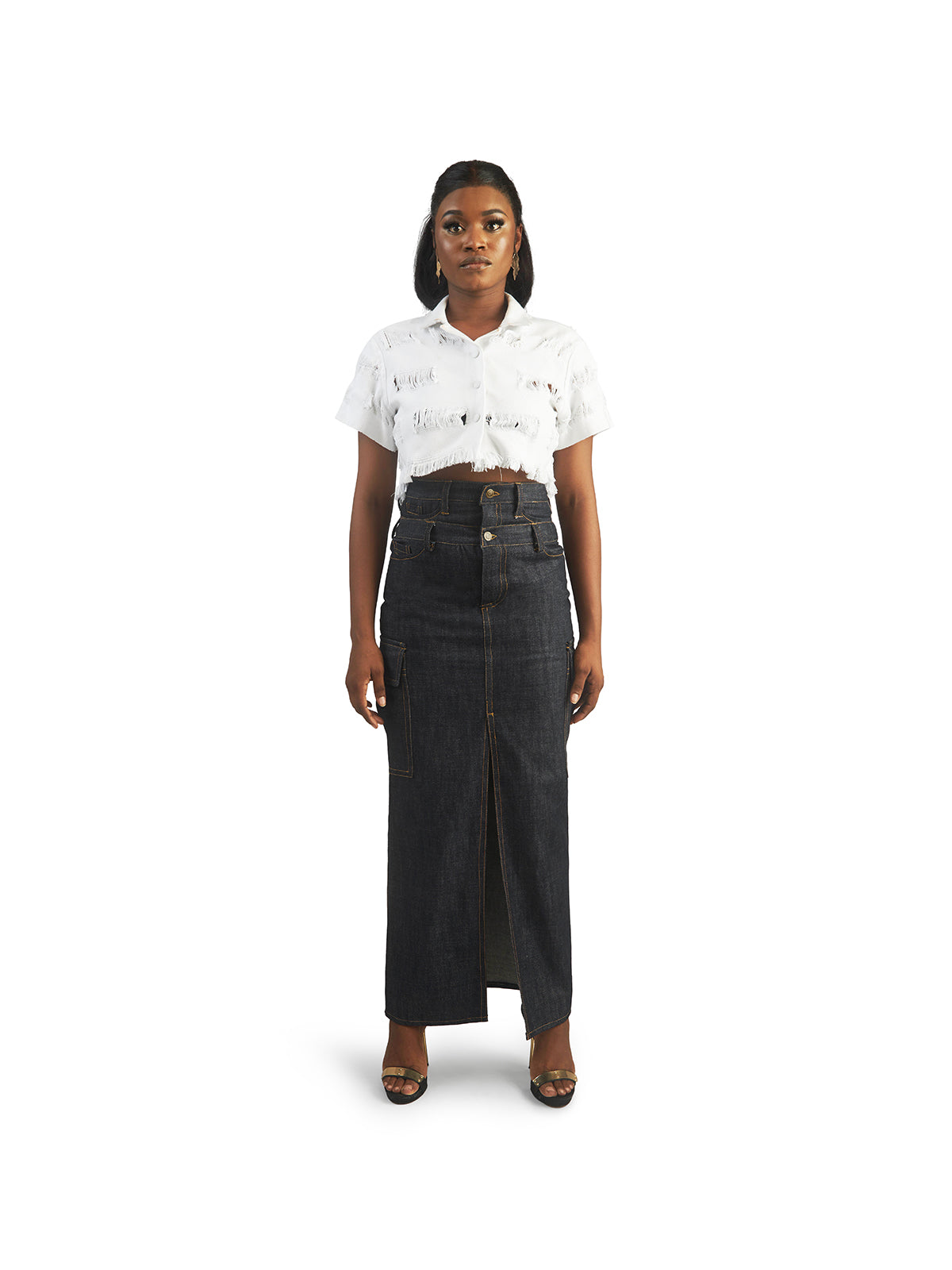 Bring fresh energy to your looks with Boyedoe's Oseadeeyo III Skirt. Made using deadstock cotton denim, the streamlined column silhouette catches the eye with double waistband detailing and cargo pockets, adding a touch of edginess. Contrast topstitching and a feminine front slit ground the look in timeless elegance—perfect with flats in the daytime and strappy sandals after dark.