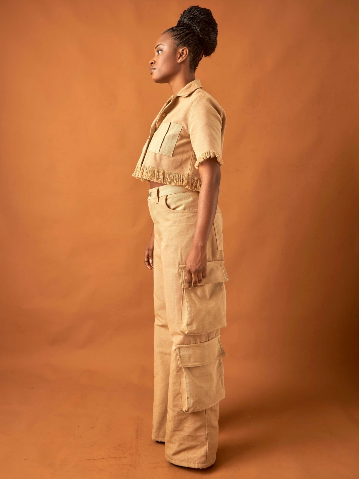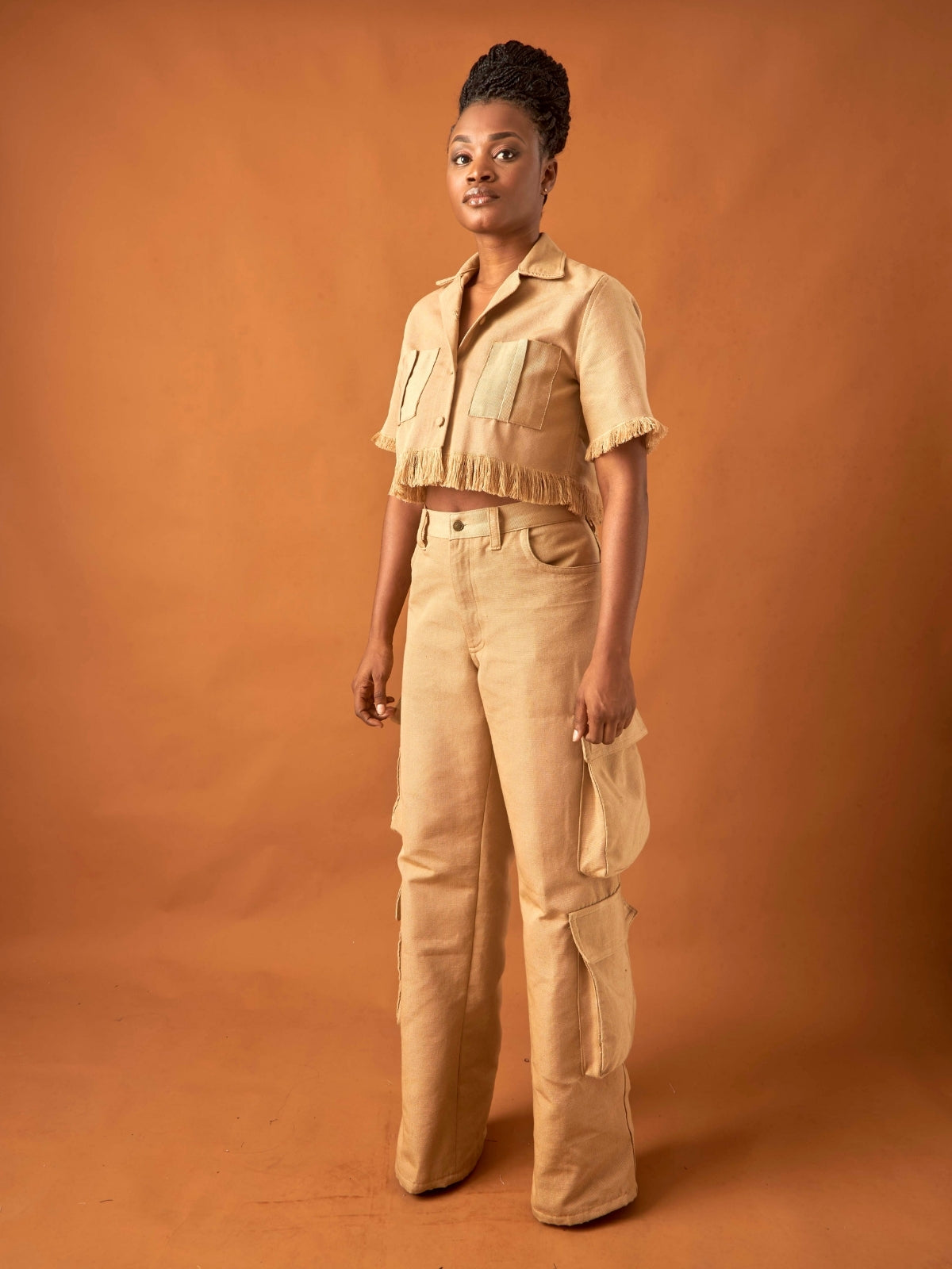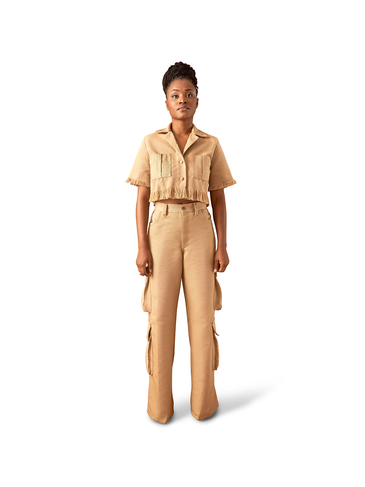 David Boyedoe re-imagines classic cargo pants in his distinctive way, ever straddling the line between art and fashion. Made from a sustainably sourced blend of cotton and silk, this pair has roomy side pockets, a high-rise waist and flared legs that touch the floor. Try them with a T-shirt or the Ghanaian label's coordinated Yomavu Cropped Shirt.