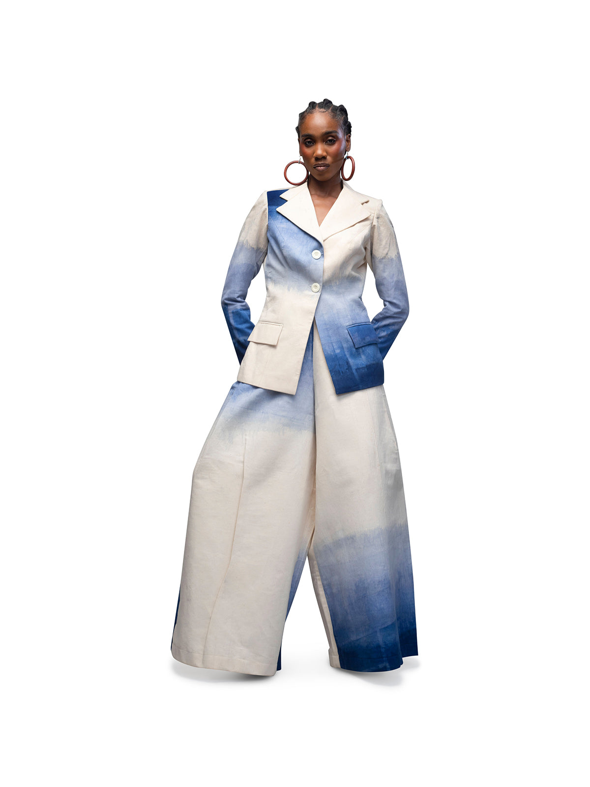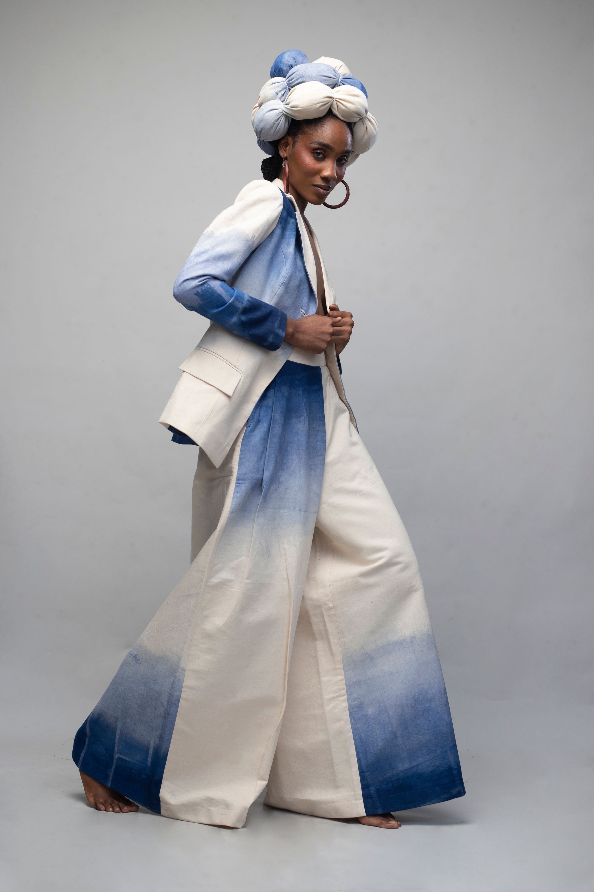 The Ini Jacket and Pant set from Nigerian label Cynthia Abila showcases hand-dyed gradient artistry that shifts from ivory into soft blues. Each piece carries unique dye variations, making it subtly one of a kind. Crafted from cotton by local artisans, the structured blazer features a notched collar and refined tailoring, while the high-waisted trousers feature a wide leg and side pockets. Wear it with point-toe mules and statement earrings.