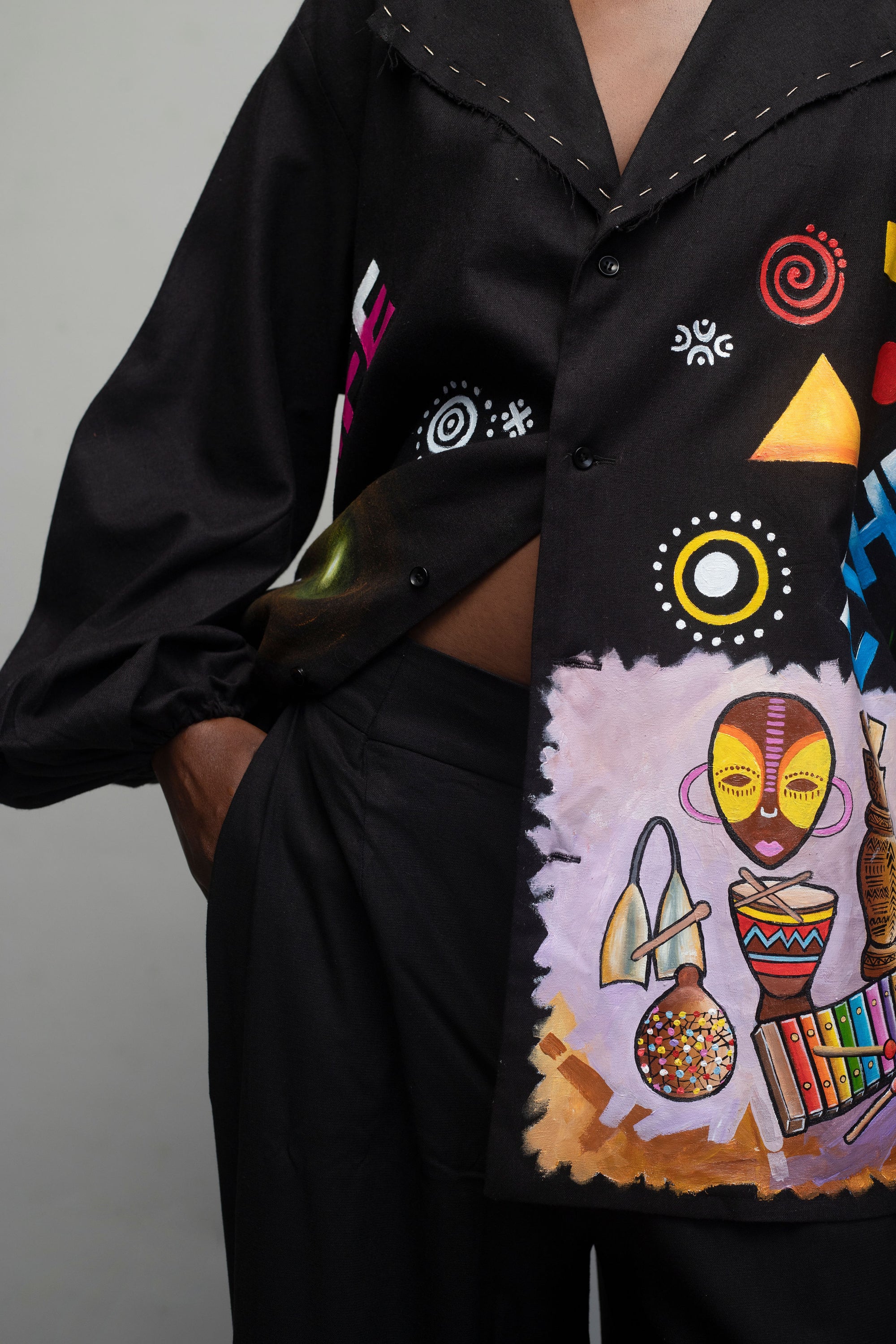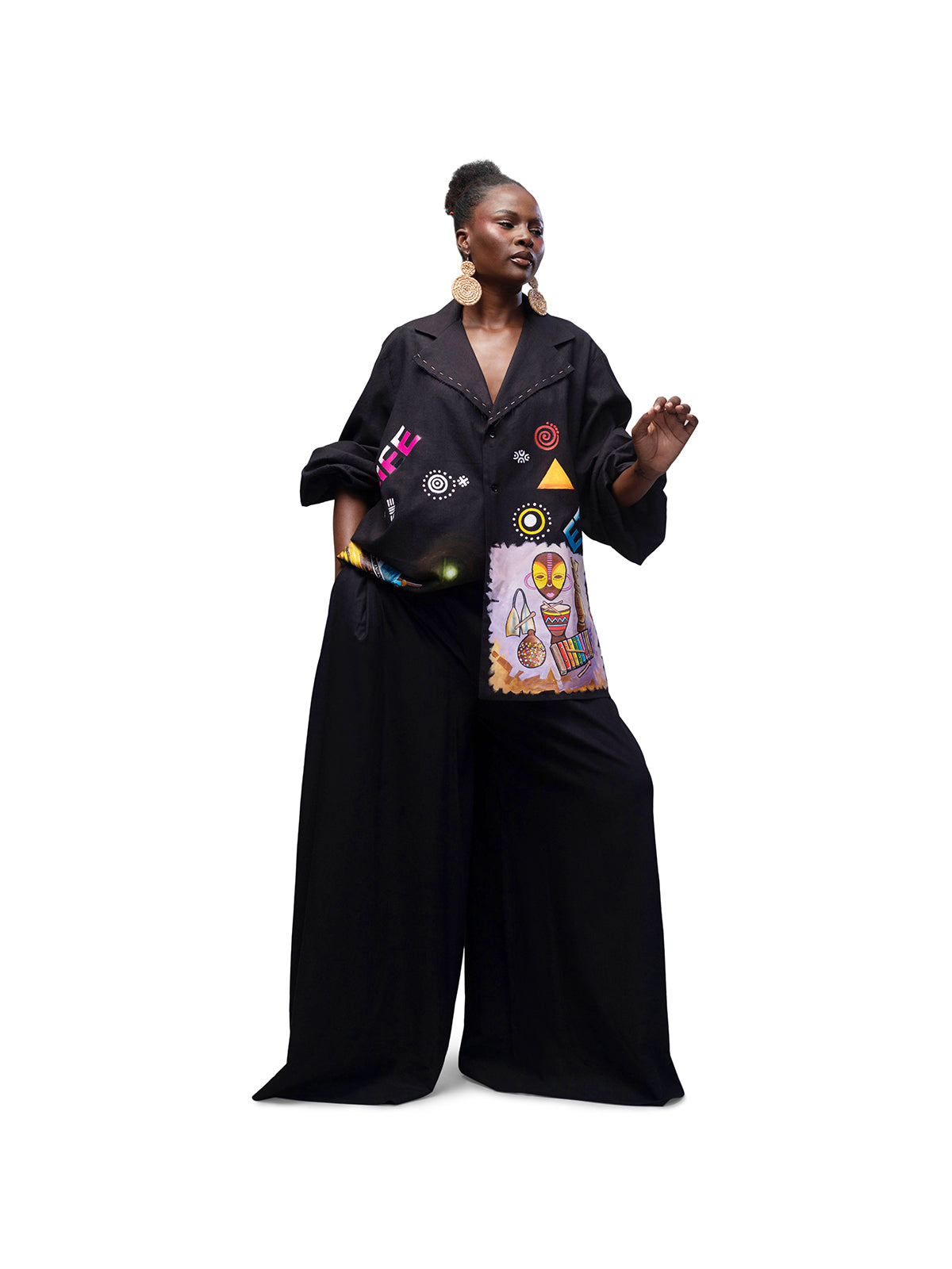 Each iteration of the Ivie Two Piece is a unique work of art, hand-painted with Igbo musical instruments and geometric motifs by Nigerian artisans. Crafted from rich black linen, the oversized shirt features a structured collar and statement sleeves, while the wide-leg trousers balance flow with tailored elegance. Style yours with leather loafers and minimal jewelry to showcase the bold details.
