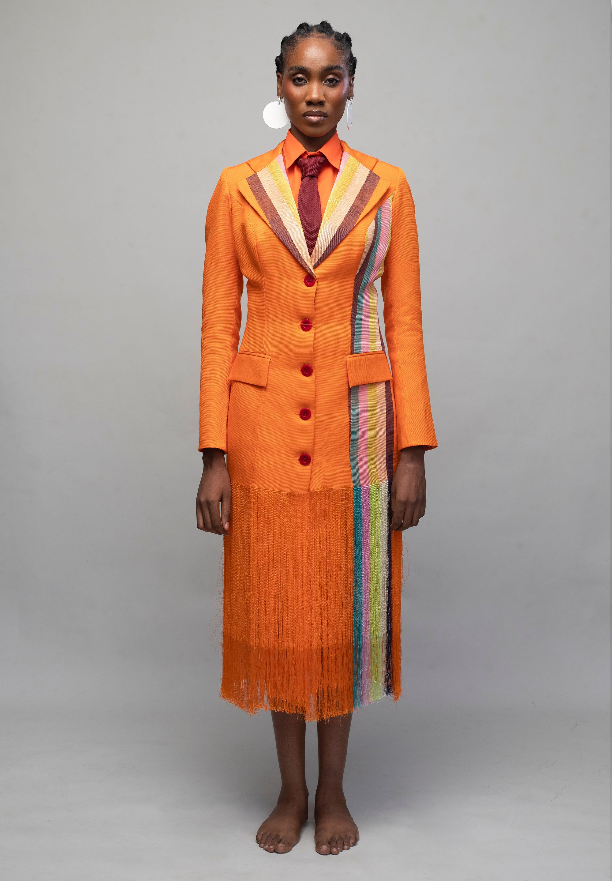Cynthia Abila's Oma Jacket Dress is crafted from rich tangerine orange cotton with hand-loomed multicolor striping along the lapel and side panels. The tailored silhouette features sharp shoulders, a defined waist, and button-front closure, finished with a bold fringe hemline that adds movement and drama. Style it with a matching shirt and tie for powerful suiting, or solo with strappy heels on nights out.
