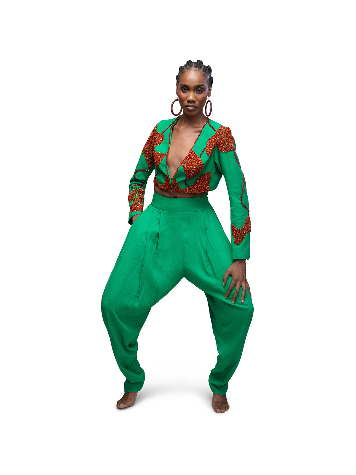 The Otu Green Crop Jacket and Pant Set is a bold exploration of fluid tailoring and intricate craftsmanship. The cropped jacket features an ultra-deep V-neckline adorned with wave-like beadwork hand-applied across the bodice and sleeves for textural depth. It pairs with high-waisted wide-leg pants in soft linen with pleated fronts and tapered ankles to create dramatic movement. Wear yours with minimalist heels and oversize hoop earrings.