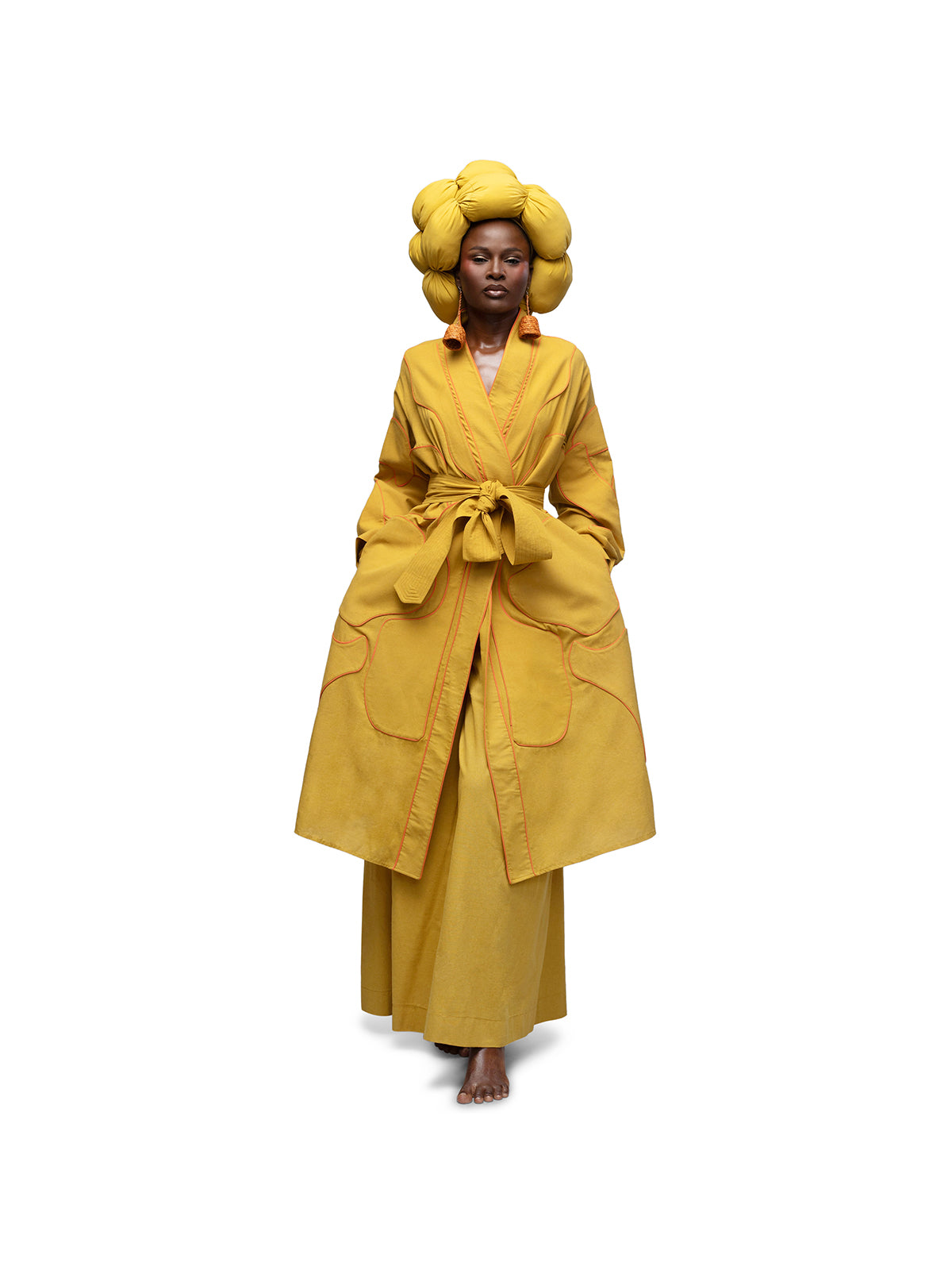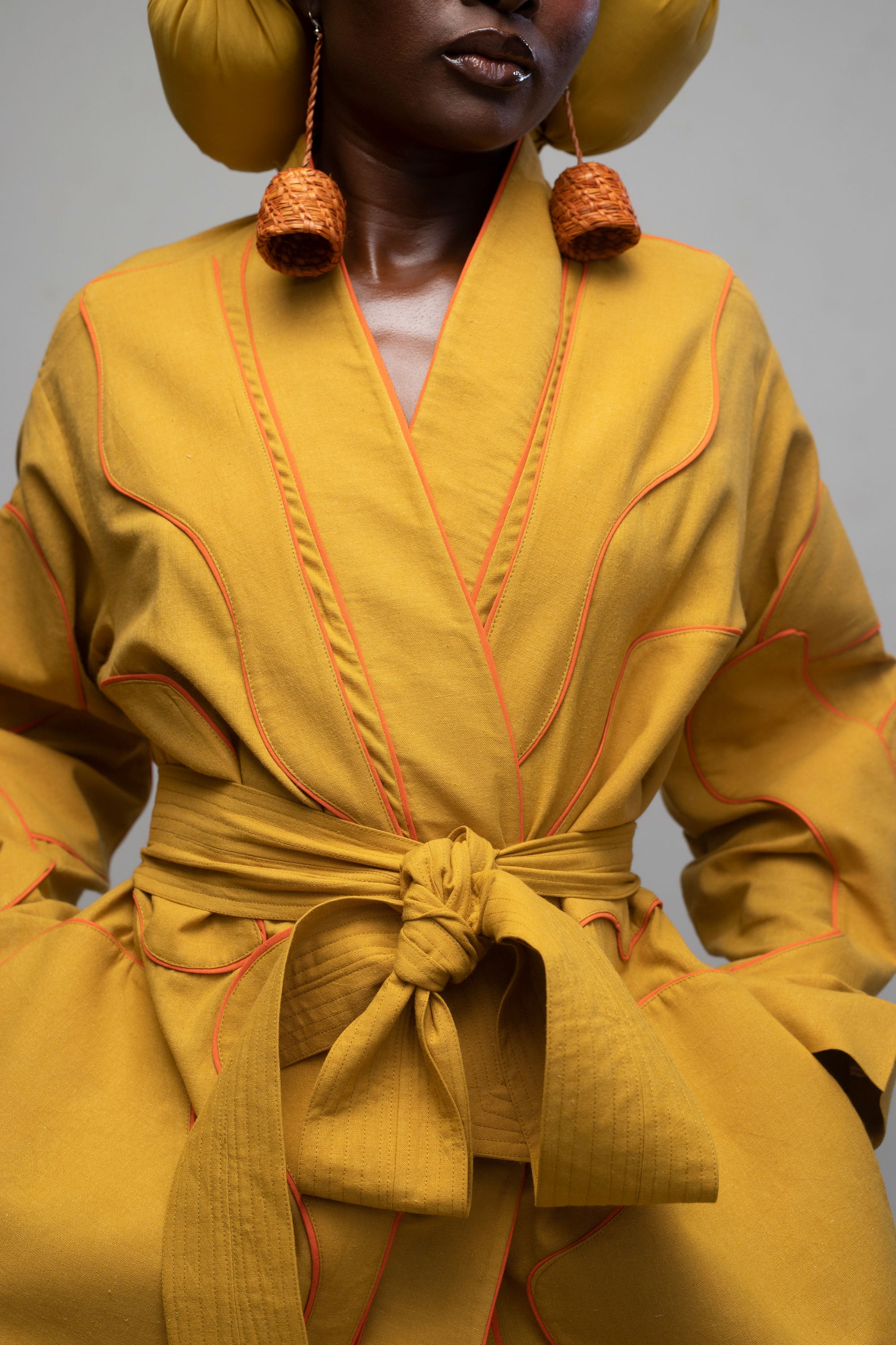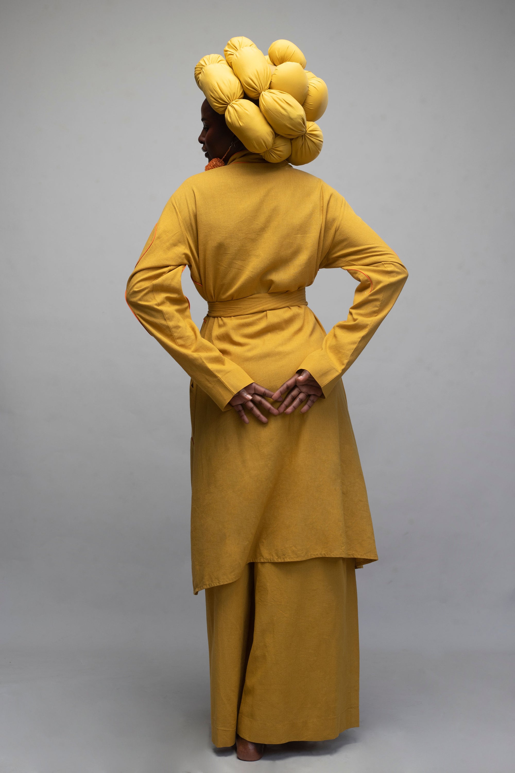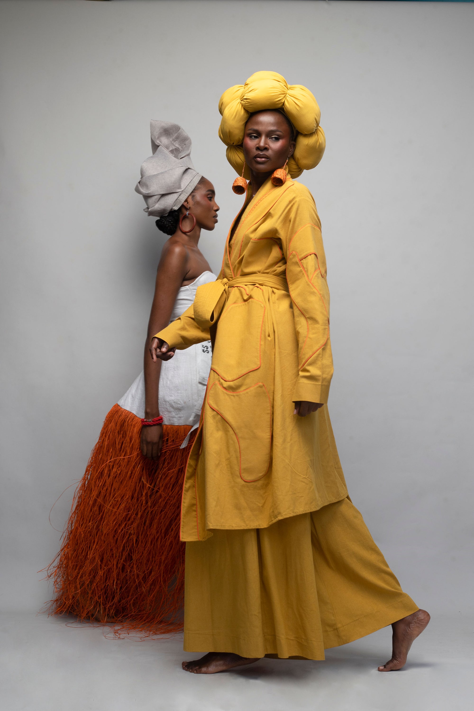The Rayuwa Kimono and Pant Set reflects Cynthia Abila’s vision of effortless modernity grounded in African craftsmanship. The kimono features intricate patchwork detailing with orange-edged outlines that celebrate handmade precision, cinched at the waist with a wide belt. Flowing matching pants create a relaxed silhouette that moves with ease. Style with leather flats and delicate gold jewelry for effortless sophistication.