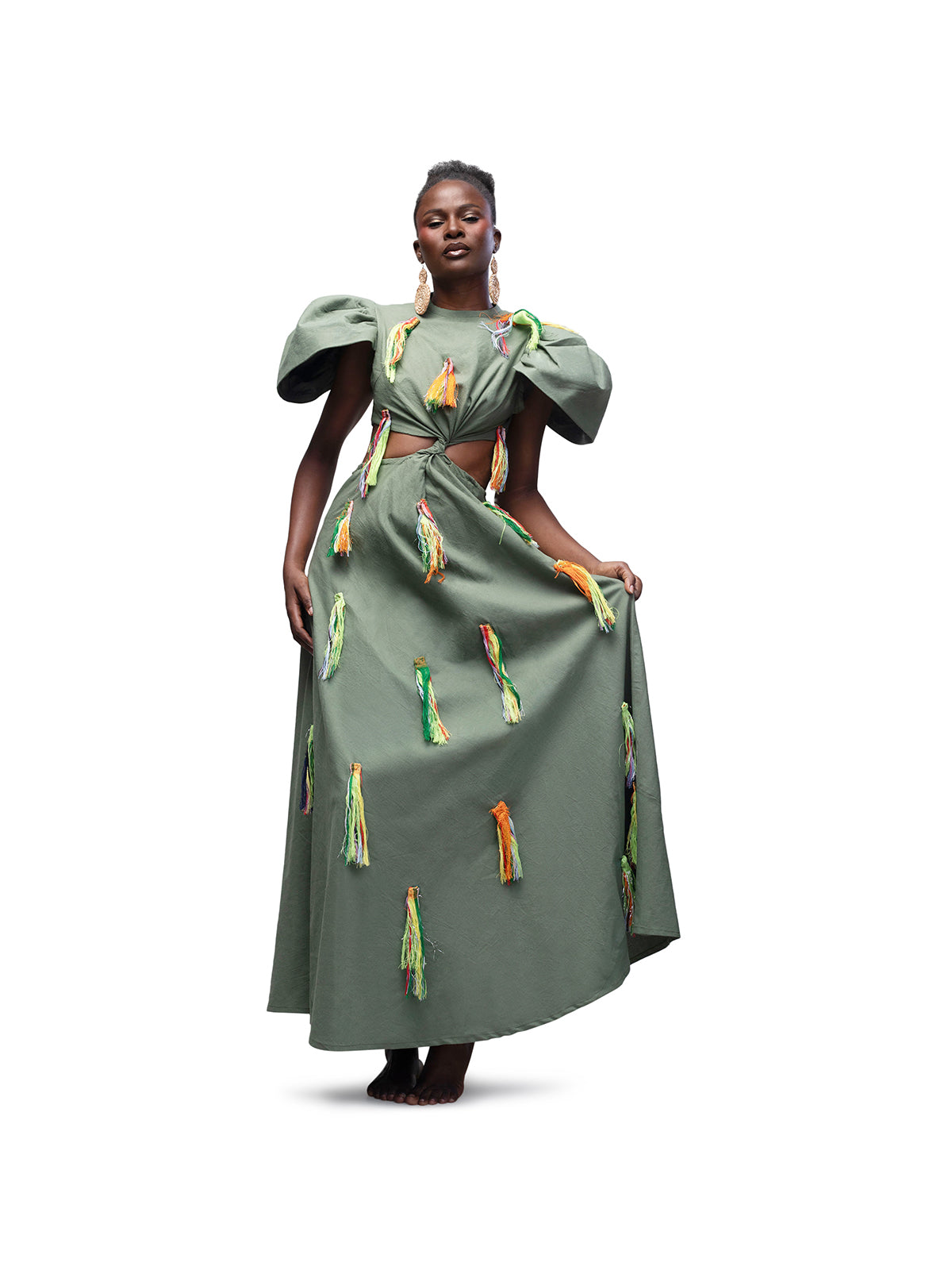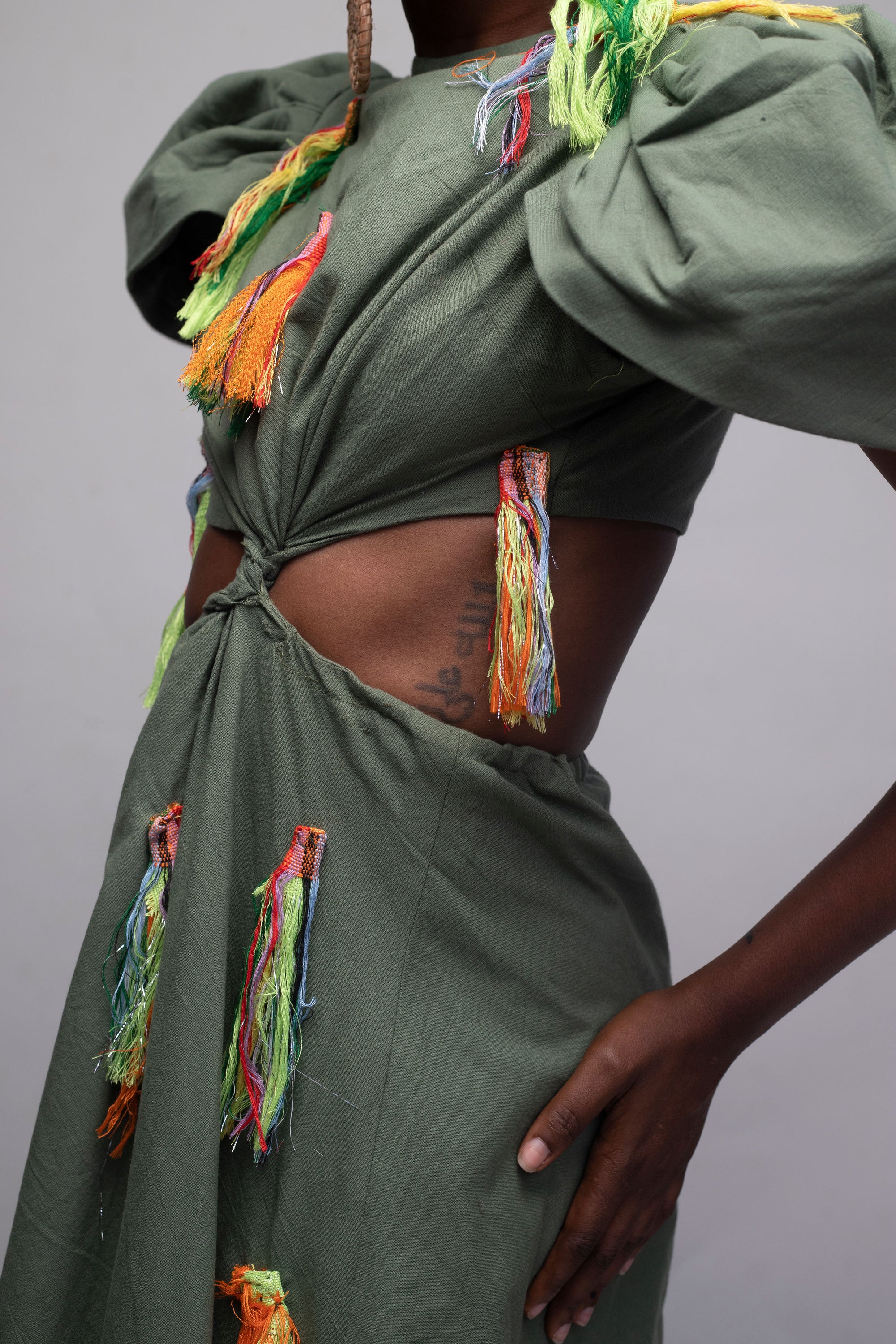 The Soma Dress from Cynthia Abila blends sculptural design with playful artisanal detailing. Made from soft cotton, it features voluminous puff sleeves and a twist-front bodice that turns to reveal an open lower back. Multicolored tassels crafted from fabric trimmings are hand-placed for textural depth and movement. Accessorize it with sandals and understated jewelry.