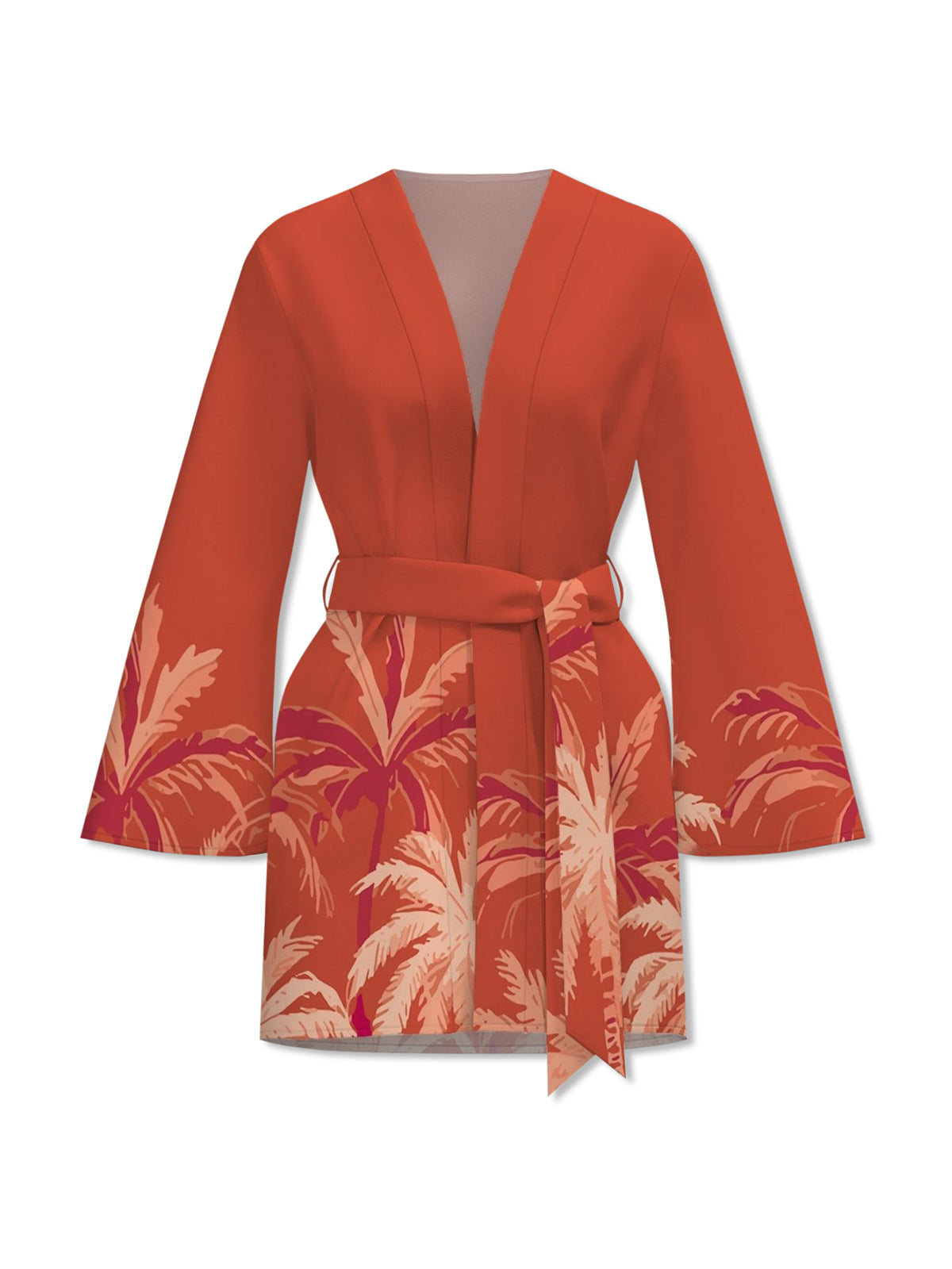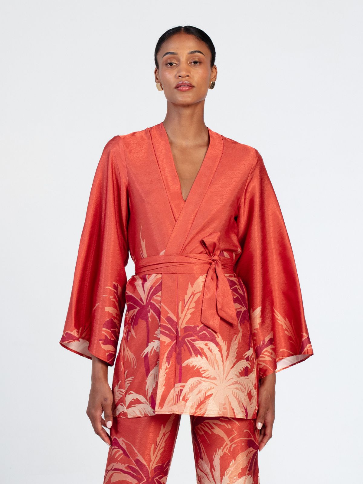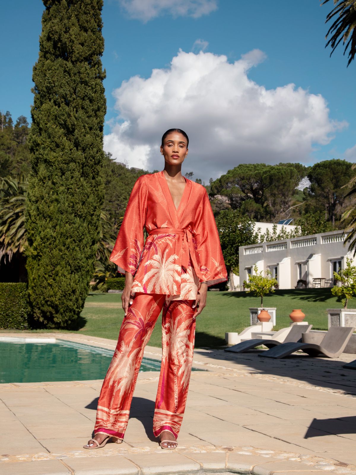 Diarrablu’s creations are a sartorial celebration of geometry and modern art. This Mini Kimono was handmade in Senegal by local artisans from smooth jacquard printed with a vibrant palm tree motif. It has flowing long sleeves and an adjustable sash belt to cinch the fit. Pair it with the matching Hana Pants from our edit for a refined ensemble at early evening aperitifs.