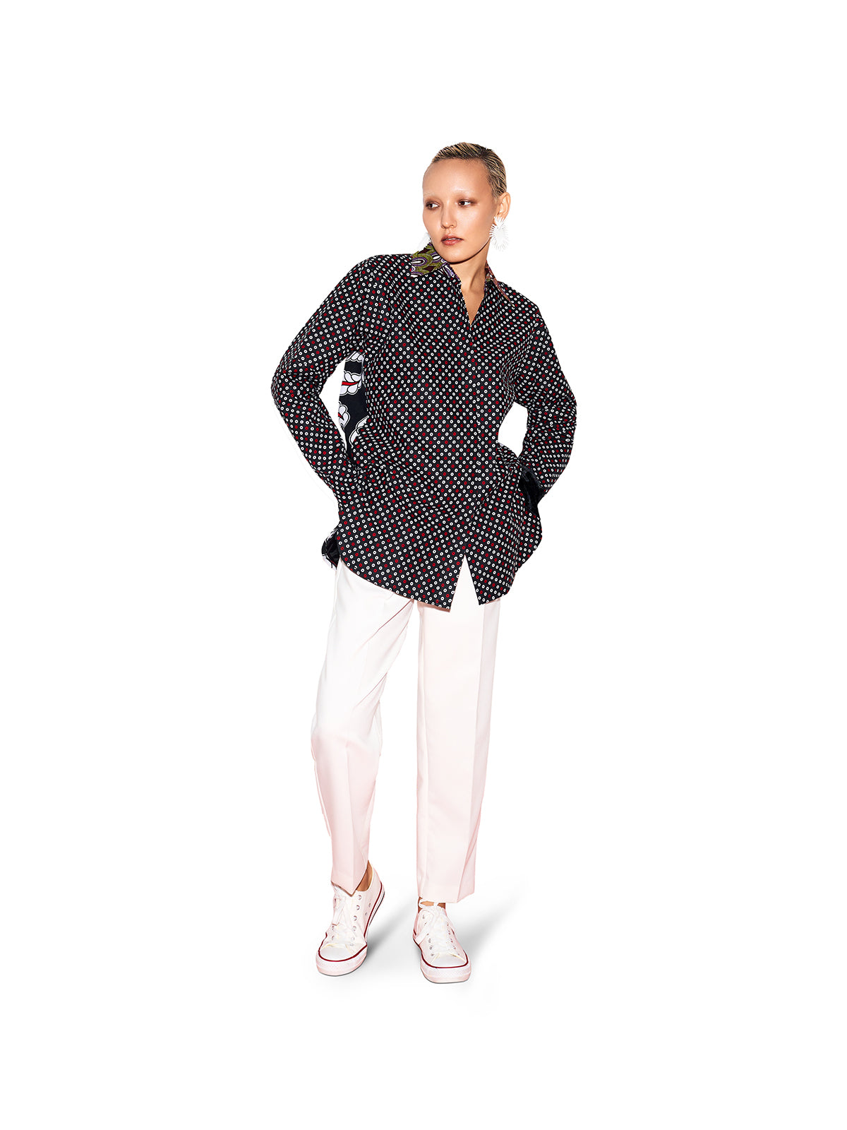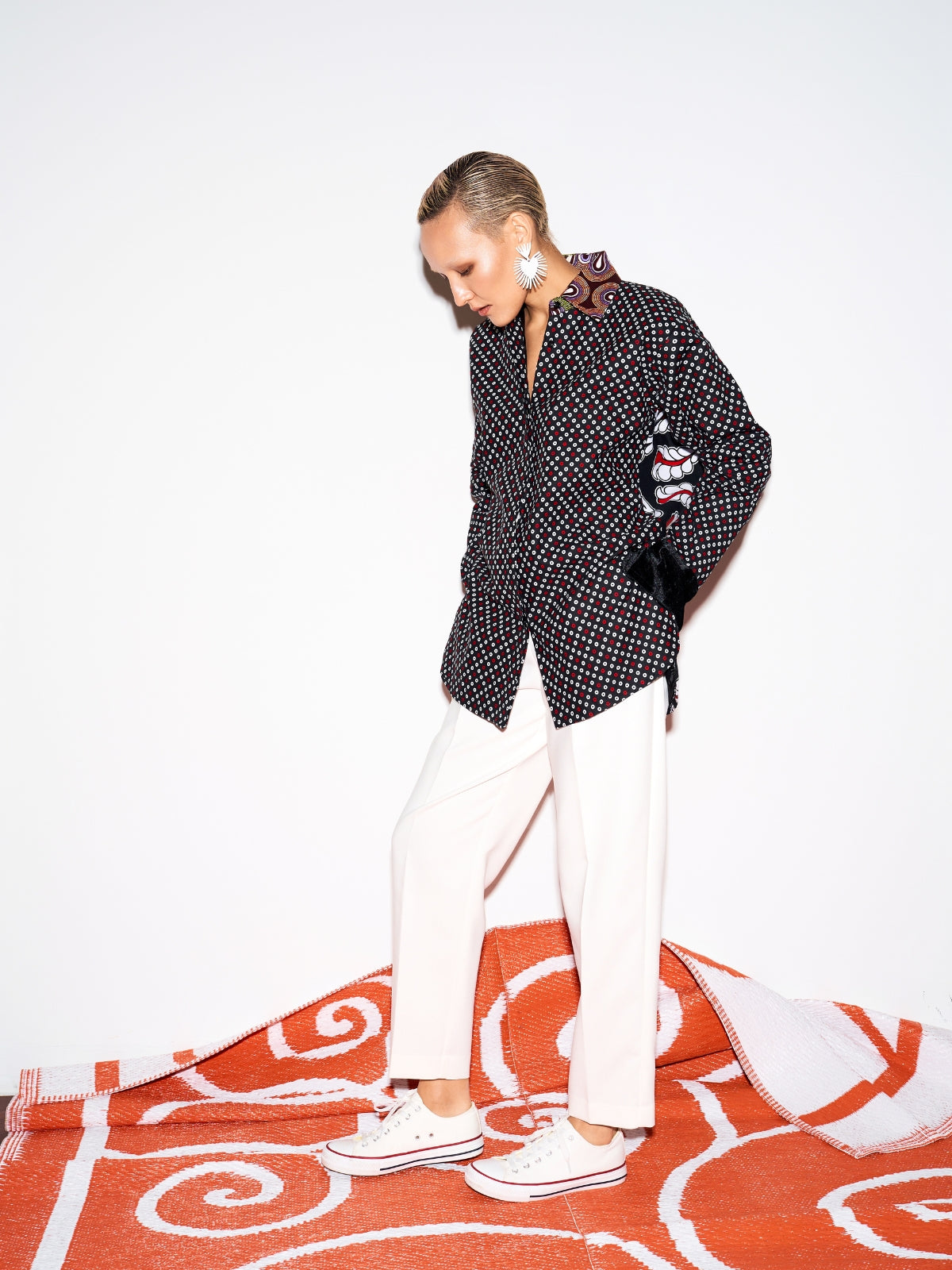 Known for her vibrant use of pattern, Doreen Mashika draws on her Tanzanian heritage when creating her innovative pieces. The Mahela Shirt is an elevated take on the classic boyfriend shirt—it's crafted from matte satin Bemberg for a relaxed silhouette that drapes effortlessly. The style features a sculptural spread collar and velvet-trimmed cuffs to add textural contrast. Pair it with jeans or the matching Mahela Trousers from our edit.