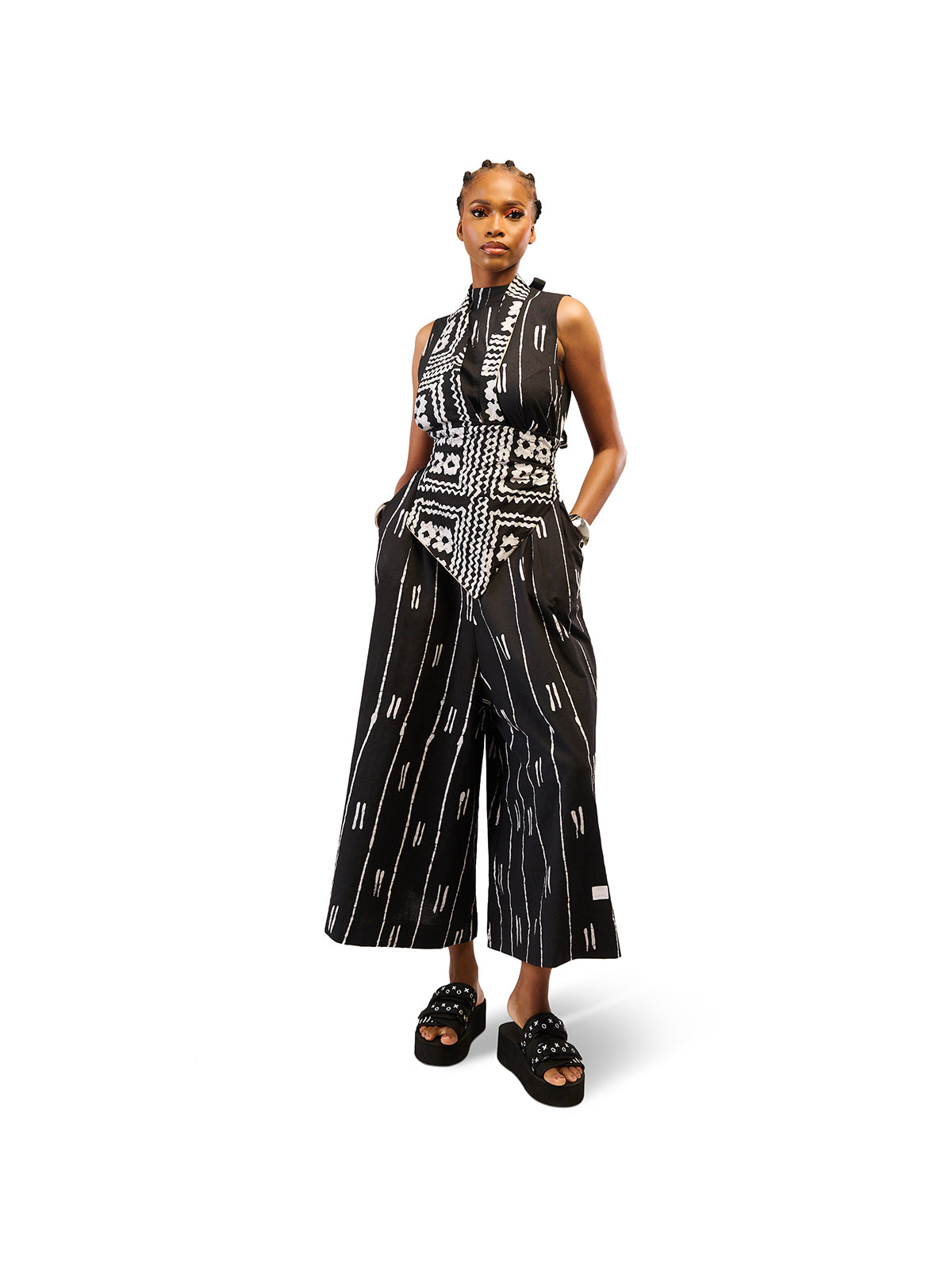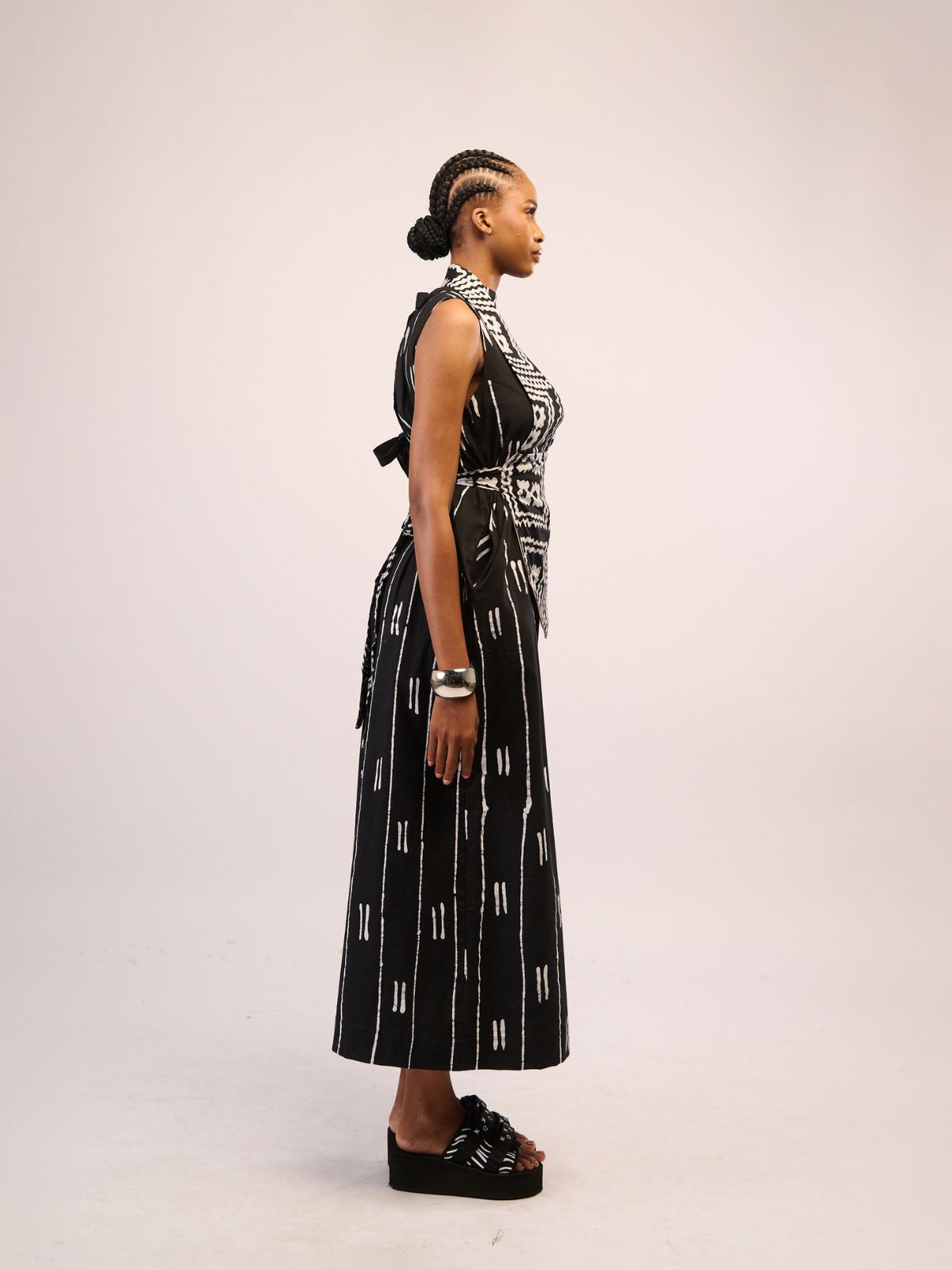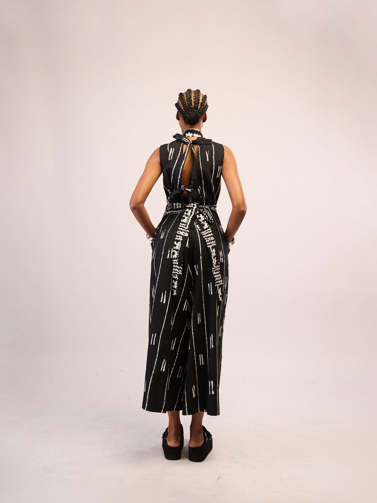 Featuring a teardrop Adire motif in crisp black and white, this jumpsuit is a refined exploration of African printwear. Dye Lab’s clean tailoring and hand-dyed cotton bring elevated minimalism to a bold, culturally rooted design. A powerful piece from a Nigerian designer redefining African fashion on the global stage. We love to style it with chunky heels and a bold handbag for a fashion-forward look that balances minimalism with cultural depth.