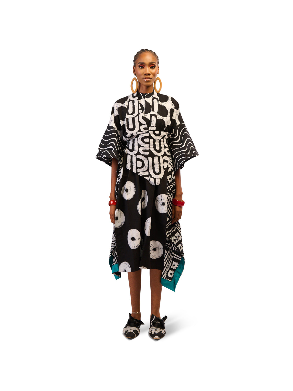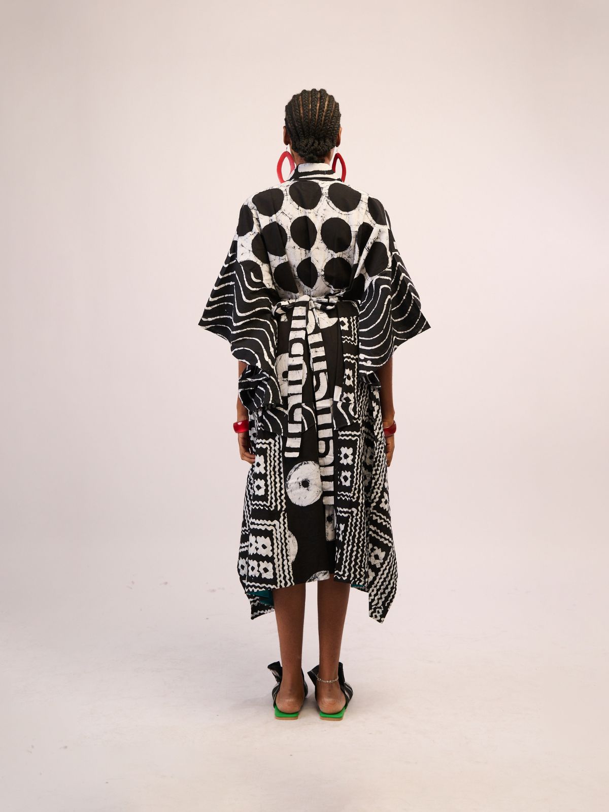 Where structure meets fluidity, this kimono-sleeved shirt dress by Dye Lab delivers a lesson in understated elegance. Crafted from hand-dyed cotton in black and white Adire motifs, it features wide kimono sleeves and a relaxed silhouette that balances comfort with directional design. A versatile Nigerian designer piece, steeped in tradition and ready for the world stage. Channel understated elegance with this kimono-sleeved shirt dress. Add statement sandals to enhance its fluid structure and give it a modern, polished finish.