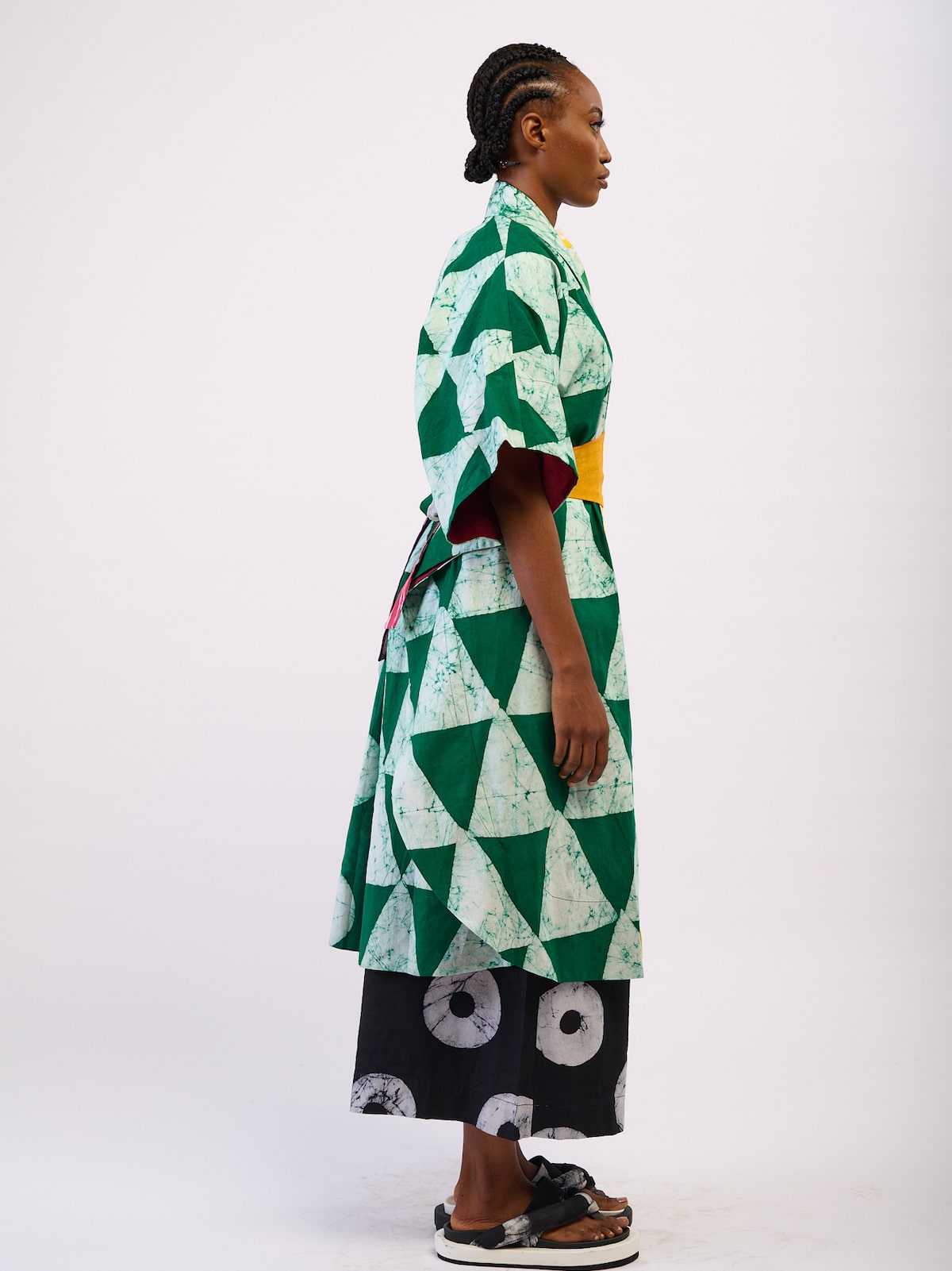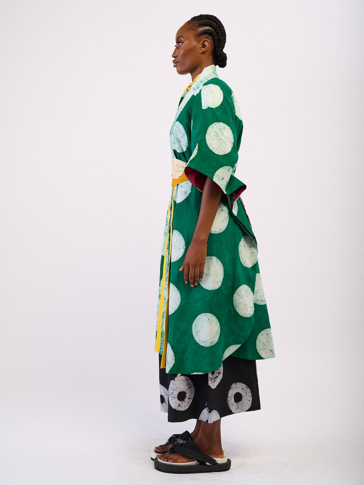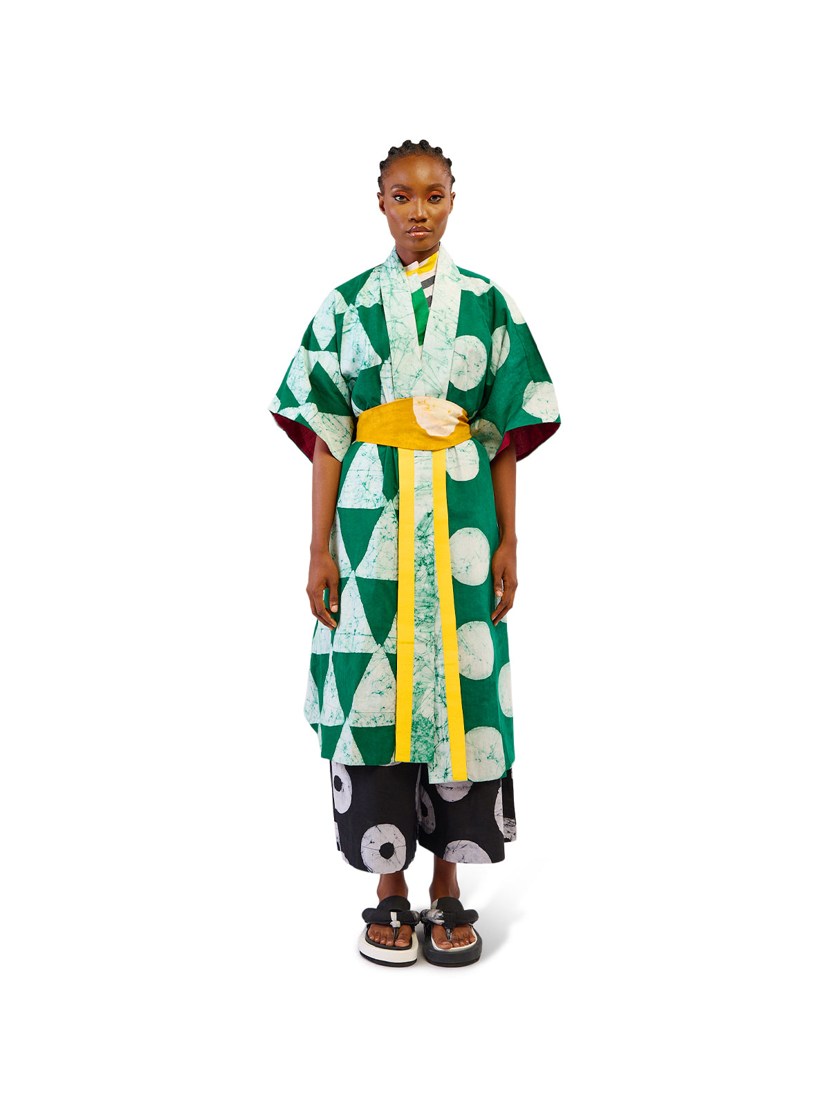 Step out of your color comfort zone in Dye Lab's Green & White Kyoto Kimono. As with all pieces by the brand, it's crafted in Lagos, Nigeria, by local artisans and hand-painted using traditional, time-honored methods. Notice the contrasting neckline and waist-cinching belt for an even more playful look. Style yours with the brand's cropped Kano Pants and a clashing clutch to up the impact—but act fast, stock is limited to just a handful of pieces each month.