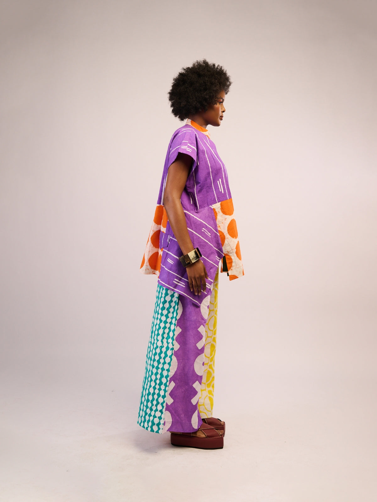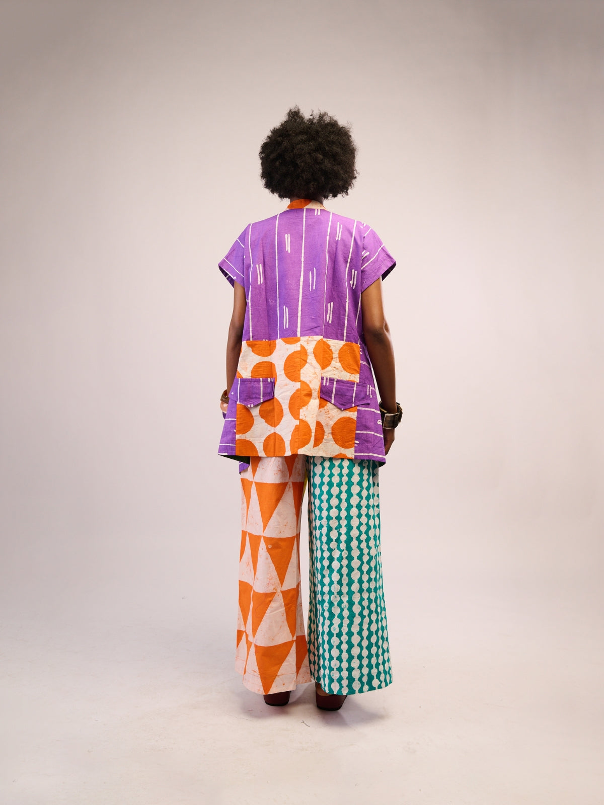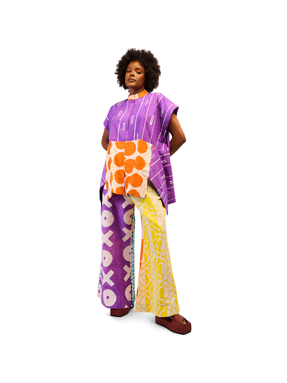 A celebration of color and craft, these wide-leg pants from Dye Lab transform everyday dressing into an experience of joy. Crafted in soft, breathable cotton, their flowing silhouette moves effortlessly from day to night, offering both comfort and style without compromise. The highlight lies in the contrasting Aso Oke back pockets - each hue chosen at random, a playful surprise that makes every pair uniquely yours. Pair it with the Lilac and White Osaka Tops.