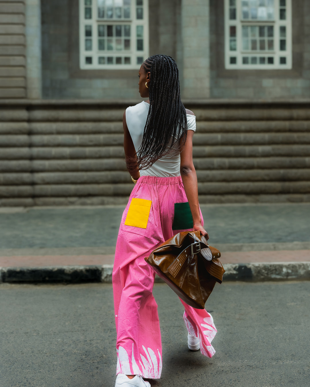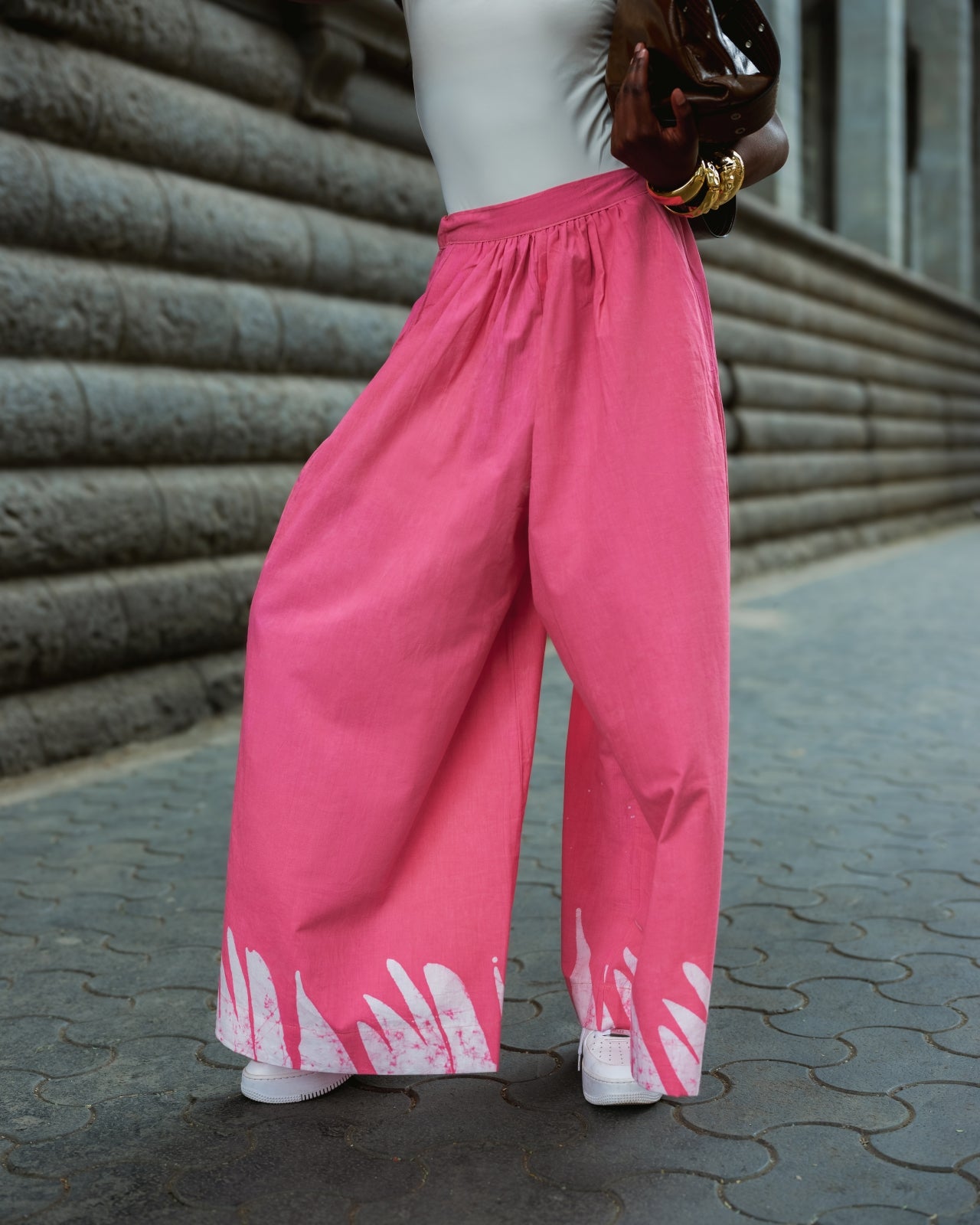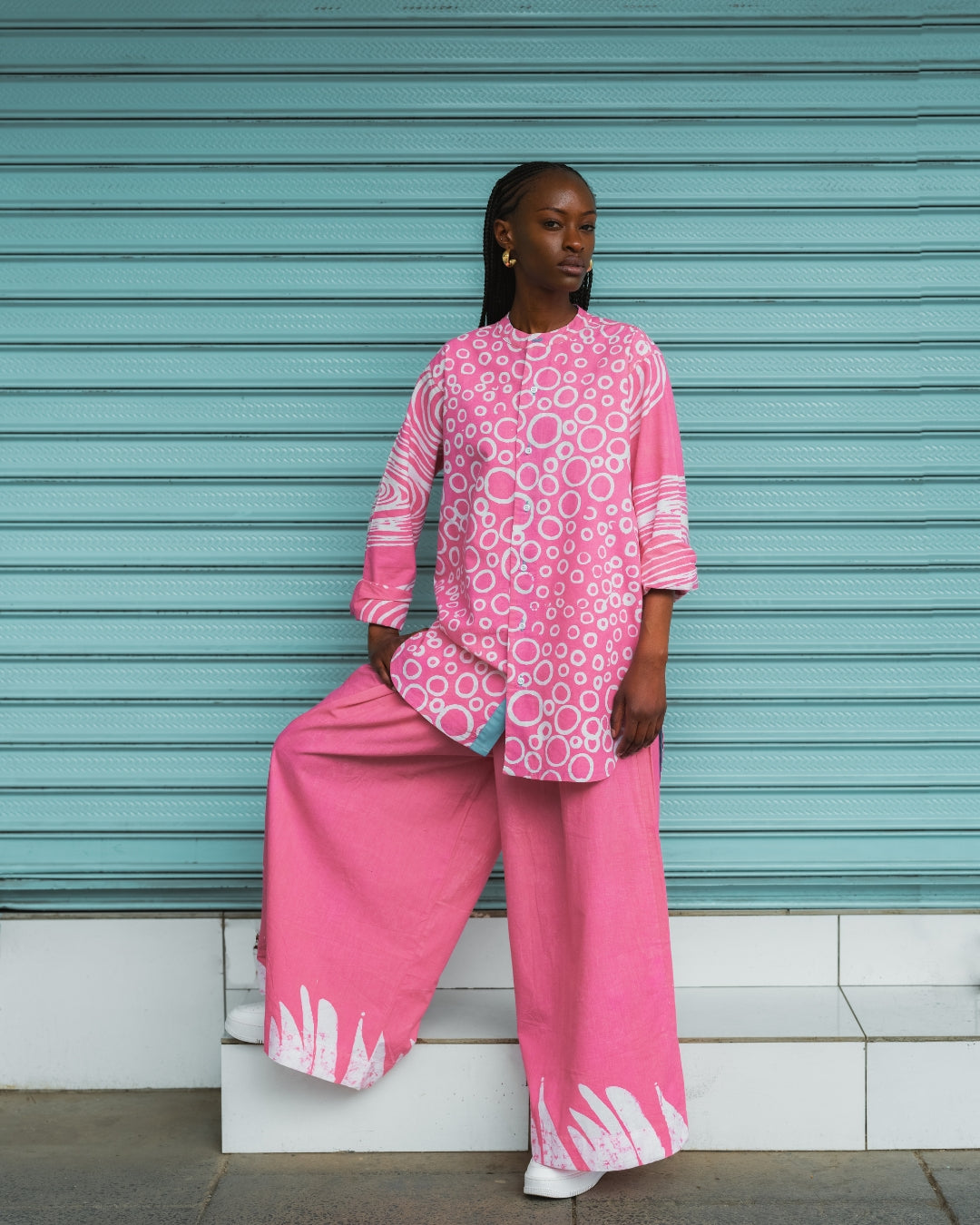 Expressive pink dye work transforms these wide-leg pants into a statement that remains wearable. The elasticated waist and breathable cotton make them practical, while Aso Oke accents maintain the collection’s artisanal language. Intended to mix across multiple looks, they function as both set dressing and standalone colour. Wear with neutral separates to soften the impact, or pair it with the matching Pink Oversized Shirt for a bold expression.