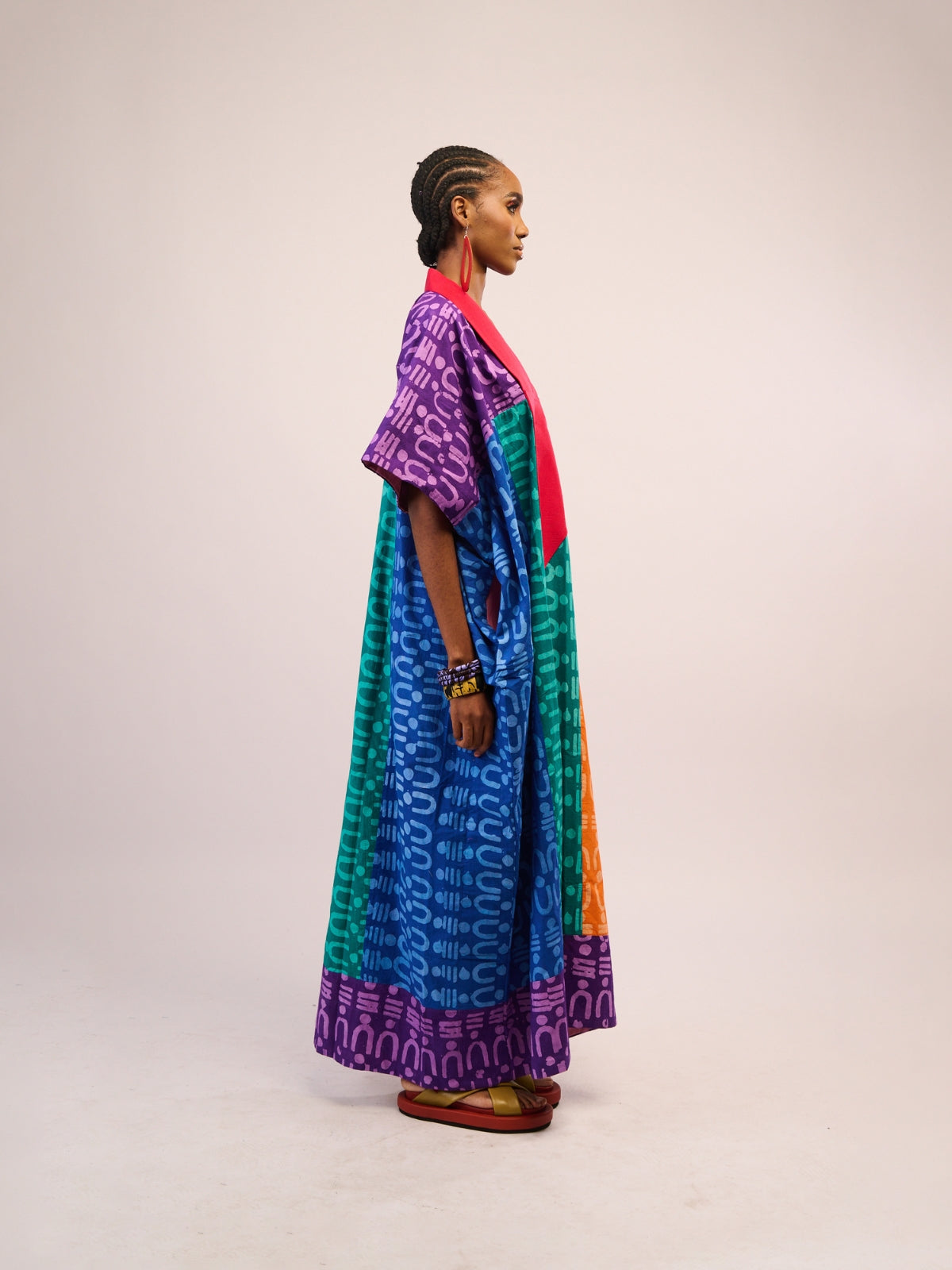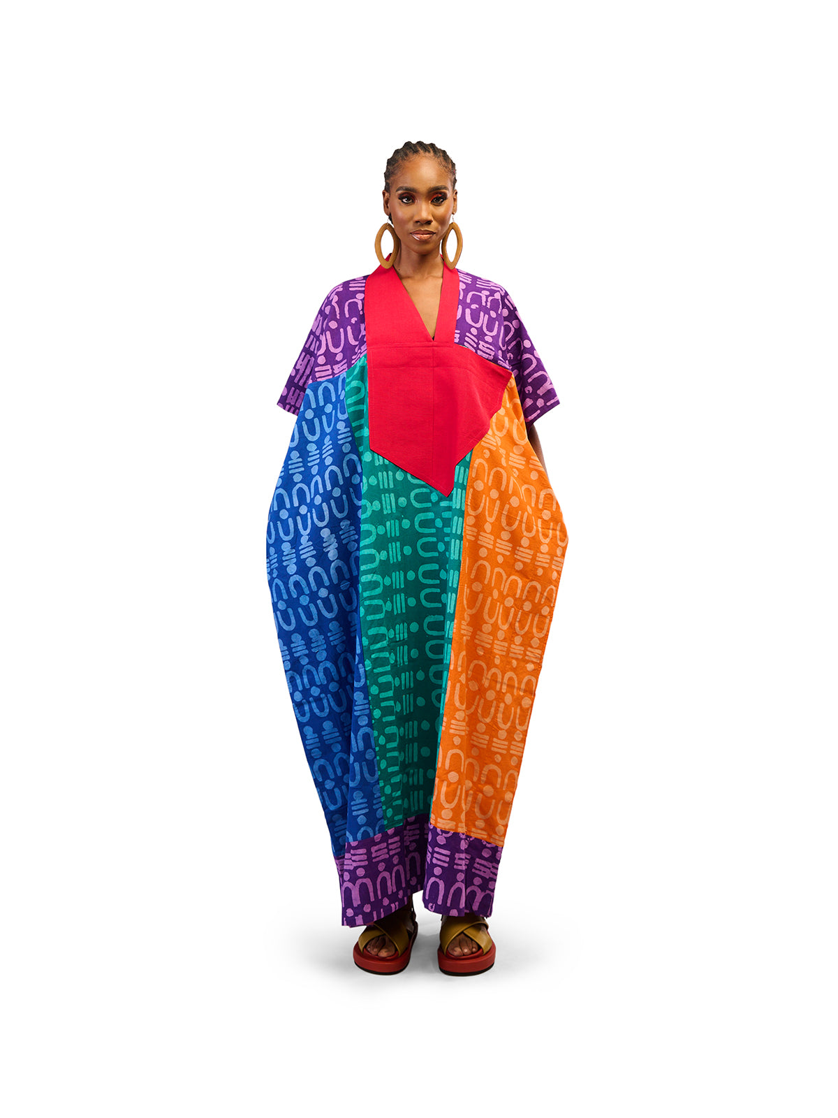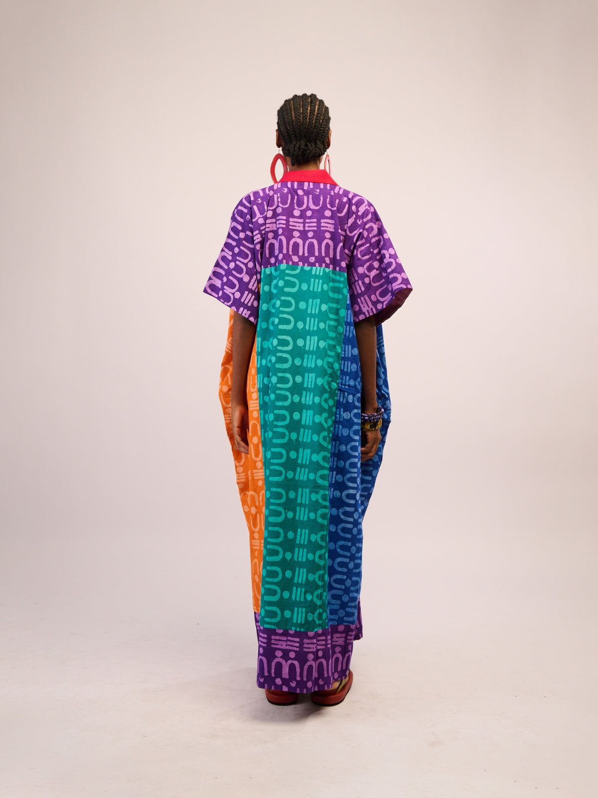 Dye Lab’s Agbada reinterprets tradition through a contemporary lens in this bold, Nigerian-made design. Hand-dyed cotton in vibrant multicolor tones is elevated by a striking fuchsia Aso Oke collar - an unexpected contrast that nods to Yoruba ceremonial wear while embracing modern ease. Pair it with statement jewelry and your favorite sneakers for a look that merges heritage with effortless, modern flair.