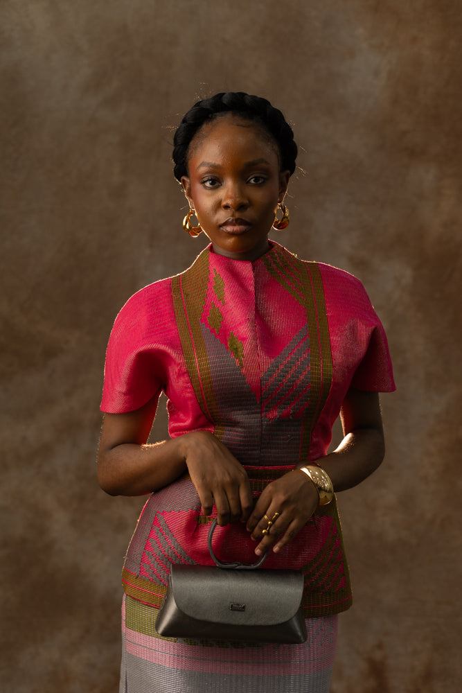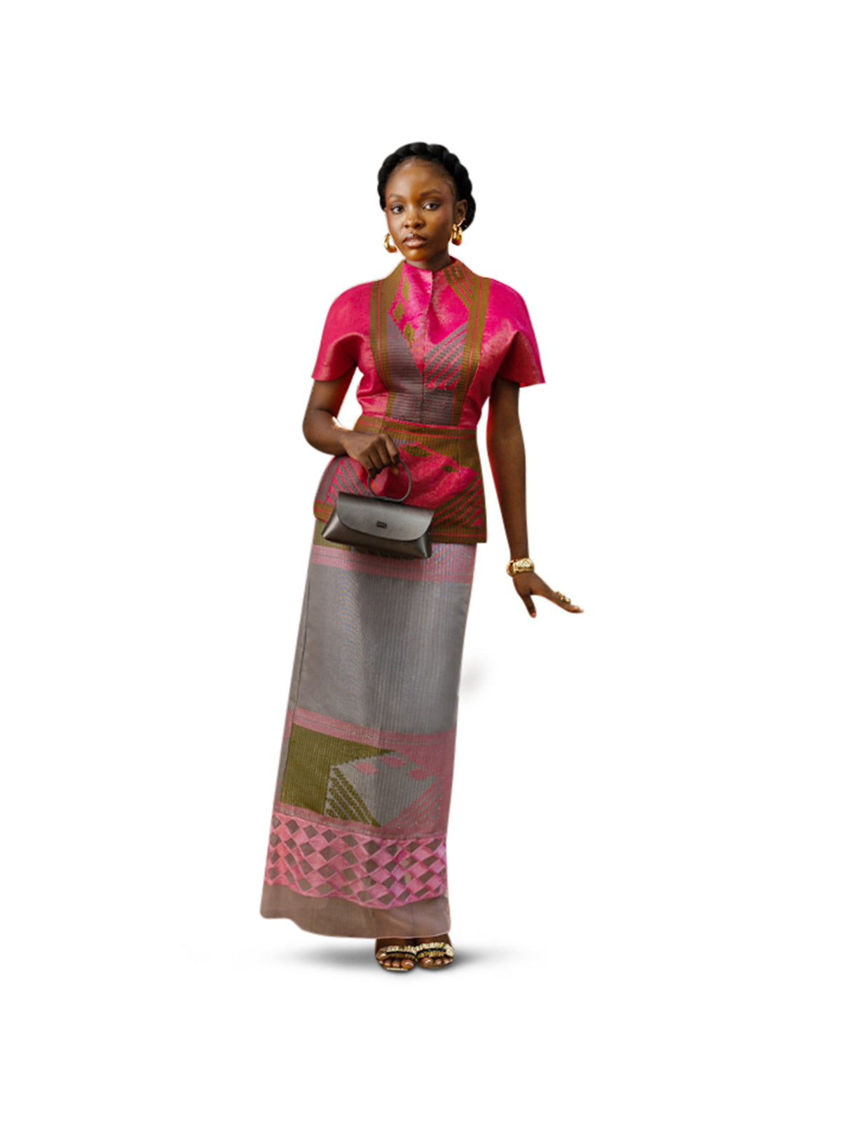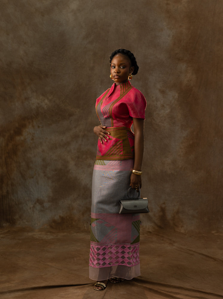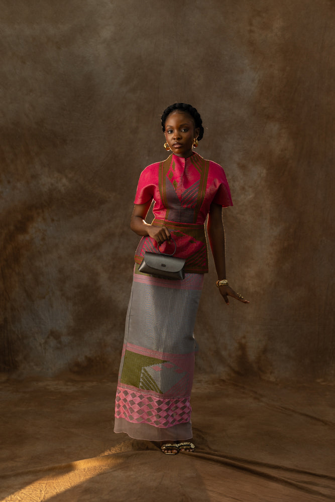 A celebration of heritage craftsmanship, the Arin Aso Oke Set showcases hand-woven Aso Oke textures shaped into a fitted blouse and a fluid long skirt. Its sculptural lines and artisanal structure embody Odyssey’s dialogue between tradition and modernity. Style with bold earrings to complement its multicolored weave.