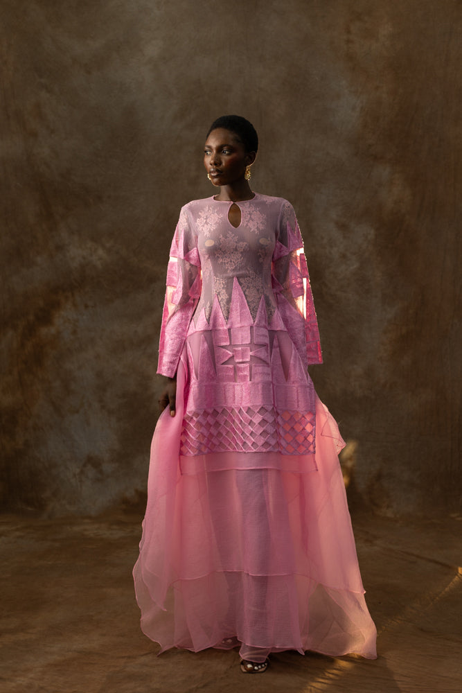 The Dija Deluxe Dress pairs chantilly lace and organza to create a shimmering, feminine maxi silhouette that embodies Odyssey’s poetic strength. Its fitted bodice and flowing layers balance richness and ease. Finish with neutral heels to softly elevate its pink palette.