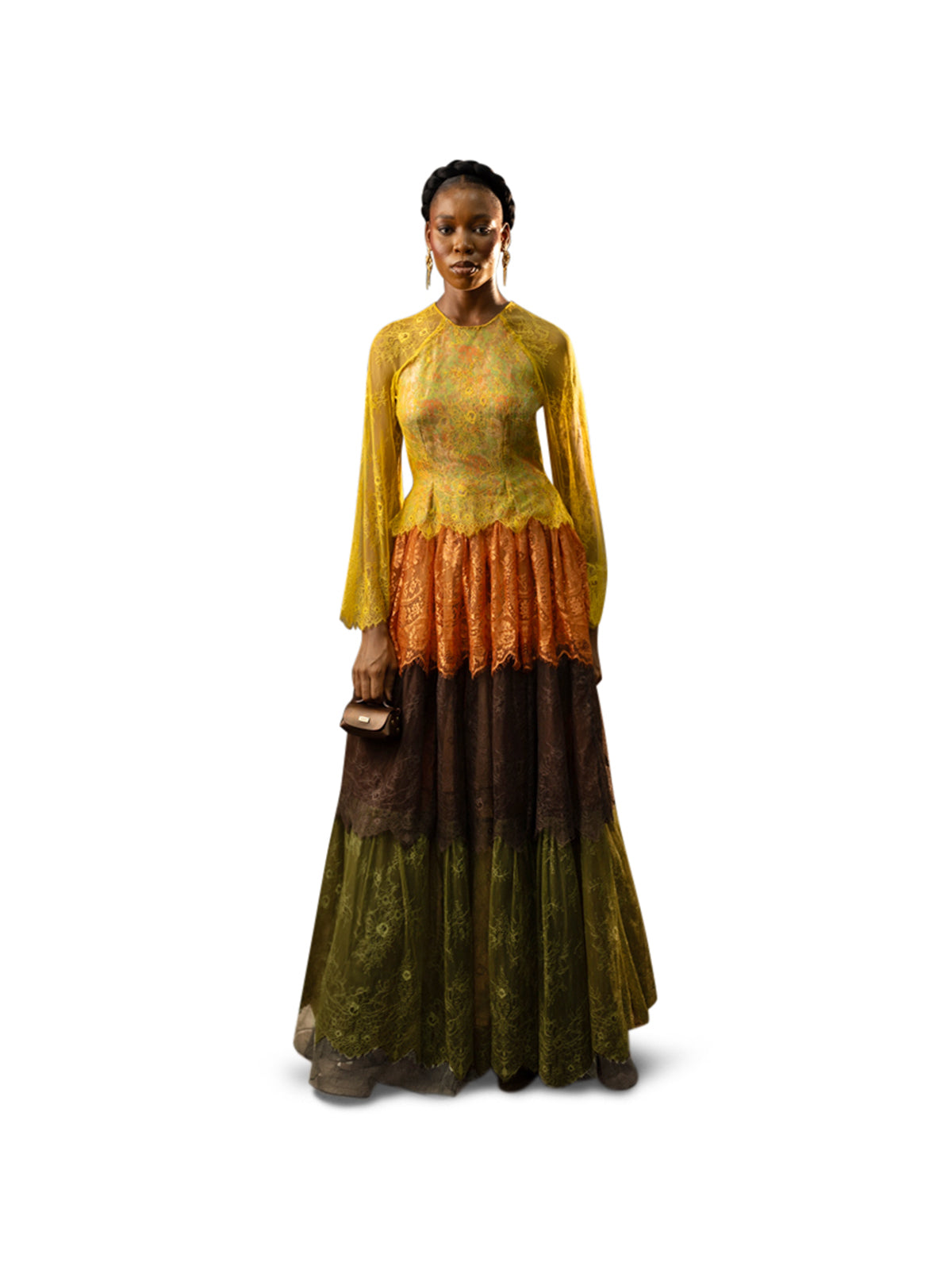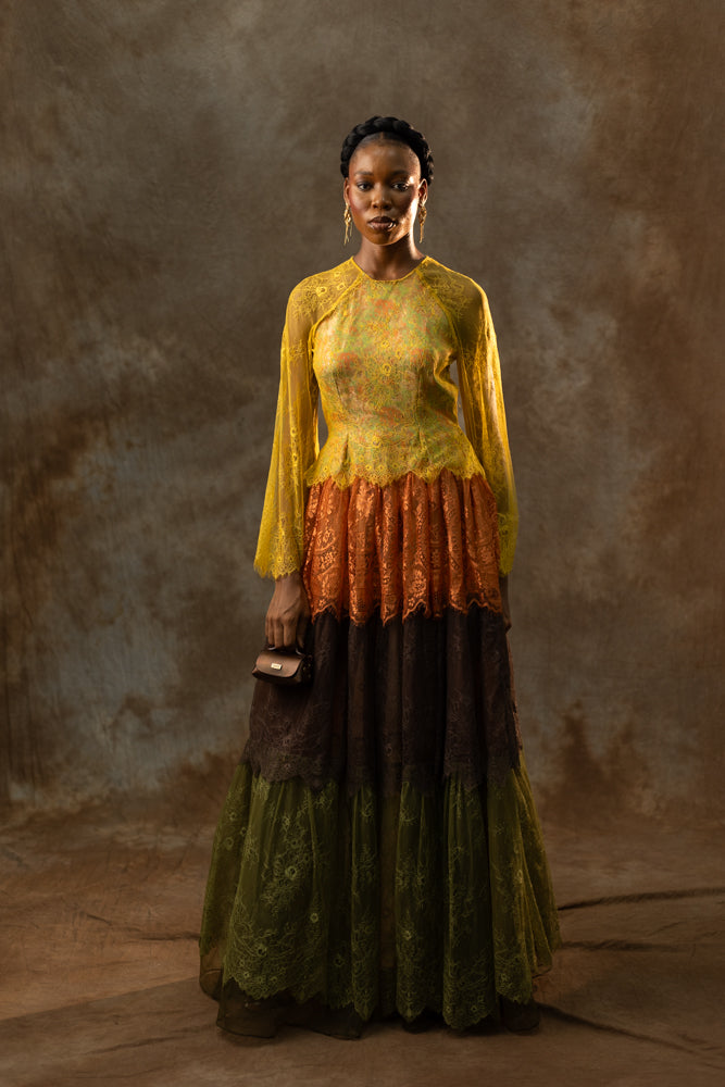 A multi-tonal lace composition gives the Emisara Dress its rich visual depth, framed by a fitted bodice and sweeping maxi length. The silhouette captures Odyssey’s interplay between softness and strength, offering movement without losing structure. Style with sleek heels or mixed-metal jewelry to enhance its dimensional palette.