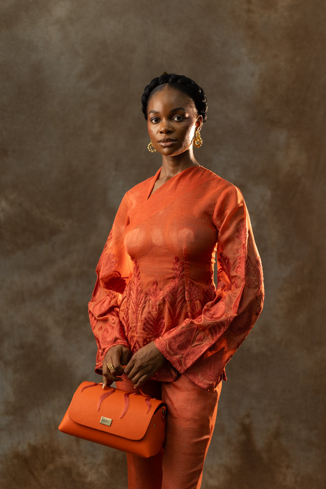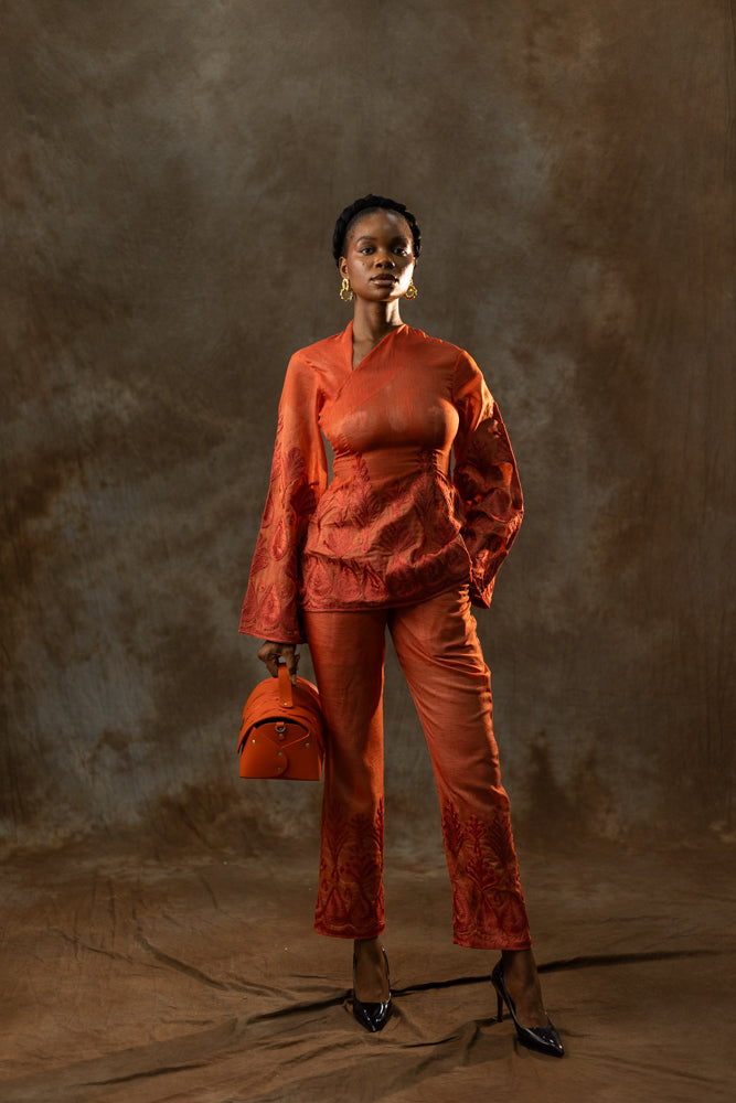 A vibrant ode to texture and movement, the Lume Set pairs a crisp top with tailored pants in warm orange cotton. Its fitted silhouette offers clean structure softened by subtle layering, reflecting Odyssey’s balance between grounded design and expressive color. Style with neutral sandals to let the vivid tone speak for itself.