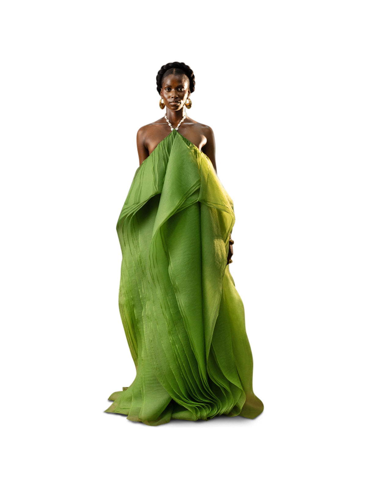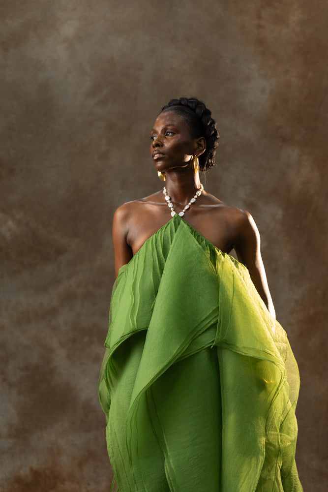 The Nafisatu Dress offers a fluid, statuesque silhouette shaped in luminous organza, echoing Odyssey’s celebration of intentional movement and quiet power. Its fitted bodice and flowing panels create a balanced contrast that flatters while maintaining softness. Complement it with gold-tone accessories to enhance its refined green palette.
