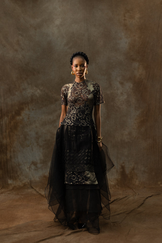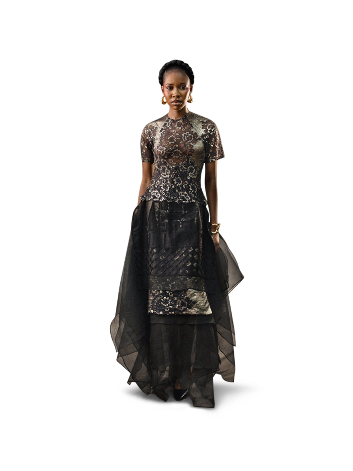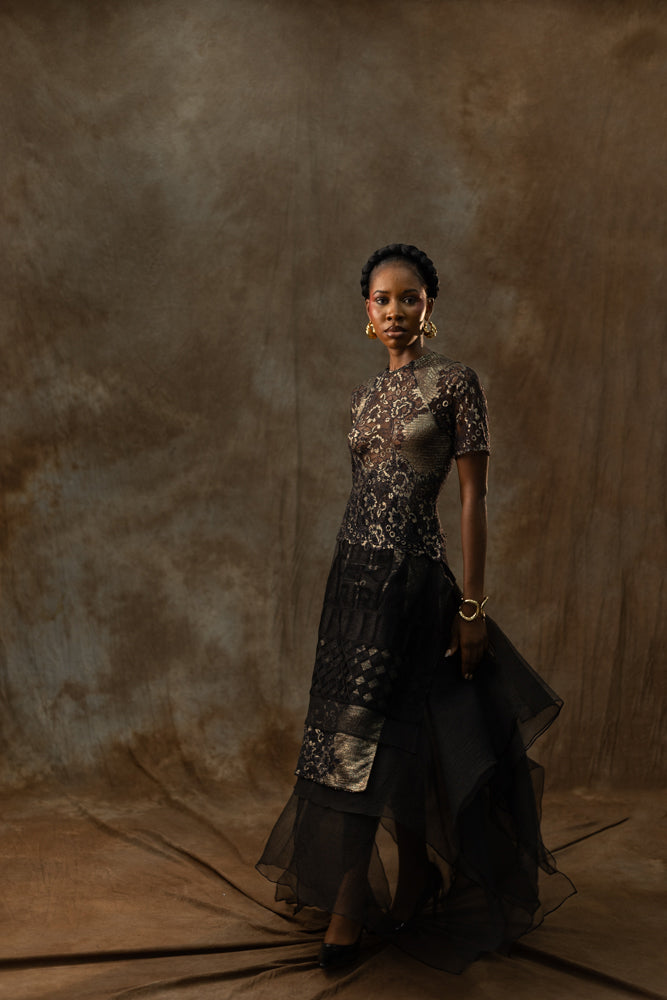 The Safina Dress blends the luminosity of metallic chantilly lace with the fluidity of organza, creating a statement silhouette that feels both bold and serene. Its fitted shape and layered texture embody Odyssey’s vision of elegance as a soft form of strength. Pair with heeled sandals to accentuate its sculptural movement.
