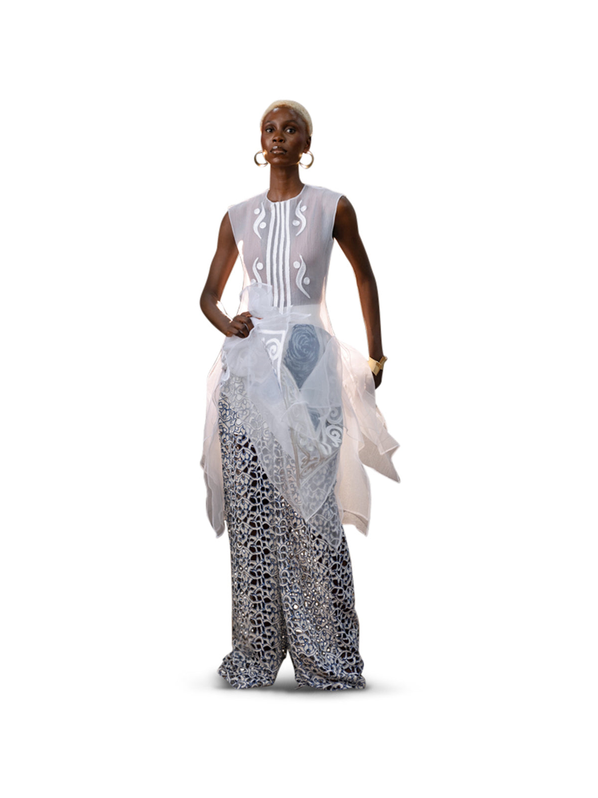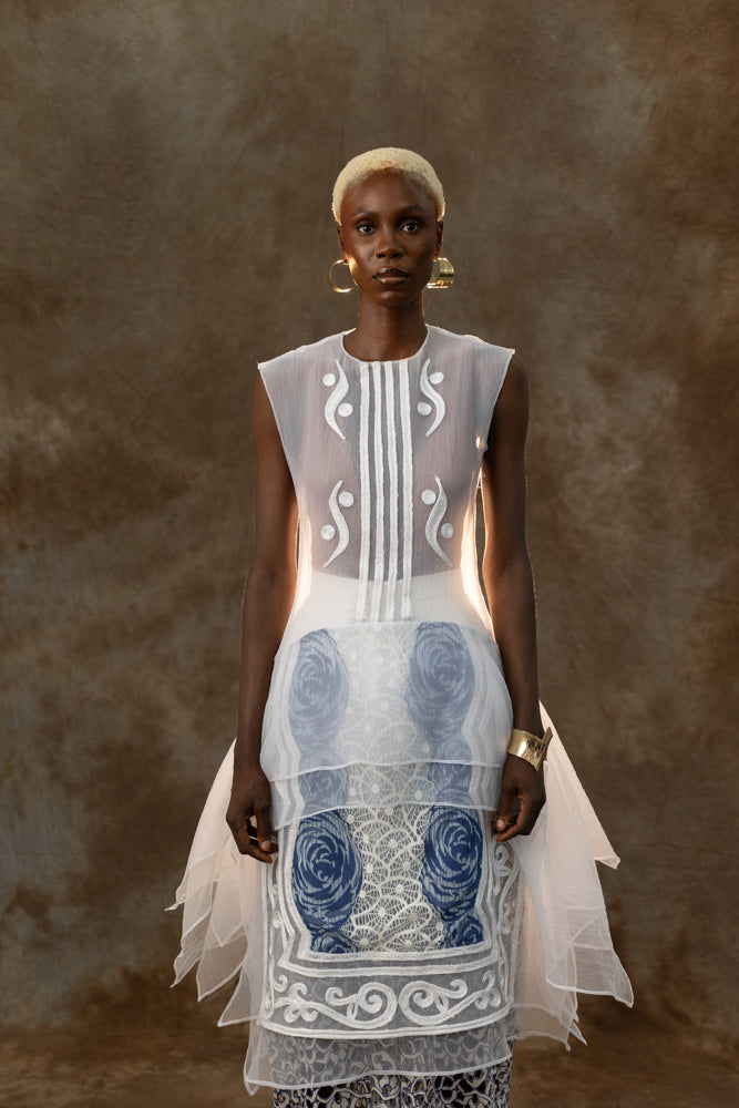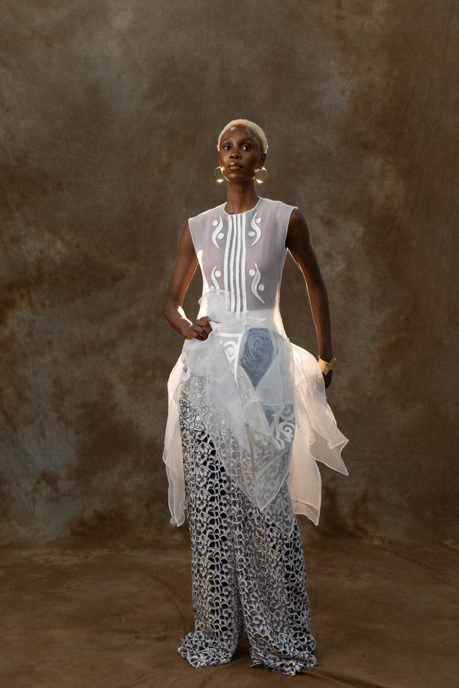 The Terra Dress & Eko Pants set brings together clean tailoring and soft organza–lace layering for a contemporary, sculptural look. Its midi-length dress and straight-leg trousers offer versatility while capturing Odyssey’s sense of intentional design. Style together for a statement ensemble or separate for endless wardrobe mileage.