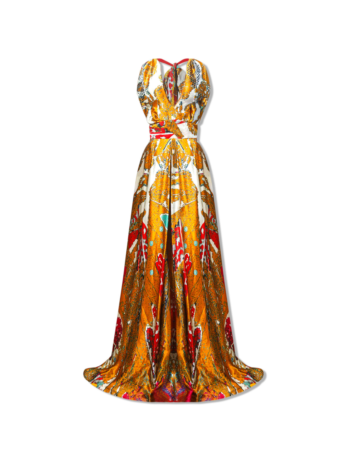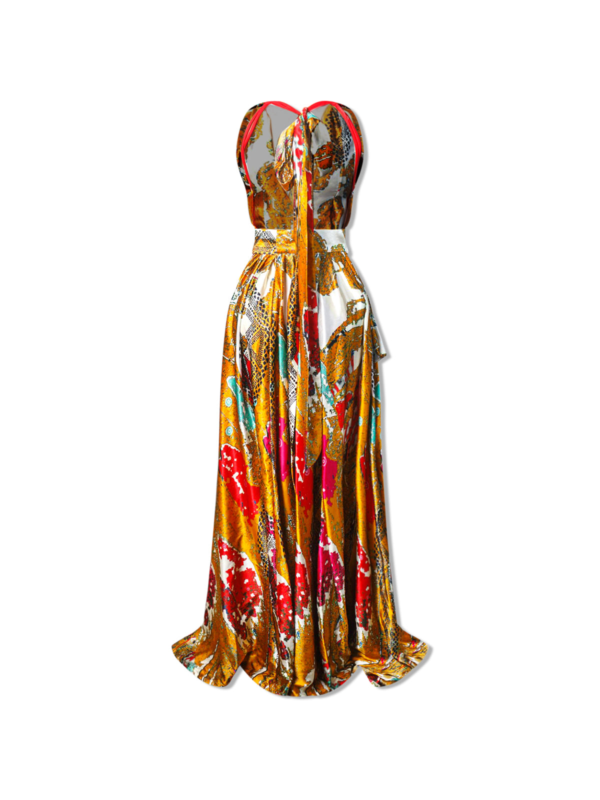 A gleaming celebration of legacy, the Golden Silk Dress by Eki Silk embodies effortless grace and quiet opulence. Designed with a flowing maxi silhouette, open back with tie detailing, and discreet side pockets, it radiates regal allure—especially when styled with bold jewelry and metallic sandals.