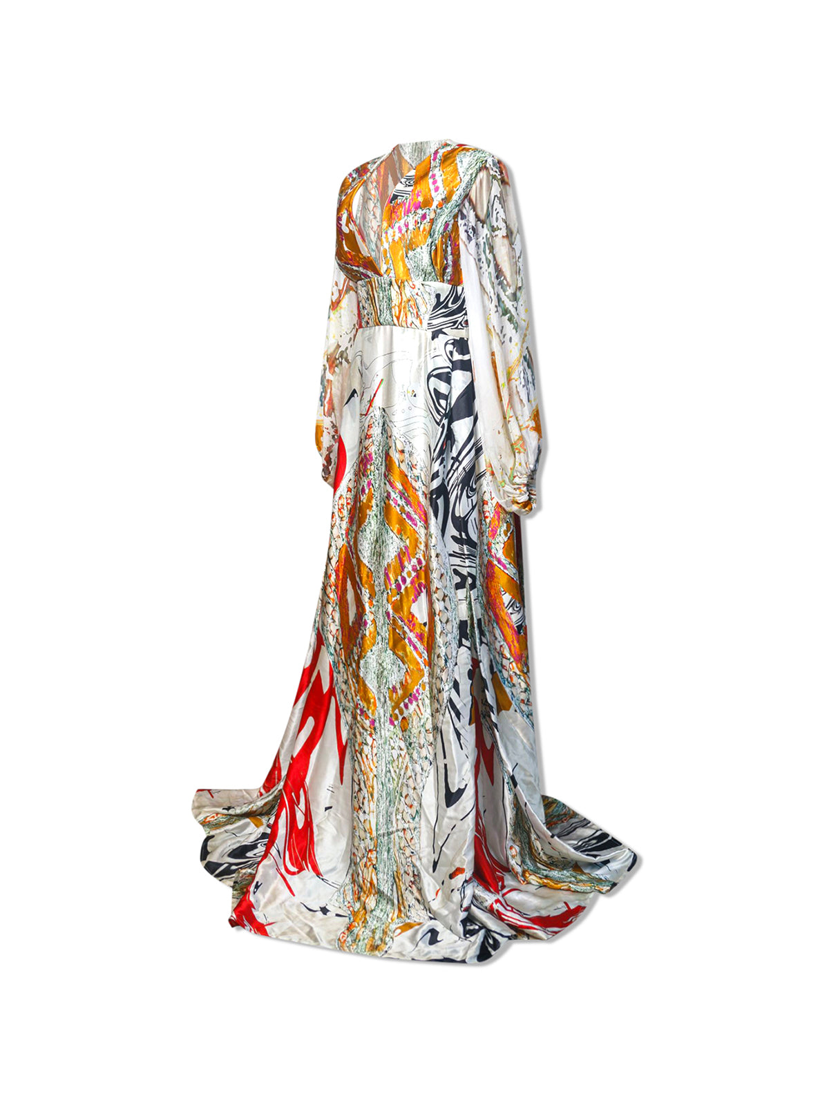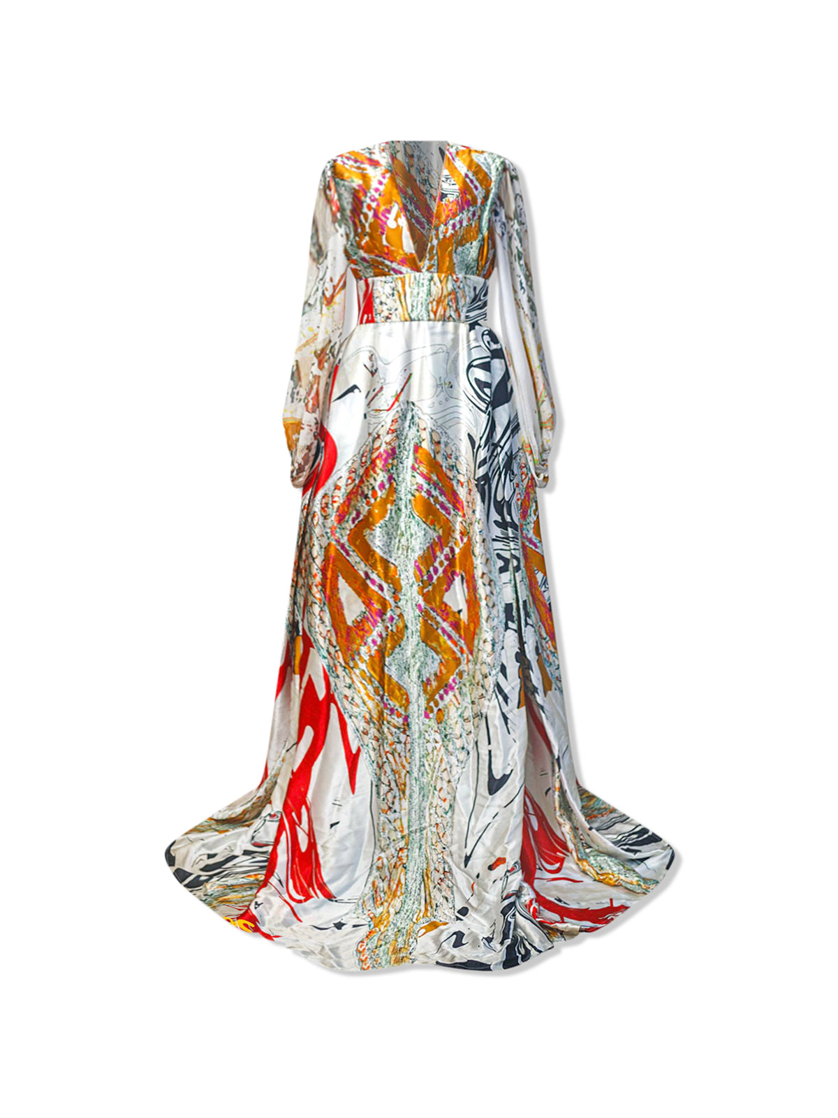 A regal evolution of Eki Silk’s storytelling, the Regal Silk Dress captures Edo grandeur through colour, print, and timeless tailoring. Featuring a long-sleeved, V-neck, maxi silhouette, this dress radiates a regal allure when styled with a bold necklace and metallic sandals.