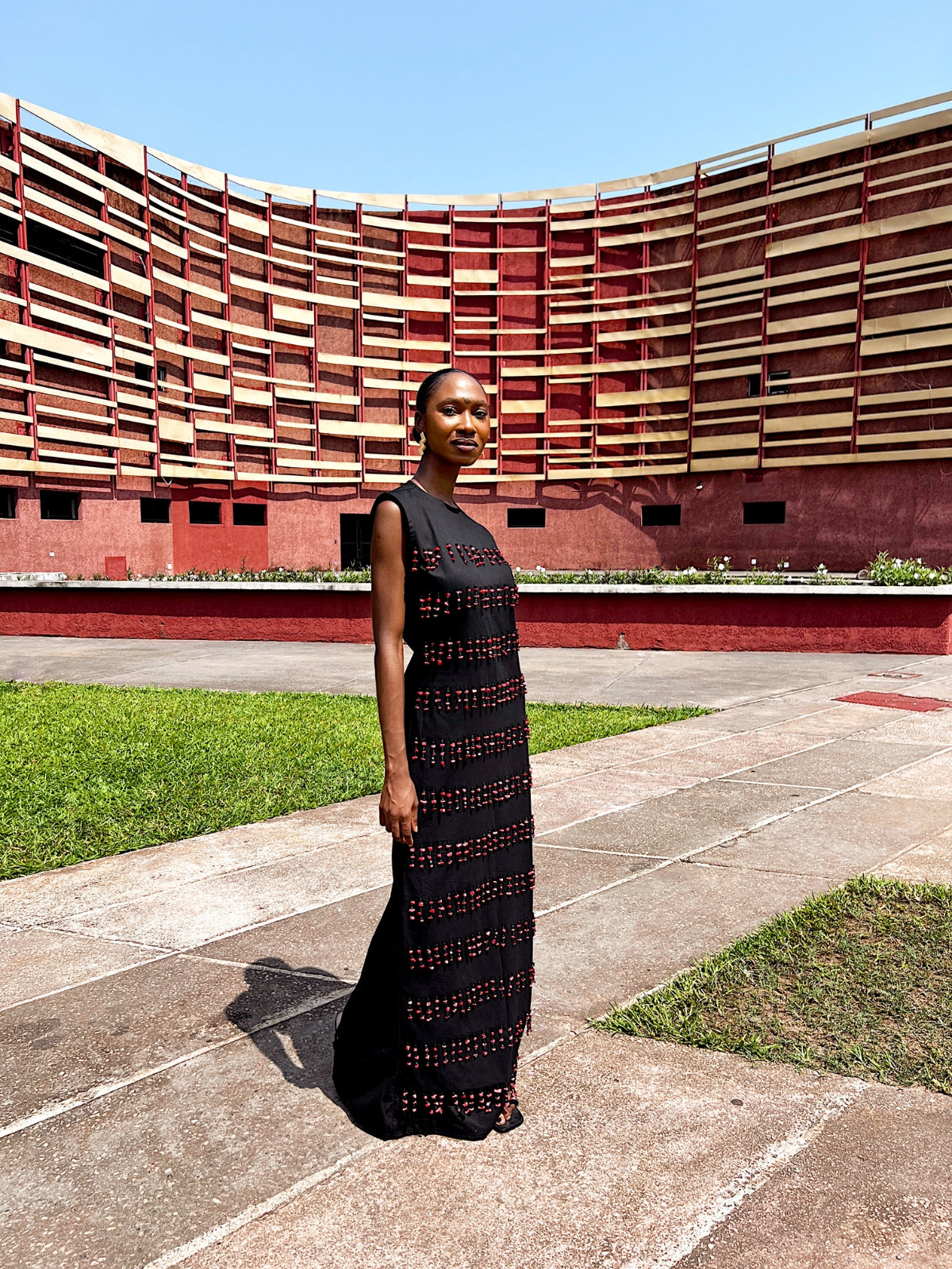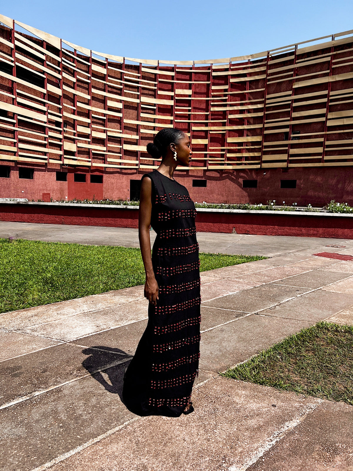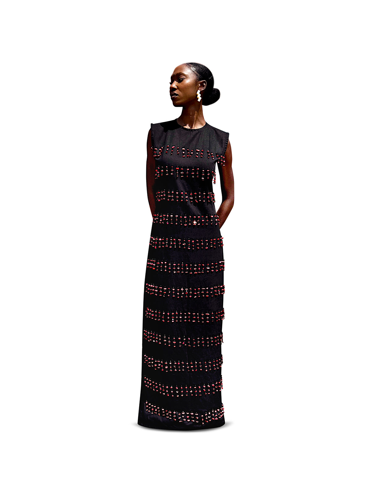Channeling heritage through craft, the Beaded Layered Dress does just this with the luminous beauty of natural coral and recycled glass beads, while every hand-sewn line captures both rhythm and reverence. This floor-length cotton dress has a back slit to allow for elegant movement. Pair with minimalist drop earrings and heels to highlight the intricate horizontal beadwork.