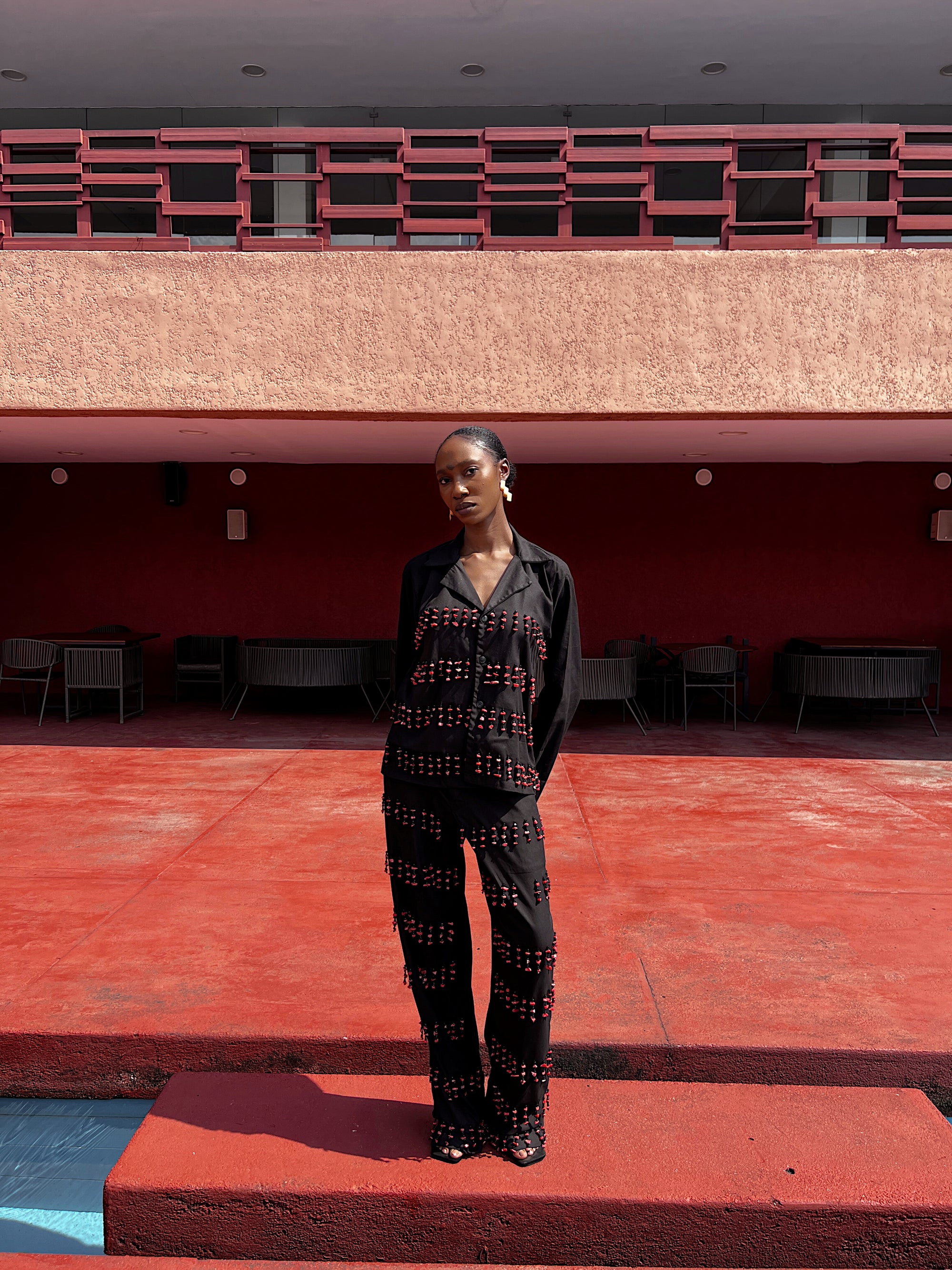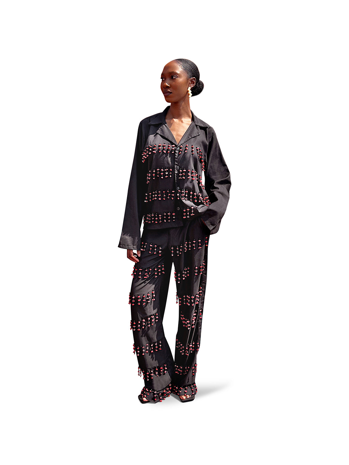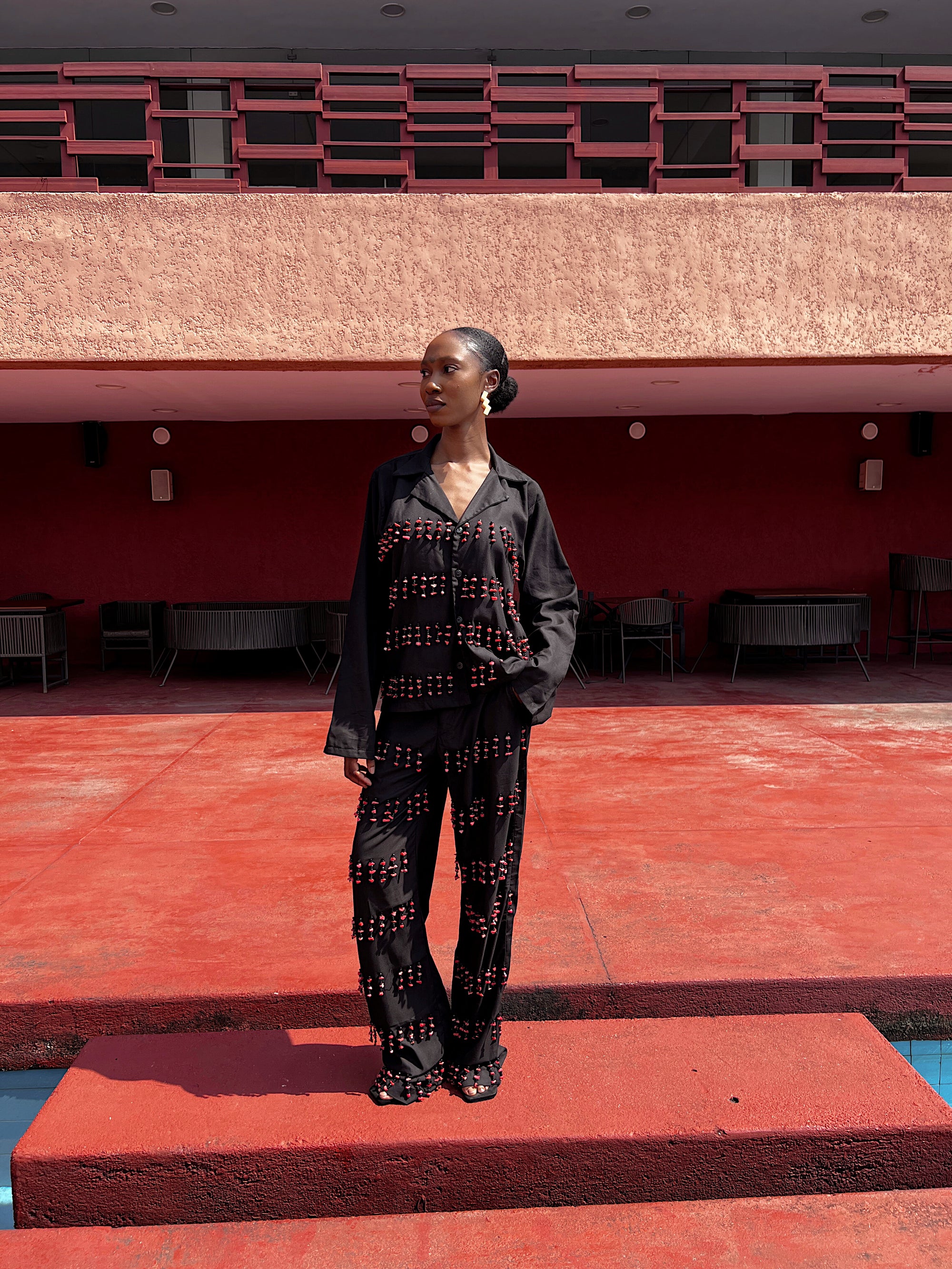 Modern tailoring meets embellishment in the Beaded Layered Set—an evolution of ESO by Liman’s signature linear language. Natural coral and recycled glass beads trace deliberate lines across the surface, creating structure through shimmer. Wear together for an elevated co-ord or separately for subtle sophistication.