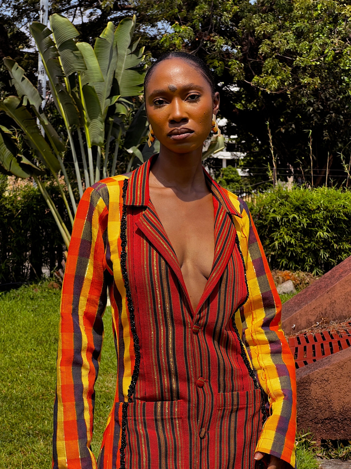 A study in contrast and craftsmanship, the Beaded Silhouette Coat sculpts curves through opposing patterns of Aso Oke. Clusters of glass beads are hand-sewn along the seam lines to trace the body’s natural form, creating a tactile map of artistry. Layer over a tonal slip or trousers for a refined, art-meets-couture statement.