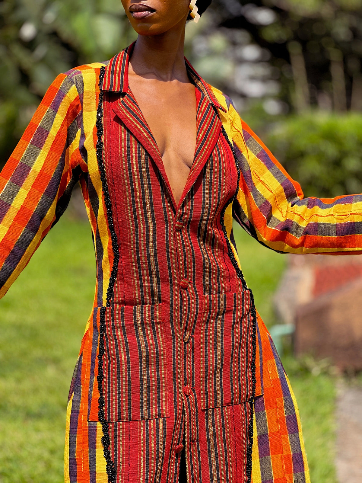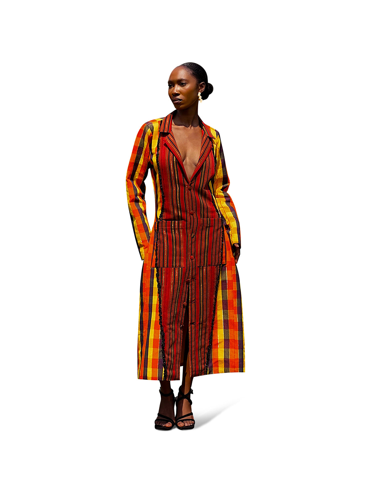 - Midi-length coat crafted from two contrasting Aso Oke weaves