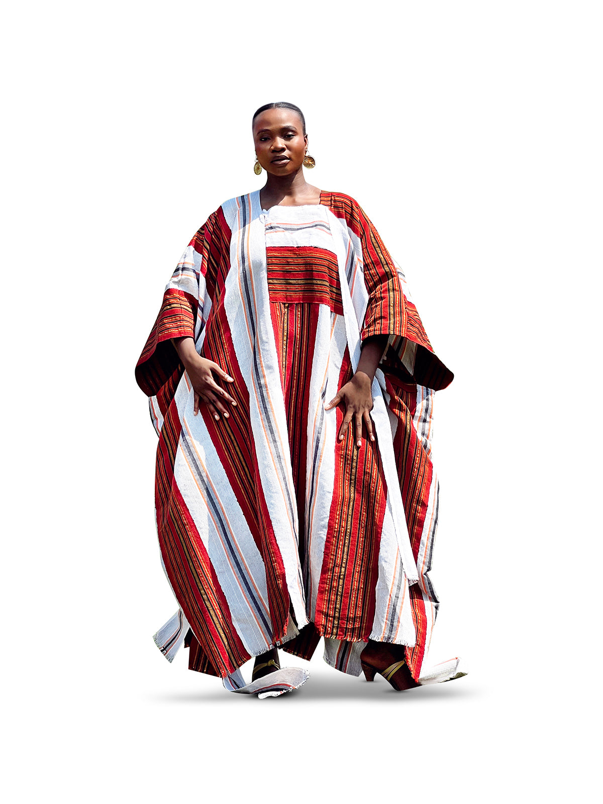 Reinterpreting tradition through modern craftsmanship, the Two-Tone Agbada merges classic Yoruba attire with contemporary geometry. Contrasting Aso Oke patterns create a striking interplay of texture and form. Wear with statement cuffs or stacked bangles to elevate the traditional form with modern polish.