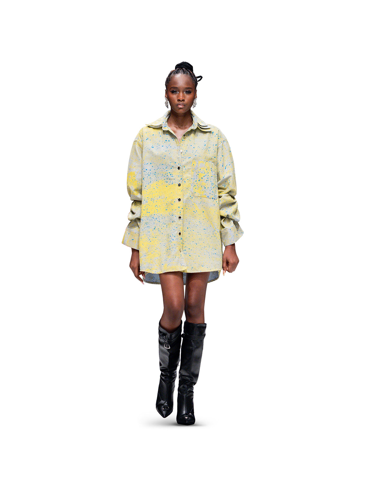 Expressive and relaxed, the Oversized Paint Splatter Denim Shirt Dress embodies FIA’s artistic experimentation. The voluminous cut features exaggerated sleeves, a triple collar, and bold hand-painted splatter motifs, each one unique to the artisan’s hand. Wear as a dress or layered over trousers for directional ease.