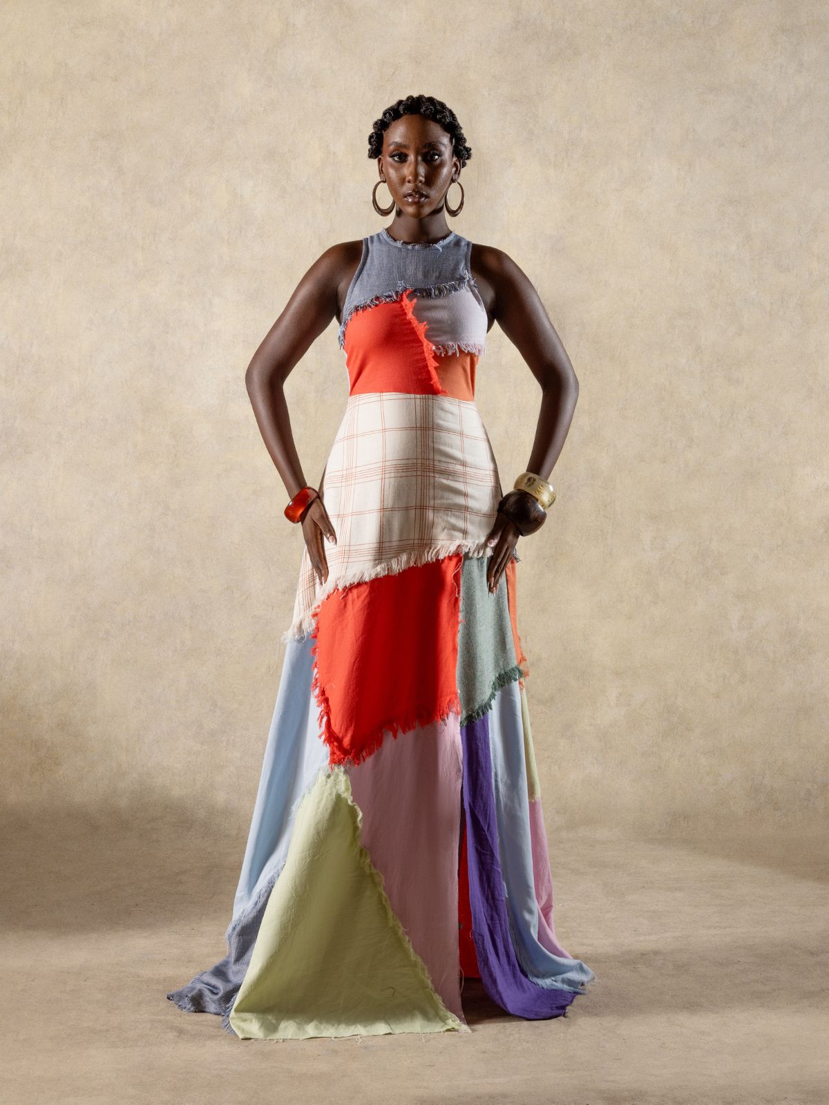 A tactile study in texture, the Shredded Patch Maxi Dress showcases FIA’s signature hand-shredding technique. The sleeveless silhouette features a fitted bodice, flared hem, and thigh-high slit, all crafted from mixed fabrics with tonal shredding that lends organic movement. Each dress is a one-of-a-kind expression of artistry and modern femininity. Pair with sculptural heels for a bold, textural statement.