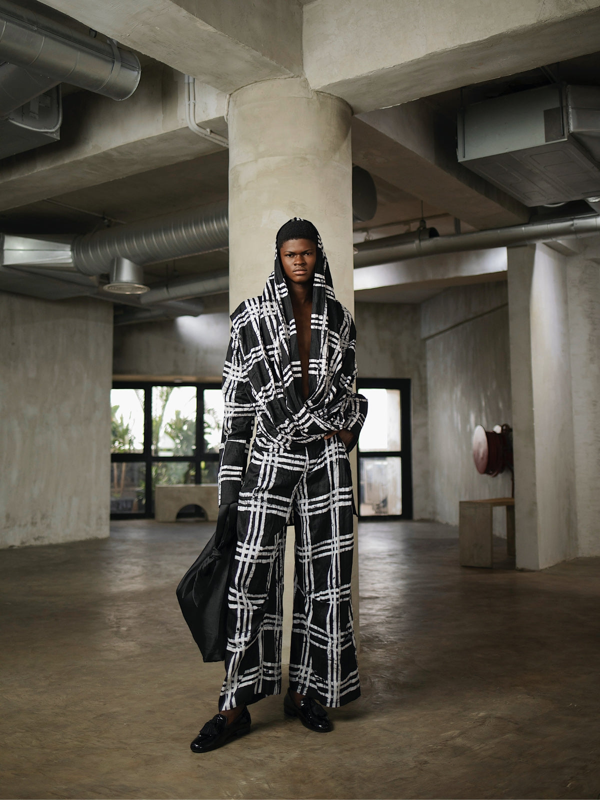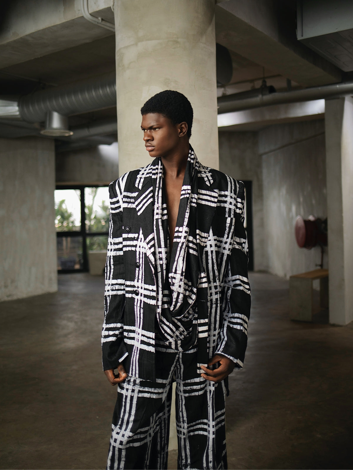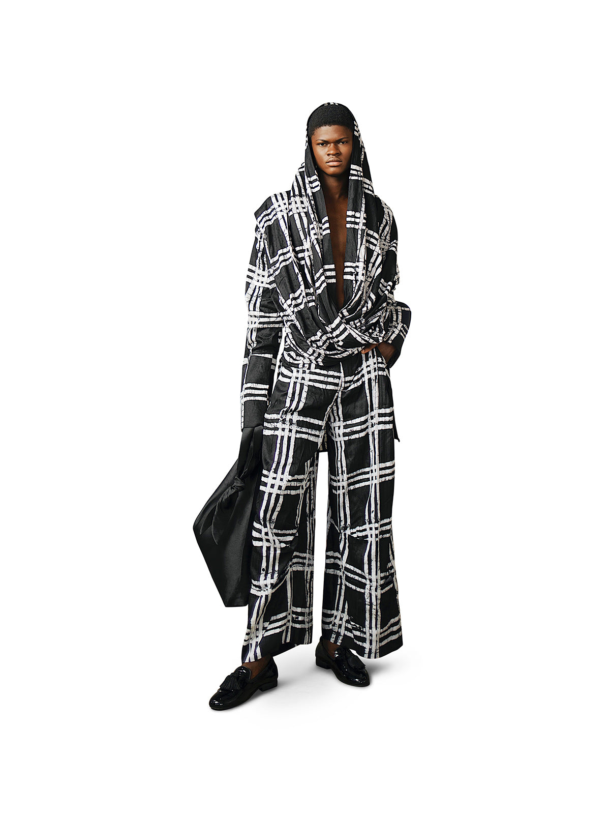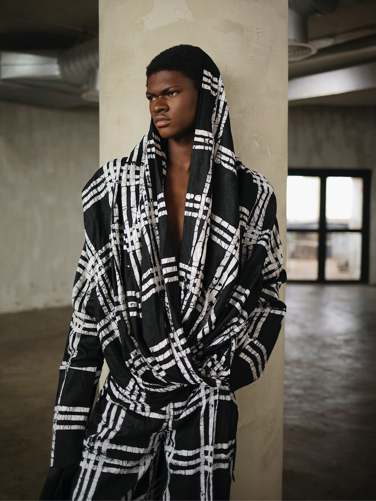 Fruché’s Capuchon Shirt is crafted from Adire cotton, hand-dyed to create a custom tartan pattern in a monochrome palette. The relaxed silhouette is gathered into a twist at the waist and artfully draped to form a built-in hood, adding visual intrigue. To ensure maximum impact, style yours with the matching Corsaire Pants for a head-to-toe fit.