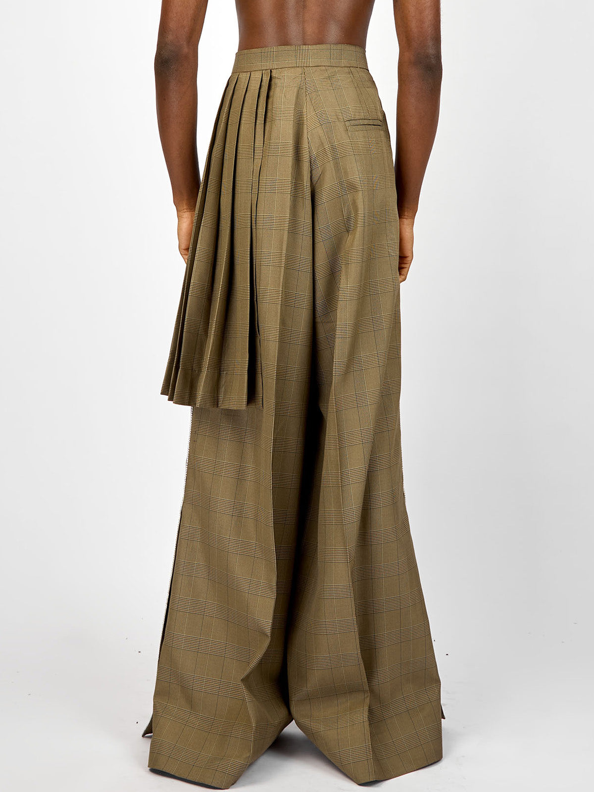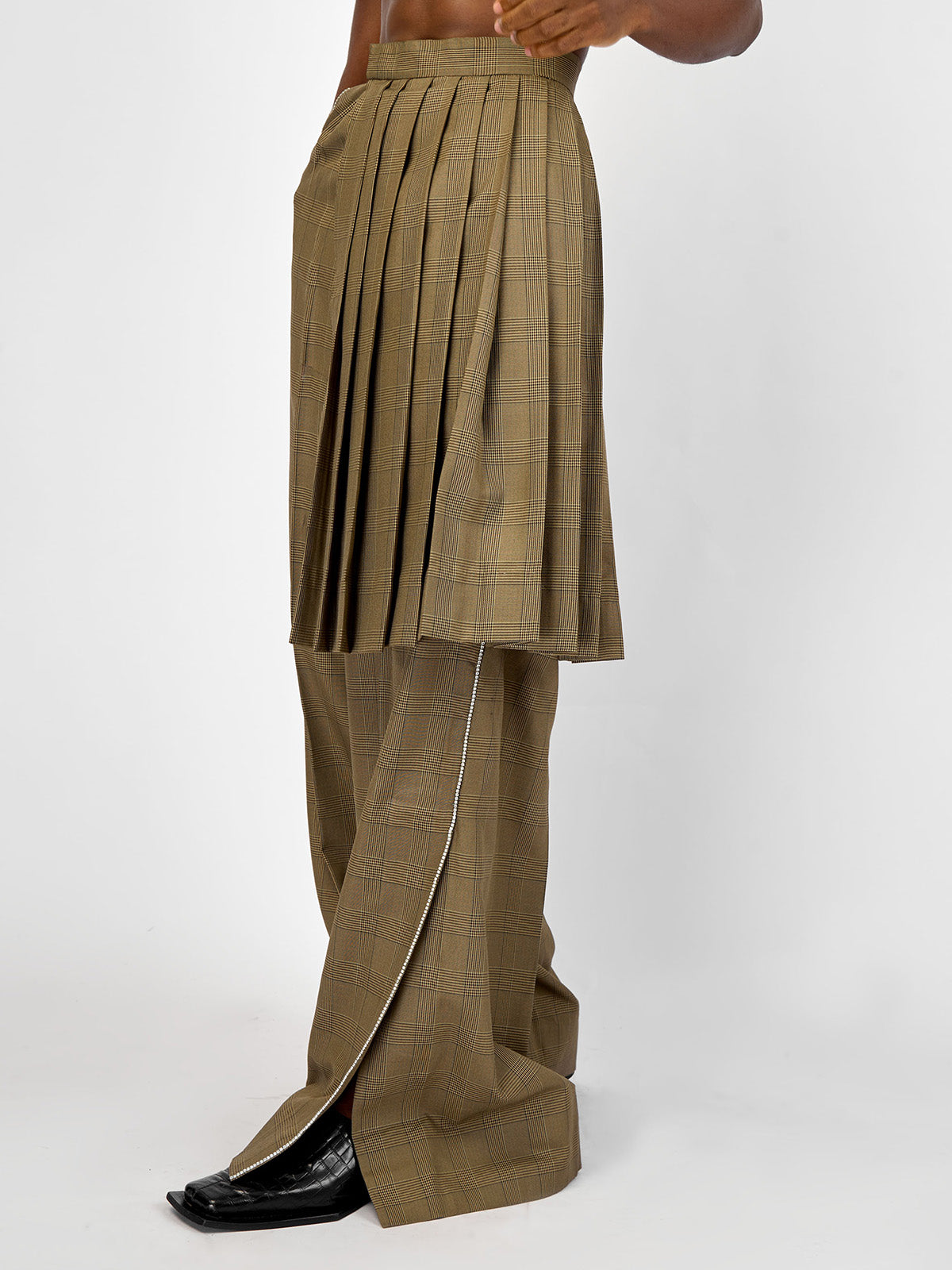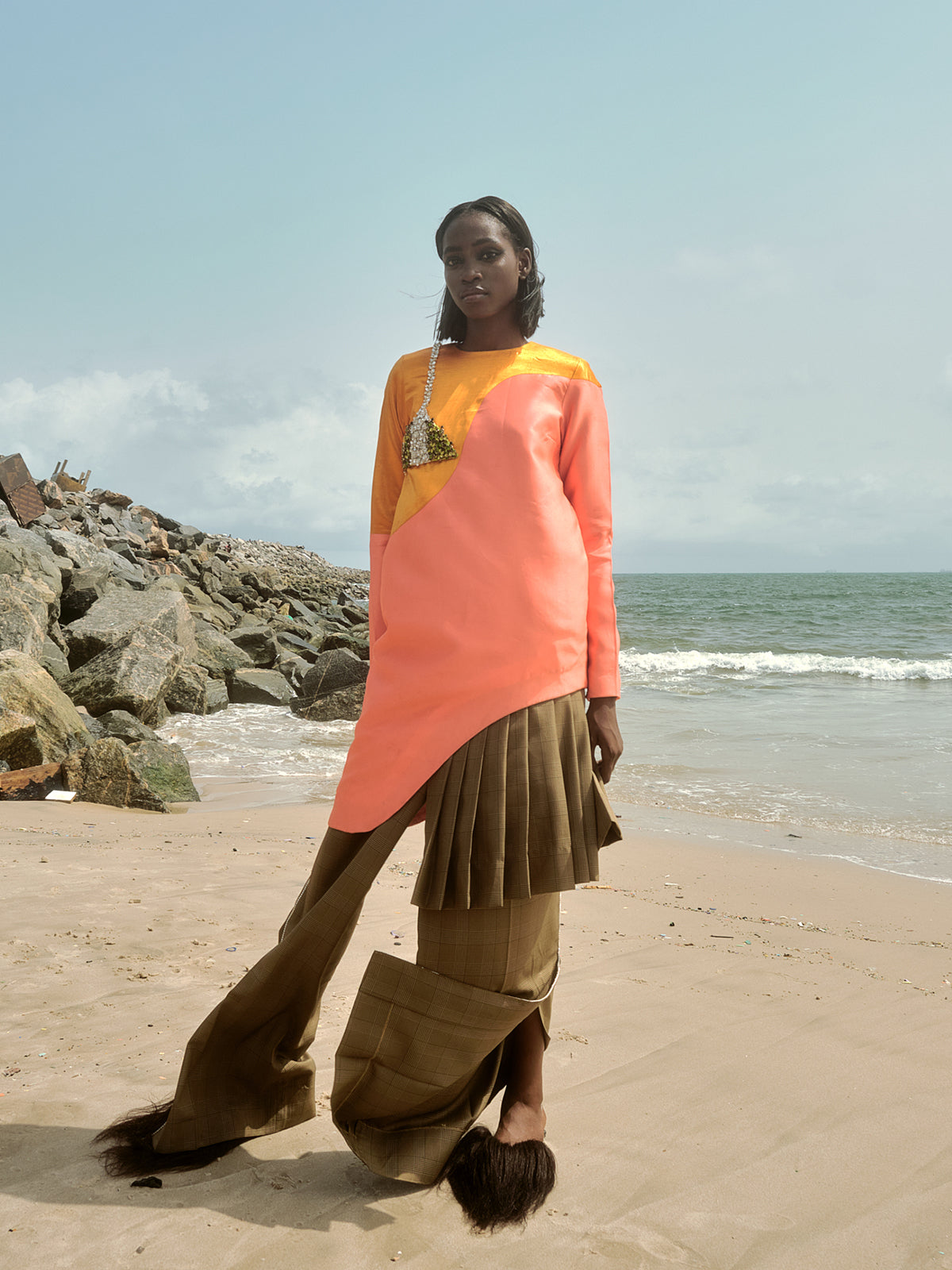 Fruché’s creations are interwoven with stories of Nigerian heritage and culture, and the latest See Finish collection is no exception. Cut from responsibly-sourced wool, these pants take an innovative approach to tailoring. The relaxed flared silhouette is detailed along the side pocket with hand-sewn rhinestones and overlaid with a pleated half skirt. The split hems look great with chunky sandals or loafers.