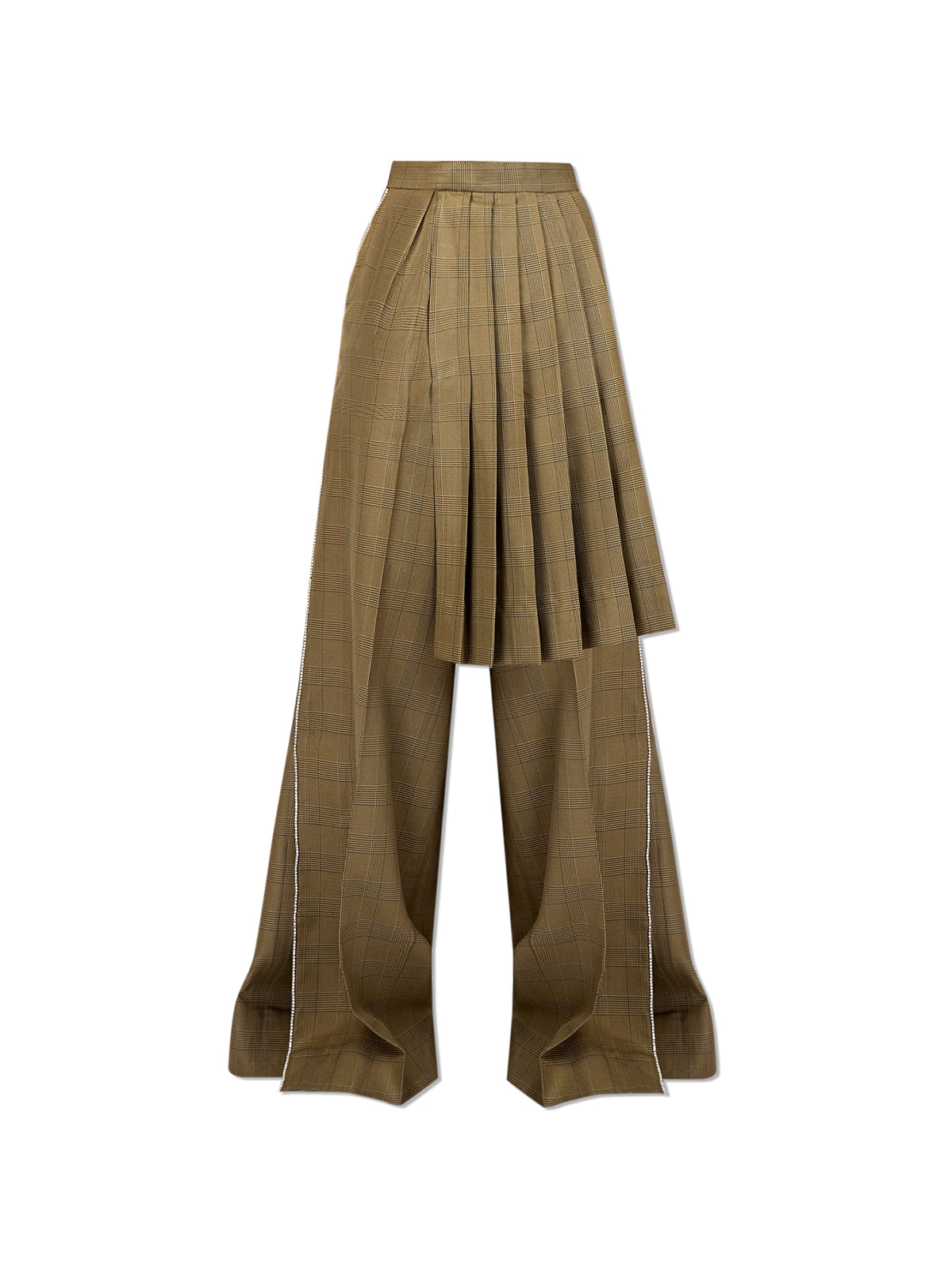 - High waist, flared legs, pleated half skirt, side slits at the hems, rhinestone detailing, zip fastening